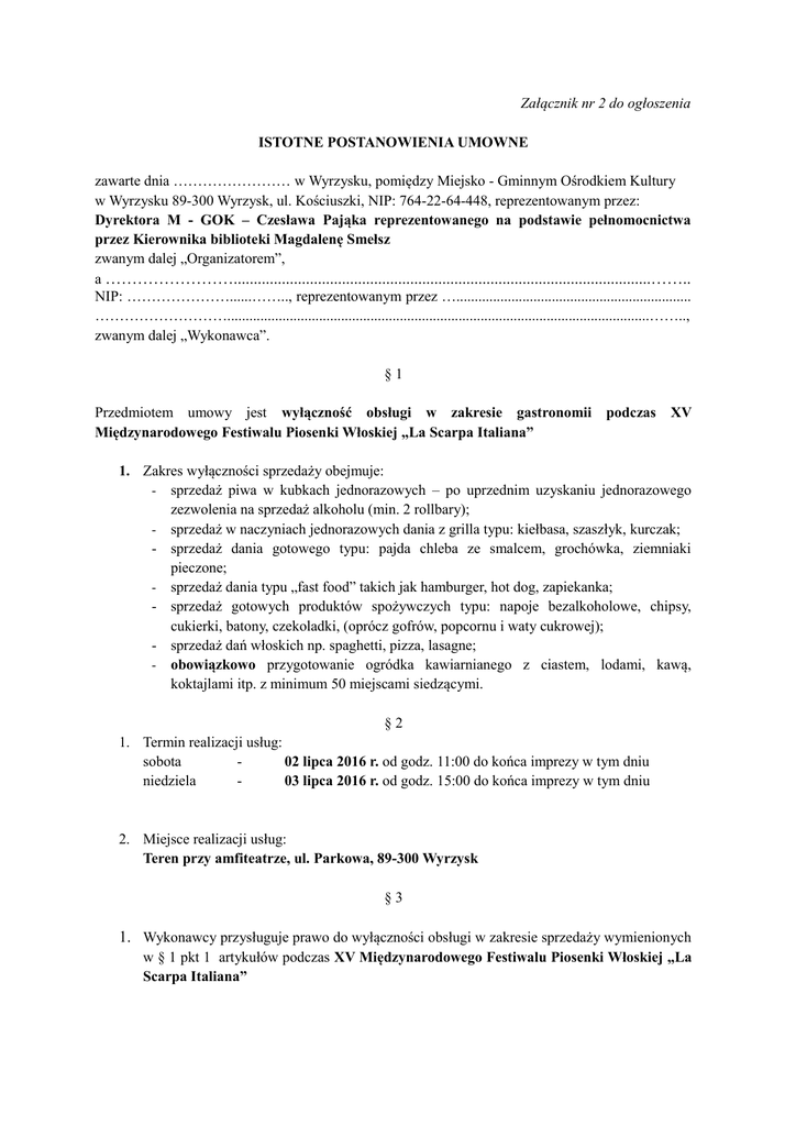 Załącznik nr 2 do ogłoszenia ISTOTNE POSTANOWIENIA UMOWNE zawarte dnia …………………… w Wyrzysku, pomiędzy Miejsko - Gminnym Ośrodkiem Kultury w Wyrzysku 89-300 Wyrzysk, ul. Kościuszki, NIP: 764-22-64-448, reprezentowanym przez: Dyrektora M - GOK – Czesława Pająka reprezentowanego na podstawie pełnomocnictwa przez Kierownika biblioteki Magdalenę Smełsz zwanym dalej „Organizatorem”, a ……………………........................................................................................................…….. NIP: …………………......…….., reprezentowanym przez …................................................................ ………………………...................................................................................................................…….., zwanym dalej „Wykonawca”. §1 Przedmiotem umowy jest wyłączność obsługi w zakresie gastronomii podczas XV Międzynarodowego Festiwalu Piosenki Włoskiej „La Scarpa Italiana” 1. Zakres wyłączności sprzedaży obejmuje: - sprzedaż piwa w kubkach jednorazowych – po uprzednim uzyskaniu jednorazowego zezwolenia na sprzedaż alkoholu (min. 2 rollbary); - sprzedaż w naczyniach jednorazowych dania z grilla typu: kiełbasa, szaszłyk, kurczak; - sprzedaż dania gotowego typu: pajda chleba ze smalcem, grochówka, ziemniaki pieczone; - sprzedaż dania typu „fast food” takich jak hamburger, hot dog, zapiekanka; - sprzedaż gotowych produktów spożywczych typu: napoje bezalkoholowe, chipsy, cukierki, batony, czekoladki, (oprócz gofrów, popcornu i waty cukrowej); - sprzedaż dań włoskich np. spaghetti, pizza, lasagne; - obowiązkowo przygotowanie ogródka kawiarnianego z ciastem, lodami, kawą, koktajlami itp. z minimum 50 miejscami siedzącymi. §2 1. Termin realizacji usług: sobota 02 lipca 2016 r. od godz. 11:00 do końca imprezy w tym dniu niedziela 03 lipca 2016 r. od godz. 15:00 do końca imprezy w tym dniu 2. Miejsce realizacji usług: Teren przy amfiteatrze, ul. Parkowa, 89-300 Wyrzysk §3 1. Wykonawcy przysługuje prawo do wyłączności obsługi w zakresie sprzedaży wymienionych w § 1 pkt 1 artykułów podczas XV Międzynarodowego Festiwalu Piosenki Włoskiej „La Scarpa Italiana” 2. Wykonawca przyjmuje do wiadomości, że wyłączność na sprzedaż produktów gastronomicznych nie obejmuje gofrów, popcornu i waty cukrowej, które mogą być sprzedawane przez inne podmioty. §4 Zakres obowiązków Wykonawcy 1. Wykonawca zobowiązuje się do sprzedaży i dystrybucji produktów wymienionych w § 1 pkt 1 w czasie trwania imprezy. 2. Wykonawca zobowiązuje się do sprzedaży i dystrybucji tylko świeżych produktów oraz obsługi na wysokim poziomie tzn. zgodnie z zasadami w tym zakresie obowiązującymi (dotyczy to w szczególności kultury osobistej obsługi). 3. Dostarczony przez Wykonawcę sprzęt musi być sprawny technicznie i estetyczny. 4. Wykonawca zobowiązuje się do zachowania czystości obszaru objętego wyłącznością podczas trwania imprezy oraz posprzątania tego terenu po zakończeniu imprezy. 5. Wykonawca jest zobowiązany do wyposażenia swoich stoisk w zakresie przepisów przeciw pożarowych (wyposażenie w gaśnice). 6. Wykonawca jest zobowiązany do uiszczenia opłaty za dzierżawę powierzchni położonych na terenie Gminy Wyrzysk związanej z prowadzeniem działalności handlowej w czasie imprez kulturalnych i sportowo-rekreacyjnych określonej zarządzeniem Burmistrza Wyrzyska nr 65 z dnia 5 maja 2014 r. 7. Ceny sprzedawanych przez Wykonawcę podczas imprezy produktów oraz usług ustala Wykonawca na własną odpowiedzialność i ryzyko. 8. Wykonawca jest zobowiązany do przekazania na rzecz Organizatora przetargu 400 szt. darmowych bonów (200 bonów na żywność: dania gorące, np. kiełbasa, bigos plus dwie kromki chleba plus ketchup lub musztarda w standardowych porcjach w jakich sprzedawać je będzie oferent nie mniejszych niż 20dag oraz 200 na napoje typu piwo lub napoje bezalkoholowe wg wyboru organizatora przetargu min. 0,33l) - z tego tytułu oferent nie otrzymuje od organizatora przetargu wynagrodzenia i nie może wnosić żadnych roszczeń. Nie dopuszcza się możliwości dopłat do bonów. 9. Wykonawca odpowiada za przestrzeganie porządku, przepisów bhp, p. poż. oraz sanitarnoepidemiologicznych w czasie trwania imprezy – określonym w § 2 pkt 1. §5 Zakres obowiązków organizatora 1. Organizator oświadcza, iż posiada wyłączne prawo do organizacji i przeprowadzenia imprezy oraz prawo do dysponowania terenem przy amfiteatrze w Wyrzysku, ul. Parkowa na czas trwania imprezy. 2. Organizator zapewni w trakcie trwania imprezy występy artystyczne na scenie oraz inne atrakcje odbywające się na terenie imprezy. 3. Organizator zapewni profesjonalną ochronę podczas trwania imprezy. 4. Organizator nie zapewnia ochrony terenu ze stoiskami gastronomicznymi (terenu objętego wyłącznością). 5. Organizator zapewni dostęp do WC typu TOI-TOI. 6. Organizator nie ponosi odpowiedzialności za szkody w mieniu Wykonawcy oraz osób którymi Wykonawca się posługuje przy wykonaniu umowy zawartej z Organizatorem wyrządzonych przez: uczestników imprezy, służby ratownicze, przez siły natury. 7. Organizator nie ponosi odpowiedzialności za odwołanie imprezy z przyczyn od niego niezależnych (klęski żywiołowe, żałoba narodowa). §6 Za wyłączność obsługi w zakresie handlu i gastronomii podczas XV Międzynarodowego Festiwalu Piosenki Włoskiej „La Scarpa Italiana” Wykonawca zapłaci Organizatorowi wynagrodzenie w wysokości: …....................…….. zł brutto (słownie …….....................................………………….. zł brutto) do dnia 25.06.2016 r. Wynagrodzenie, o którym mowa powyżej płatne będzie przelewem na konto Organizatora. Za dzień zapłaty strony umowy ustalają dzień obciążenia rachunku bankowego §7 Ewentualne spory wynikłe z realizacji niniejsze