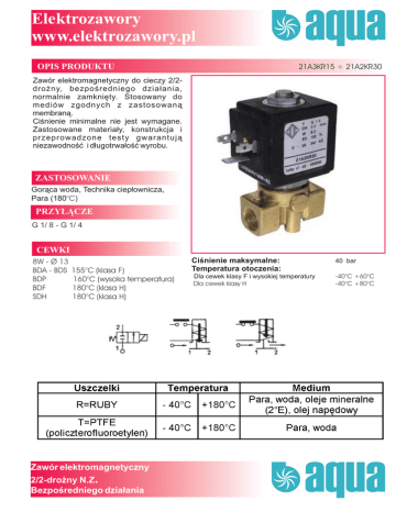 Elektrozawory www.elektrozawory.pl OPIS PRODUKTU 21A3KR15 ÷ 21A2KR30 Zawór elektromagnetyczny do cieczy 2/2dro¿ny, bezpoœredniego dzia³ania, normalnie zamkniêty. Stosowany do mediów zgodnych z zastosowan¹ membran¹. Ciœnienie minimalne nie jest wymagane. Zastosowane materia³y, konstrukcja i przeprowadzone testy gwarantuj¹ niezawodnoœæ i d³ugotrwa³oœæ wyrobu. ZASTOSOWANIE Gor¹ca woda, Technika ciep³ownicza, Para (180°C) PRZY£¥CZE G 1/ 8 - G 1/ 4 CEWKI 8W - Ø 13 BDA - BDS BDP BDF SDH 155°C (klasa F) 160°C (wysoka temperatura) 180°C (klasa H) 180°C (klasa H) Zawór elektromagnetyczny 2/2-dro¿ny N.Z. Bezpoœredniego dzia³ania Ciœnienie maksymalne: Temperatura otoczenia: 40 bar Dla cewek klasy F i wysokiej temperatury Dla cewek klasy H -40°C +60°C -40°C +80°C Zawór elektromagnetyczny 2/2-dro¿ny N.Z. Bezpoœredniego dzia³ania Dla innego rodzaju uszczelnienia ni¿ RUBY proszê wpisaæ w miejsce „R” symbol wybranej innej membrany np. 21A3KT15 . Uwaga: Dostêpne równie¿ z mosiê¿nym korpusem bez o³owiu. U¿ycie sztywnych uszczelnieñ zwykle wymaga wolnego przep³ywu ograniczonego 2scc/min pod ciœnieniem 1 bar. MATERIA£Y Korpus Tuleja Wzmocnienie trzpienia Trzpieñ Pierœcieñ fazowy Sprê¿yna Uszczelnienia Gniazdo ruchome Na ¿yczenie: Konektor Konektor zgodnoœæ z CECHY mosi¹dz - UNI EN 12165 CW617N stal nierdzewna AISI seria 300 stal nierdzewna AISI seria 400 stal nierdzewna AISI seria 400 miedŸ stal nierdzewna AISI seria 300 R=RUBY Na ¿yczenie: T=PTFE stal nierdzewna AISI seria 300 Pg 9 lub Pg 11 ISO 4400 CZÊŒCI ZAMIENNE 1. Cewka: 2. Trzpieñ: 3. Tuleja: Zawór elektromagnetyczny 2/2-dro¿ny N.Z. Bezpoœredniego dzia³ania wg wykazu cewek Art. Nr R450820/R Art. Nr R450606 Zgodnoœæ elektryczna: IEC 335 Poziom ochrony: IP 65 EN 60529 (DIN 40050) z konektorem. ZESTAW KT130KR30-A=2+3 Zawór elektromagnetyczny 2/2-dro¿ny N.Z. Bezpoœredniego dzia³ania WYMIARY AQUA Sp. z o.o. www.aqua.net.pl - e-mail: [email protected] o/Gorzów Wlkp. tel.: 095 720 67 20 ph/Gorzów Wlkp. tel.: 095 728 17 20 o/Legnica tel.: 095 862 94 20 o/Wa³cz tel.: 067 387 01 00 o/Wroc³aw tel.: 071 341 94 67 o/Zielona Góra tel.: 068 324 08 98 ph/Wolsztyn tel.: 068 347 16 26