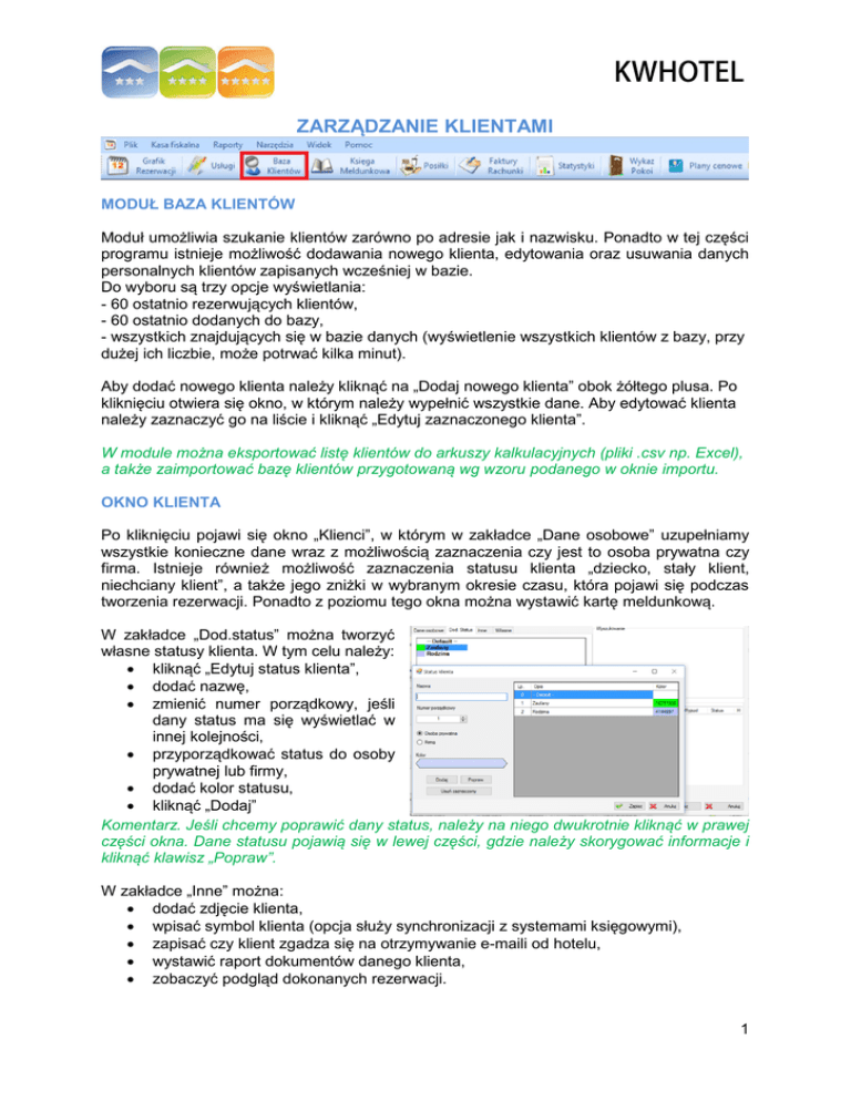 ZARZĄDZANIE KLIENTAMI MODUŁ BAZA KLIENTÓW Moduł umożliwia szukanie klientów zarówno po adresie jak i nazwisku. Ponadto w tej części programu istnieje możliwość dodawania nowego klienta, edytowania oraz usuwania danych personalnych klientów zapisanych wcześniej w bazie. Do wyboru są trzy opcje wyświetlania: - 60 ostatnio rezerwujących klientów, - 60 ostatnio dodanych do bazy, - wszystkich znajdujących się w bazie danych (wyświetlenie wszystkich klientów z bazy, przy dużej ich liczbie, może potrwać kilka minut). Aby dodać nowego klienta należy kliknąć na „Dodaj nowego klienta” obok żółtego plusa. Po kliknięciu otwiera się okno, w którym należy wypełnić wszystkie dane. Aby edytować klienta należy zaznaczyć go na liście i kliknąć „Edytuj zaznaczonego klienta”. W module można eksportować listę klientów do arkuszy kalkulacyjnych (pliki .csv np. Excel), a także zaimportować bazę klientów przygotowaną wg wzoru podanego w oknie importu. OKNO KLIENTA Po kliknięciu pojawi się okno „Klienci”, w którym w zakładce „Dane osobowe” uzupełniamy wszystkie konieczne dane wraz z możliwością zaznaczenia czy jest to osoba prywatna czy firma. Istnieje również możliwość zaznaczenia statusu klienta „dziecko, stały klient, niechciany klient”, a także jego zniżki w wybranym okresie czasu, która pojawi się podczas tworzenia rezerwacji. Ponadto z poziomu tego okna można wystawić kartę meldunkową. W zakładce „Dod.status” można tworzyć własne statusy klienta. W tym celu należy: kliknąć „Edytuj status klienta”, dodać nazwę, zmienić numer porządkowy, jeśli dany status ma się wyświetlać w innej kolejności, przyporządkować status do osoby prywatnej lub firmy, dodać kolor statusu, kliknąć „Dodaj” Komentarz. Jeśli chcemy poprawić dany status, należy na niego dwukrotnie kliknąć w prawej części okna. Dane statusu pojawią się w lewej części, gdzie należy skorygować informacje i kliknąć klawisz „Popraw”. W zakładce „Inne” można: dodać zdjęcie klienta, wpisać symbol klienta (opcja służy synchronizacji z systemami księgowymi), zapisać czy klient zgadza się na otrzymywanie e-maili od hotelu, wystawić raport dokumentów danego klienta, zobaczyć podgląd dokonanych rezerwacji. 1 W zakładce „Własne” można tworzyć własne pola w oknie klienta, które pojawią się przy każdym kliencie. Należy kliknąć „Dodaj zmienną” oraz uzupełnić: Nazwę oraz domyślne słowo, które program będzie domyślnie uzupełniał w tym polu, Typ: pole tekstowe, liczba, prawda/fałsz – wybór tak/nie, np. odebrać klienta z lotniska, własny wybór – wpisanie jakie wartości może przyjąć komórka, np. kobieta, mężczyzna, data. Ponadto należy zaznaczyć, czy pole jest obowiązkowe i bez jego wypełnienia nie będzie dało się zapisać klienta do bazy. KLIENCI W REZERWACJACH Aby dodać szybko nowego klienta należy tylko uzupełnić jego imię i nazwisko. To wystarczy do zapisania rezerwacji i później powrotu i uzupełnieniu wszystkich informacji. Jeśli jednak mamy więcej czasu należy kliknąć na „Dodaj klienta”. Komentarz. Jeśli klient jest już w bazie, to program po wpisaniu początkowych liter wyświetli pasującą osobę. W celu jej wyboru należy kliknąć dane klienta na rozwiniętej liście w oknie rezerwacji lub dwukrotnie kliknąć na dane klienta w prawej części okna edycji klienta. UWAGA! Jeśli klient jest już w bazie program zapyta, czy stworzyć nowego klienta, czy wybrać już istniejącego. Aby dodać kolejnego klienta należy kliknąć na żółty plusik i uzupełnić jego dane lub wybrać go z bazy (prawa część okna). Jeśli do danej rezerwacji przypisanych jest więcej klientów to na grafiku pojawi się imię i nazwisko zaznaczonego klienta 2 MODUŁ KSIĘGA MELDUNKOWA Moduł Księgi Meldunkowej przedstawia: osoby, które są zameldowane, osoby, które znajdują się aktualnie w hotelu, osoby, który przyjechały lub przyjadą w wybranym okresie, osoby, które opuściły lub opuszczą hotel w wybranym okresie, przyjazd i meldunek w dniu, rezerwacje na dzień, rezerwacje dokonane w dniu. Ponadto istnieje możliwość wyboru wyświetlanych informacji (zapisując jako domyślne program zapamięta nasz wybór) oraz ich eksportu do pliku .csv (Excel). Z poziomu tego modułu można zameldować pojedynczą osobę lub grupę klikając na „Melduj osobę” lub „Melduj grupę”. 3
