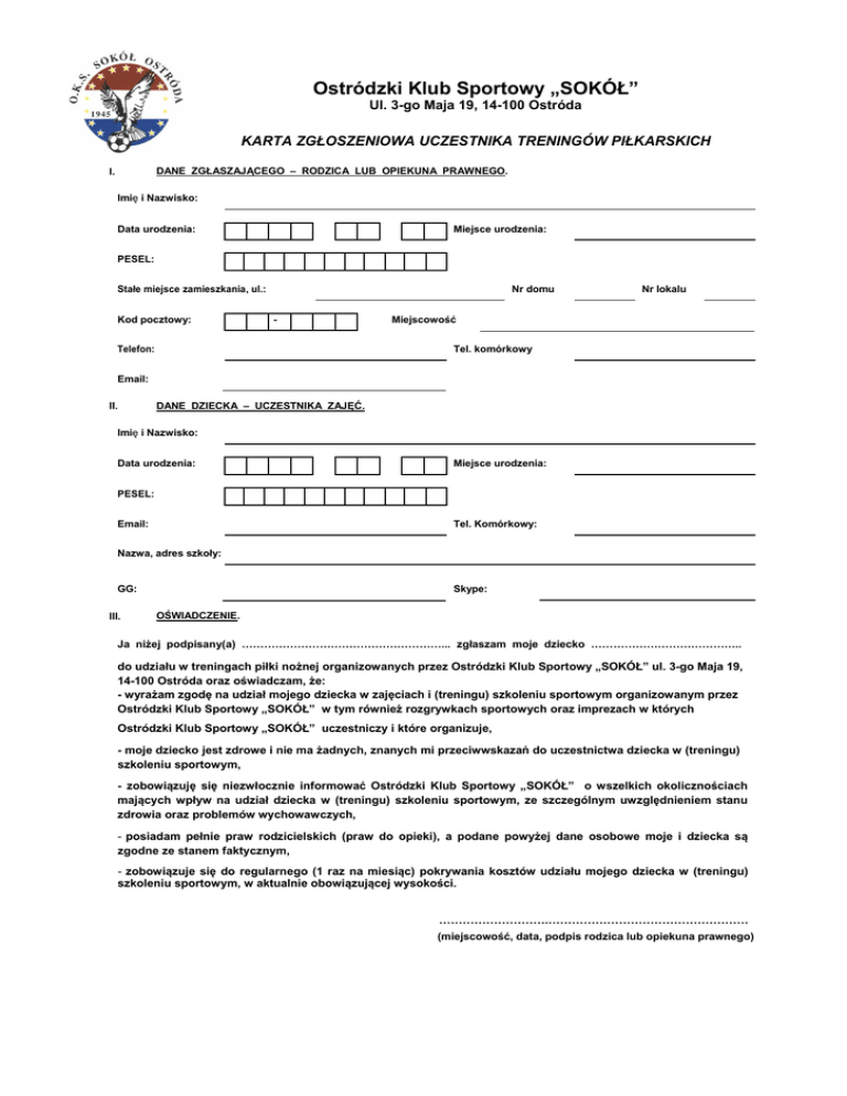 Ostródzki Klub Sportowy „SOKÓŁ” Ul. 3-go Maja 19, 14-100 Ostróda KARTA ZGŁOSZENIOWA UCZESTNIKA TRENINGÓW PIŁKARSKICH DANE ZGŁASZAJĄCEGO – RODZICA LUB OPIEKUNA PRAWNEGO. I. Imię i Nazwisko: Data urodzenia: Miejsce urodzenia: PESEL: Stałe miejsce zamieszkania, ul.: Kod pocztowy: Nr domu - Telefon: Nr lokalu Miejscowość Tel. komórkowy Email: II. DANE DZIECKA – UCZESTNIKA ZAJĘĆ. Imię i Nazwisko: Data urodzenia: Miejsce urodzenia: PESEL: Email: Tel. Komórkowy: Nazwa, adres szkoły: GG: III. Skype: OŚWIADCZENIE. Ja niżej podpisany(a) ………………………………………………... zgłaszam moje dziecko ………………………………….. do udziału w treningach piłki nożnej organizowanych przez Ostródzki Klub Sportowy „SOKÓŁ” ul. 3-go Maja 19, 14-100 Ostróda oraz oświadczam, że: - wyrażam zgodę na udział mojego dziecka w zajęciach i (treningu) szkoleniu sportowym organizowanym przez Ostródzki Klub Sportowy „SOKÓŁ” w tym również rozgrywkach sportowych oraz imprezach w których Ostródzki Klub Sportowy „SOKÓŁ” uczestniczy i które organizuje, - moje dziecko jest zdrowe i nie ma żadnych, znanych mi przeciwwskazań do uczestnictwa dziecka w (treningu) szkoleniu sportowym, - zobowiązuję się niezwłocznie informować Ostródzki Klub Sportowy „SOKÓŁ” o wszelkich okolicznościach mających wpływ na udział dziecka w (treningu) szkoleniu sportowym, ze szczególnym uwzględnieniem stanu zdrowia oraz problemów wychowawczych, - posiadam pełnie praw rodzicielskich (praw do opieki), a podane powyżej dane osobowe moje i dziecka są zgodne ze stanem faktycznym, - zobowiązuje się do regularnego (1 raz na miesiąc) pokrywania kosztów udziału mojego dziecka w (treningu) szkoleniu sportowym, w aktualnie obowiązującej wysokości. ……………………….…………………………………………… (miejscowość, data, podpis rodzica lub opiekuna prawnego)
