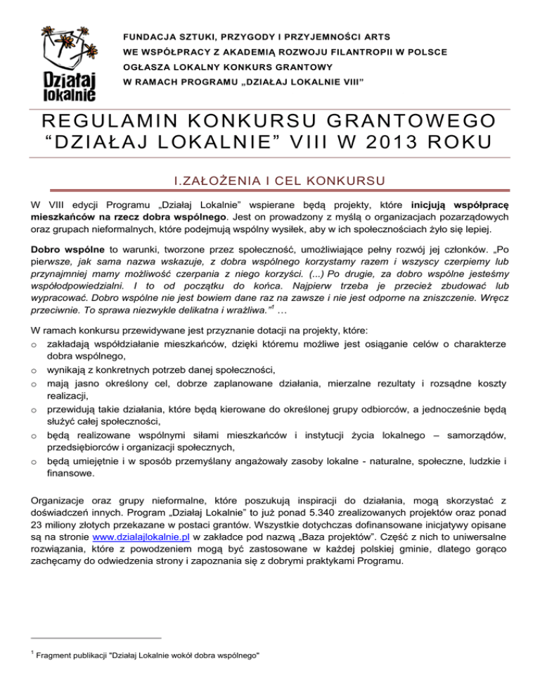 FUNDACJA SZTUKI, PRZYGODY I PRZYJEMNOŚCI ARTS WE WSPÓŁPRACY Z AKADEMIĄ ROZWOJU FILANTROPII W POLSCE 1. OGŁASZA LOKALNY KONKURS GRANTOWY W RAMACH PROGRAMU „DZIAŁAJ LOKALNIE VIII” POLSKO-AMERYKAŃSKIEJ FUNDACJI WOLNOŚCI REGULAMIN KONKURSU GRANTOWEGO “DZIAŁAJ LOKALNIE” VIII W 2013 ROKU I.ZAŁOŻENIA I CEL KONK URSU W VIII edycji Programu „Działaj Lokalnie” wspierane będą projekty, które inicjują współpracę mieszkańców na rzecz dobra wspólnego. Jest on prowadzony z myślą o organizacjach pozarządowych oraz grupach nieformalnych, które podejmują wspólny wysiłek, aby w ich społecznościach żyło się lepiej. Dobro wspólne to warunki, tworzone przez społeczność, umożliwiające pełny rozwój jej członków. „Po pierwsze, jak sama nazwa wskazuje, z dobra wspólnego korzystamy razem i wszyscy czerpiemy lub przynajmniej mamy możliwość czerpania z niego korzyści. (...) Po drugie, za dobro wspólne jesteśmy współodpowiedzialni. I to od początku do końca. Najpierw trzeba je przecież zbudować lub wypracować. Dobro wspólne nie jest bowiem dane raz na zawsze i nie jest odporne na zniszczenie. Wręcz przeciwnie. To sprawa niezwykle delikatna i wrażliwa.”1 … W ramach konkursu przewidywane jest przyznanie dotacji na projekty, które: o zakładają współdziałanie mieszkańców, dzięki któremu możliwe jest osiąganie celów o charakterze dobra wspólnego, o wynikają z konkretnych potrzeb danej społeczności, o mają jasno określony cel, dobrze zaplanowane działania, mierzalne rezultaty i rozsądne koszty realizacji, o przewidują takie działania, które będą kierowane do określonej grupy odbiorców, a jednocześnie będą służyć całej społeczności, o będą realizowane wspólnymi siłami mieszkańców i instytucji życia lokalnego – samorządów, przedsiębiorców i organizacji społecznych, o będą umiejętnie i w sposób przemyślany angażowały zasoby lokalne - naturalne, społeczne, ludzkie i finansowe. Organizacje oraz grupy nieformalne, które poszukują inspiracji do działania, mogą skorzystać z doświadczeń innych. Program „Działaj Lokalnie” to już ponad 5.340 zrealizowanych projektów oraz ponad 23 miliony złotych przekazane w postaci grantów. Wszystkie dotychczas dofinansowane inicjatywy opisane są na stronie www.dzialajlokalnie.pl w zakładce pod nazwą „Baza projektów”. Część z nich to uniwersalne rozwiązania, które z powodzeniem mogą być zastosowane w każdej polskiej gminie, dlatego gorąco zachęcamy do odwiedzenia strony i zapoznania się z dobrymi praktykami Programu. 1 Fragment publikacji "Działaj Lokalnie wokół dobra wspólnego" II. KTO MOŻE UBIEGAĆ SIĘ O DOTACJE? Program adresowany jest do: o organizacji pozarządowych posiadających osobowość prawną (tj. fundacji, stowarzyszeń, oddziałów Caritas zarejestrowanych w KRS lub klubów sportowych zarejestrowanych w ewidencji Starosty Powiatowego), z wyłączeniem fundacji skarbu państwa i ich oddziałów, spółdzielni socjalnych i mieszkaniowych, stowarzyszeń samorządów lokalnych, Lokalnych Grup Działania i Lokalnych Grup Rybackich, Lokalnych Organizacji Turystycznych (działających na podstawie Ustawy z dnia 25 czerwca 1999 r. o Polskiej Organizacji Turystycznej i w oparciu o ustawę prawo o stowarzyszeniach, zgodnie z Art. 4. ustawy o POT) oraz związków stowarzyszeń. Do konkursu nie mogą aplikować organizacje w likwidacji. o grup nieformalnych (w tym także oddziałów terenowych organizacji nieposiadających osobowości prawnej), w których imieniu wniosek złoży organizacja pozarządowa (jak wyżej) lub jedna z następujących instytucji publicznych: przedszkole publiczne, szkoła publiczna, instytucja kultury, biblioteka publiczna, ośrodek pomocy społecznej, jednostki samorządu terytorialnego2, Lokalne Grupy Działania, Lokalne Grupy Rybackie i Lokalne Organizacje Turystyczne (do decyzji ODL). Instytucje te muszą posiadać osobowość prawną lub dysponować stosownym pełnomocnictwem od organu, któremu podlegają, do reprezentowania go w zakresie umożliwiającym przeprowadzenie planowanych działań, podpisanie umowy oraz rozliczenie projektu. o grup nieformalnych, występujących z wnioskiem samodzielnie, jako tzw. Inicjatywa DL (definicja w części VII pkt.3) Do konkursu można składać nieograniczoną liczbę wniosków (zarówno przez wnioskodawców3, jak i realizatorów4), jednak jeden realizator będzie mógł dostać dofinansowanie na realizację najwyżej jednego projektu. W konkursie mogą wziąć udział te organizacje i instytucje oraz grupy, które: o mają siedzibę w gminach Powiatu Myślenickiego: Dobczyce, Lubień, Myślenice, Pcim. Raciechowice, Siepraw, Sułkowice, Tokarnia, Wiśniowa o planują prowadzić działania na terenie jednej z wymienionych gmin. 2 Jeżeli nie wspierają finansowo konkursu „Działaj Lokalnie” 3 organizacja lub instytucja posiadająca osobowość prawną, aplikująca w imieniu grupy nieformalnej, lub w imieniu własnym grupa nieformalna, nieposiadająca osobowości prawnej, która będzie realizować projekt 4 regulamin lokalnego konkursu grantowego w 2013 r., strona 2 z 12 III. JAKIEGO RODZAJU KOSZTY MOGĄ BYĆ FINANSOWANE Z GRANTU „DZIAŁAJ LOKALNIE”? Z otrzymanego grantu można finansować koszty służące osiągnięciu zakładanych we wniosku celów, między innymi: o o o o o zakup materiałów biurowych, artykułów plastycznych i innych materiałów, np. do zajęć i warsztatów, koszty koordynacji i zarządzania projektem, zakup elementów wyposażenia, koszty podróży krajowych, wynagrodzenia specjalistów, honoraria, wynajem sal, sprzętu, nagłośnienia, transportu, o koszty druku, o zakup sprzętu, jeżeli jest to merytorycznie uzasadnione. Z otrzymanego grantu nie można finansować: o o udzielania pożyczek, przedsięwzięć, które zostały już zrealizowane, o celów religijnych i politycznych oraz uprawiania kultu religijnego, 