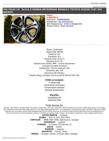 Informacje o produkcie Utworzono 07-03-2017 766 FELGI 16'' 5x114,3 HONDA MITSUBISHI RENAULT TOYOTA SUZUKI FIAT KIA INFINITI Cena : 1.689,00 zł Producent : CARBONADO Dostępność : Na zamówienie Stan magazynowy : brak w magazynie Średnia ocena : brak recenzji Marka: Carbonado Model Felgi: BK766 Średnica: 16" Szerokość: 6,5 Rozstaw śrub: 5x114,3 Odsadzenie ET: 45 Wykończenie (kolor): BMF - Czarne Polerowane Licytujesz komplet (4 sztuki) Dostępność / Termin realizacji: 24h Certyfikat: JWL, VIA Gwarancja 36 miesięcy Dowód zakupu: paragon lub na życzenie faktura VAT 23% CENA za komplet: 4 sztuki felg pierścienie centrujące chromowane wentyle dekielki producenta Wysyłka: przedpłata 0zł pobranie 50zł Felgi pasują do: (pasują* - jeśli chodzi o rozstaw szpilek. Po podaniu modelu auta, roku prod, pojemności silnika sprawdzimy czy felgi na 100% będą pasować do Twojego auta. Dodatkowe parametry które mają wpływ na to czy felga będzie pasować to ET - czyli odsadzenie, szerokość oraz otwór centrujący. Warunkiem 100% pewności jest to czy dany rozmiar felgi występował fabrycznie w danym aucie lub czy producenci felg zamieścili takie informacje w konfiguratorach z których korzystamy. W razie wątpliwości prosimy o kontakt oraz podanie marki, modelu, roku produkcji i pojemności silnika Twojego samochodu.) ASTON MARTIN Vantage ACURA TSX, TL, RSX, RDX, MDX CHRYSLER 300M, 300C 4WD, Sebring new, Voyager CHEVROLET Captiva CITROEN C-Crosser, C4 AirCross, C7 DACIA Duster DAEWOO Leganza DAIHATSU Feroza, Terios DODGE Avenger, Caliber, Caravan, Nitro, Voyager Wygenerowano w programie www.oscGold.com FIAT Sedici FORD Escape, Maverick, Probe HONDA Accord (>03), Accord Coupe (>98) + Type R, Civic, Civic Sport (>04) + TypeR, Civic Tourer (2014-), CR-V, CR-Z, HR-V, FR-V, Integra Type-R, NSX, S200, Odyssey, Prelude (4WS, BB6, BB8) (97-02), Shuttle, Stream HYUNDAI Coupe Tiburon (>02), Elantra, Genesis Coupe, Grandeur, I30, I30 Coupe, I40, IX20, IX35, IX35 Facelift, IX55, Santa Fe, Grand Santa Fe, Sonata new, Trajet, Tucson, XG25/XG30, Veloster INFINITI FX35, FX45, EX35, G35, G37, I30, M35, M45, Q45, Q50 JEEP Grand Cherokee (92-99), Patriot, Compass KIA Carnival, Carens, Ceed, Ceed SW, Magentis new, Opirus, Optima, Pro Ceed, Sedeona, Soul, Sorento II (09-), Sorento III, Sprotage II, Sportage III, Venga LANCIA Flavia LAND ROVER Freelander LEXUS GS 300/430 (>98), IS 200/300 (>98), IS250, IS220d, LS 400, LS 430, RX300, SC 430 MAZDA 3, 5, 6, CX5, CX7, CX9, 323 F (>00), 626 (97-03), MPV, MX-6, Premacy, RX8, Tribute, Xedos 6, Xedos 9 MITSUBISHI ASX, Eclipse (D20, D30), Grandis, Lancer neu, Outlander, Pajero Pinin, Sigma, Space Gear NISSAN 200SX (97-00), 350Z, Almera Tino, Altima, e-NV200, Juke, Maxima (95-00), Maxima QX (>00), Murano, Primera (02-), Qashqai, Primastar (15-), Pulsar, X-Trail, Opel Antara, Cascada, Sintra, Vivaro B PEUGEOT 4007, 4008, RENAULT Fluence, Koleos, Laguna III, Latitute, Megane III(cabrio), Scenic III, Grand Scenic III, Trafic III SUBARU Impreza STI, Tribeca SUZUKI Grand Vitara new, Kizashi, Swift Sport, SX 4 TOYOTA Auris, Auris Touring Sports, Avensis Verso, Camry (>96), Corolla Verso new, Hiace, Picnic (XM1), Previa, Prius+, RAV4, Supra, Verso Alufelgi dobieramy wg parametrów katalogowych producentów. W przypadku niektórych modeli aut lub felg zachodzi konieczność zastosowania dystansów, śrub/nakrętek ampułkowych. Zgodnie z Kodeksem PWP art.156 ust 3, emblematy widoczne na felgach mają charakter wyłącznie informacyjny i nie należy się tym sugerować, że jest to produkt oryginalny danego producenta samochodu. Alufelgi dobieramy wg parametrów katalogowych producentów. W przypadku niektórych modeli aut lub felg zachodzi konieczność zastosowania dystansów, śrub/nakrętek ampułkowych. Ponieważ, zawsze może zajść taka sytuacja w której katalog/konfigurator wprowadzi w błąd sprzedawcę zaleca się przed montażem opon przyłożyć felgę na piastę i sprawdzić czy felga nigdzie nie będzie obcierać. Po założeniu opon zwrot felg będzie nie możliwy.