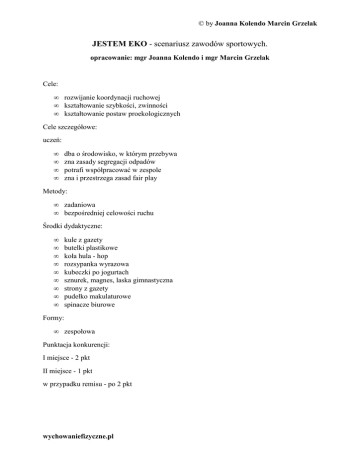 © by Joanna Kolendo Marcin Grzelak JESTEM EKO - scenariusz zawodów sportowych. opracowanie: mgr Joanna Kolendo i mgr Marcin Grzelak Cele: • rozwijanie koordynacji ruchowej • kształtowanie szybkości, zwinności • kształtowanie postaw proekologicznych Cele szczegółowe: uczeń: • • • • dba o środowisko, w którym przebywa zna zasady segregacji odpadów potrafi współpracować w zespole zna i przestrzega zasad fair play Metody: • zadaniowa • bezpośredniej celowości ruchu Środki dydaktyczne: • • • • • • • • • kule z gazety butelki plastikowe koła hula - hop rozsypanka wyrazowa kubeczki po jogurtach sznurek, magnes, laska gimnastyczna strony z gazety pudełko makulaturowe spinacze biurowe Formy: • zespołowa Punktacja konkurencji: I miejsce - 2 pkt II miejsce - 1 pkt w przypadku remisu - po 2 pkt wychowaniefizyczne.pl © by Joanna Kolendo Marcin Grzelak konkurencja I przybory: butelka pet ustawienie: drużyny w rzędach na linii startu przebieg: na sygnał zawodnik przekazuje nad głową butelkę pet następnemu zawodnikowi. Gdy butelkę otrzyma ostatni zawodnik - obiega swój rząd i staje, jako pierwszy. Wszyscy zawodnicy wykonują to samo zadanie. Wygrywa zespół, który szybciej wykonał zadanie. Punkty karne: rzucanie butelki nad głowami konkurencja II przybory: butelki pet, papierowa kulka ustawienie: drużyny w rzędach na linii startu przebieg: na sygnał zawodnik pokonuje slalomem trasę między butelkami pet, prowadząc nogą papierową kulkę. Po obiegnięciu ostatniej butelki, bierze w dłonie kulkę papierową, biegiem wraca do swojego zespołu i przekazuje sprzęt następnemu z drużyny. Wszyscy zawodnicy wykonują to samo zadanie. Wygrywa zespół, który szybciej wykonał zadanie. Punkty karne: zbyt szybki start, pomylenie kolejności wykonywania zadań konkurencja III przybory: kubeczki po jogurtach ustawienie: drużyny w rzędach na linii startu przebieg: na sygnał zawodnik bierze kubeczek po jogurcie i zanosi w wyznaczone miejsce, wraca biegiem do swojego zespołu. Kolejni zawodnicy wykonują to samo zadanie. Wygrywa zespół, który szybciej wykonał zadanie. Punkty karne: zbyt szybki start, kubeczek wypadnie poza wyznaczone miejsce. konkurencja IV przybory: kubeczki po jogurtach ustawienie: drużyny w rzędach na linii startu przebieg: na sygnał zawodnik biegnie do wyznaczonego miejsca, w którym znajdują się kubeczki po jogurcie i zaczyna ustawiać wieżę. Po postawieniu swojego kubeczka wraca biegiem do swojej drużyny. Kolejni zawodnicy wykonują to samo zadanie. Jeśli wieża się przewróci należy ją ponownie ustawić. Wygrywa zespół, który zbudował najwyższą wieżę. Punkty karne: zbyt szybki start. wychowaniefizyczne.pl © by Joanna Kolendo Marcin Grzelak konkurencja V przybory: kulki papierowe, pudełko makulaturowe ustawienie: drużyny w rzędach na linii startu przebieg: na sygnał, z wyznaczonego miejsca, zawodnicy oddają po jednym rzucie papierową kulką do pudełka. Wygrywa zespół, który więcej razy wcelował do pudełka. Punkty karne: przekroczenie linii rzutu. konkurencja VI przybory: butelka pet ustawienie: drużyny w 2 rzędach na przeciwko siebie przebieg: na sygnał zawodnik biegnie do swojego partnera i przekazuje mu butelkę pet, która jest sygnałem do startu, sam natomiast idzie na koniec rzędu, do którego dobiegł. Wszyscy zawodnicy wykonują to samo zadanie. Wygrywa zespół, który szybciej zmienił miejsce. Punkty karne: zbyt szybki start, rzucenie butelki do pierwszego zawodnika. konkurencja VII przybory: butelki pet, kulka papierowa ustawienie: drużyny w rzędach na linii startu przebieg: na sygnał zawodnik rzuca kulką papierową w ustawione butelki pet - na zasadzie gry w kręgle. Po oddaniu rzutu - idzie na koniec swojego zespołu. Wszyscy zawodnicy wykonują to samo zadanie. Wygrywa zespół, który strącił więcej butelek pet (każde strącenie butelki to mały punkt dla drużyny, suma małych punktów daje duży punkt). Punkty karne: przekroczenie linii rzutu. konkurencja VIII przybory: koło hula - hop, laska gimnastyczna, sznurek, magnes ustawienie: drużyny w rzędach na linii startu przebieg: na sygnał zawodnik biegnie do koła hula - hop, w którym leżą kartki ze spinaczami biurowymi z nazwami roślin, zwierząt i odpadów. Zadaniem zawodnika - za pomocą laski gimnastycznej ze sznurkiem i magnesem - jest wyłowienie odpadów z koła hula - hop. Wygrywa zespół, który szybciej wykonał zadanie. Punkty karne: zbyt szybki start, wyłowienie innej kartki niż z odpadami. konkurencja IX przybory: gazeta ustawienie: drużyny w rzędach na linii startu wychowaniefizyczne.pl © by Joanna Kolendo Marcin Grzelak przebieg: zawodnicy otrzymują o jedną kartkę gazety więcej niż liczy ich drużyna. Kartki stają się kamieniami, które pomogą im dotrzeć do wyznaczonej linii. Wygrywa zespół, który szybciej wykonał zadanie. Punkty karne: zejście z kartki, dwie osoby znajdują się na jednej kartce. konkurencja X przybory: kulki papierowe ustawienie: drużyny po 2 stronach boiska przebieg: na sygnał zawodnicy przerzucają papierowe kulki na boisko przeciwnika. Wygrywa zespół, który po upływie określonego czasu ma mniej kulek na swoim polu. Punkty karne: przekroczenie linii środkowej, przerzucanie kulek po zakończeniu odliczania. konkurencja XI przybory: rozsypanka wyrazowa ustawienie: drużyny po 2 stronach boiska przebieg: na sygnał zawodnicy układają z rozsypanek wyrazowych hasła promujące ekologię. Wygrywa zespół, który szybciej wykonał zadanie. konkurencja XII przybory: koła hula - hop, kartki z odpadami, plansze ustawienie: drużyny po 2 stronach boiska przebieg: na sygnał zawodnicy układają kartki z odpadami na planszy wg sposobu ich segregacji. Wygrywa zespół, który szybciej i bez popełnienia błędu wykonał zadanie. wychowaniefizyczne.pl