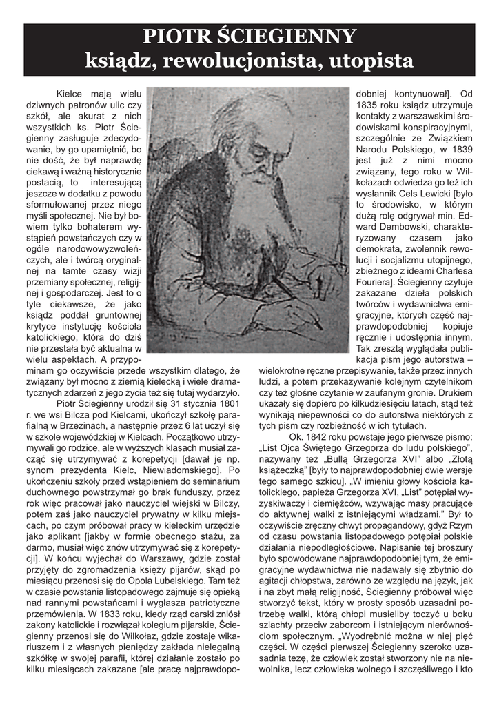 PIOTR ŚCIEGIENNY ksiądz, rewolucjonista, utopista Kielce mają wielu dziwnych patronów ulic czy szkół, ale akurat z nich wszystkich ks. Piotr Ściegienny zasługuje zdecydowanie, by go upamiętnić, bo nie dość, że był naprawdę ciekawą i ważną historycznie postacią, to interesującą jeszcze w dodatku z powodu sformułowanej przez niego myśli społecznej. Nie był bowiem tylko bohaterem wystąpień powstańczych czy w ogóle narodowowyzwoleńczych, ale i twórcą oryginalnej na tamte czasy wizji przemiany społecznej, religijnej i gospodarczej. Jest to o tyle ciekawsze, że jako ksiądz poddał gruntownej krytyce instytucję kościoła katolickiego, która do dziś nie przestała być aktualna w wielu aspektach. A przypominam go oczywiście przede wszystkim dlatego, że związany był mocno z ziemią kielecką i wiele dramatycznych zdarzeń z jego życia też się tutaj wydarzyło. Piotr Ściegienny urodził się 31 stycznia 1801 r. we wsi Bilcza pod Kielcami, ukończył szkołę parafialną w Brzezinach, a następnie przez 6 lat uczył się w szkole wojewódzkiej w Kielcach. Początkowo utrzymywali go rodzice, ale w wyższych klasach musiał zacząć się utrzymywać z korepetycji [dawał je np. synom prezydenta Kielc, Niewiadomskiego]. Po ukończeniu szkoły przed wstąpieniem do seminarium duchownego powstrzymał go brak funduszy, przez rok więc pracował jako nauczyciel wiejski w Bilczy, potem zaś jako nauczyciel prywatny w kilku miejscach, po czym próbował pracy w kieleckim urzędzie jako aplikant [jakby w formie obecnego stażu, za darmo, musiał więc znów utrzymywać się z korepetycji]. W końcu wyjechał do Warszawy, gdzie został przyjęty do zgromadzenia księży pijarów, skąd po miesiącu przenosi się do Opola Lubelskiego. Tam też w czasie powstania listopadowego zajmuje się opieką nad rannymi powstańcami i wygłasza patriotyczne przemówienia. W 1833 roku, kiedy rząd carski zniósł zakony katolickie i rozwiązał kolegium pijarskie, Ściegienny przenosi się do Wilkołaz, gdzie zostaje wikariuszem i z własnych pieniędzy zakłada nielegalną szkółkę w swojej parafii, której działanie zostało po kilku miesiącach zakazane [ale pracę najprawdopo- dobniej kontynuował]. Od 1835 roku ksiądz utrzymuje kontakty z warszawskimi środowiskami konspiracyjnymi, szczególnie ze Związkiem Narodu Polskiego, w 1839 jest już z nimi mocno związany, tego roku w Wilkołazach odwiedza go też ich wysłannik Cels Lewicki [było to środowisko, w którym dużą rolę odgrywał min. Edward Dembowski, charakteryzowany czasem jako demokrata, zwolennik rewolucji i socjalizmu utopijnego, zbieżnego z ideami Charlesa Fouriera]. Ściegienny czytuje zakazane dzieła polskich twórców i wydawnictwa emigracyjne, których część najprawdopodobniej kopiuje ręcznie i udostępnia innym. Tak zresztą wyglądała publikacja pism jego autorstwa – wielokrotne ręczne przepisywanie, także przez innych ludzi, a potem przekazywanie kolejnym czytelnikom czy też głośne czytanie w zaufanym gronie. Drukiem ukazały się dopiero po kilkudziesięciu latach, stąd też wynikają niepewności co do autorstwa niektórych z tych pism czy rozbieżność w ich tytułach. Ok. 1842 roku powstaje jego pierwsze pismo: „List Ojca Świętego Grzegorza do ludu polskiego”, nazywany też „Bullą Grzegorza XVI” albo „Złotą książeczką” [były to najprawdopodobniej dwie wersje tego samego szkicu]. „W imieniu głowy kościoła katolickiego, papieża Grzegorza XVI, „List” potępiał wyzyskiwaczy i ciemiężców, wzywając masy pracujące do aktywnej walki z istniejącymi władzami.” Był to oczywiście zręczny chwyt propagandowy, gdyż Rzym od czasu powstania listopadowego potępiał polskie działania niepodległościowe. Napisanie tej broszury było spowodowane najprawdopodobniej tym, że emigracyjne wydawnictwa nie nadawały się zbytnio do agitacji chłopstwa, zarówno ze względu na język, jak i na zbyt małą religijność, Ściegienny próbował więc stworzyć tekst, który w prosty sposób uzasadni potrzebę walki, którą chłopi musieliby toczyć u boku szlachty przeciw zaborcom i istniejącym nierównościom społecznym. „Wyodrębnić można w niej pięć części. W części pierwszej Ściegienny szeroko uzasadnia tezę, że człowiek został stworzony nie na niewolnika, lecz człowieka wolnego i szczęśliwego i kto zakuwa ludzi w kajdany niewoli, ten postępuje przeciw woli Boga. W części drugiej uzasadnia konieczność solidarnego i zbiorowego działania poszczególnych ludzi celem przeciwdziałania panom i królom, jako ciemiężycielom ludu, oraz celem usunięcia krzywdy i wyzysku. [J] W części trzeciej dowodzi, że wszystkie dotychczasowe wojny toczone były w interesie królów i panów, wobec czego lud nie powinien brać w nich udziału. W następnej części szeroko uzasadnia tezę o konieczności prowadzenia wojny sprawiedliwej, a więc wojny ubogich z bogatymi, uciśnionych i nieszczęśliwych z ciemiężcami, chłopów z panami. I wreszcie w części ostatniej mówi o przygotowaniu się do prowadzenia wojny sprawiedliwej, ustala zasady organizacyjne dla prowadzenia spisku.” Agitacja zatacza coraz szersze kręgi, coraz więcej ludzi angażuje się w pracę konspiracyjną, są wśród nich także bracia Piotra, Dominik i Karol. Teren pracy spiskowej wyznaczają miejskie ośrodki, w których istnieją grupy konspiratorów – Warszawa, Lublin, Radom i Kielce, pomagające chłopskiej organizacji. Zazwyczaj agitatorzy pojawiali się na wsi, zbierając ich mieszkańców i czytając im „buntownicze odezwy”. Latem 1842 roku Ściegienny wybrał się razem z bratem Dominikiem w objazdową podróż po kielecczyźnie, odwiedzając wiele wsi i parafii, rozmawiając z proboszczami, czytając im pisma, które czasem zostawiał, gdy stwierdzał, że trafiły na podatny grunt. W 1843 w Warszawie zostaje aresztowanych wielu konspiratorów, kilku,