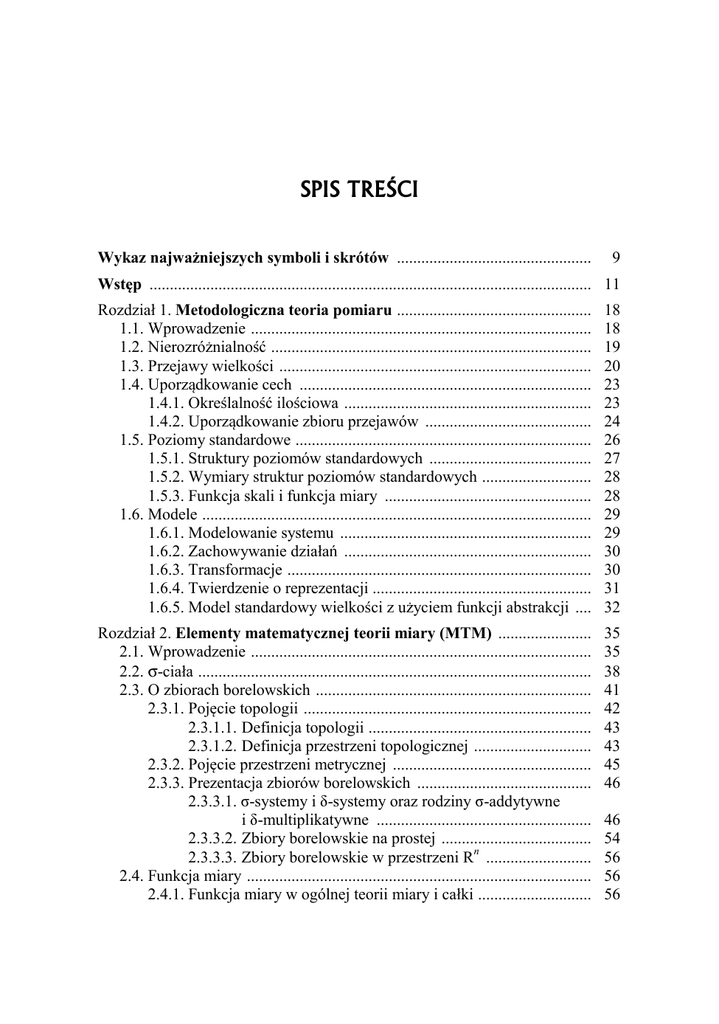 5 SPIS TREŚCI Wykaz najważniejszych symboli i skrótów ................................................ 9 Wstęp ............................................................................................................. 11 Rozdział 1. Metodologiczna teoria pomiaru ................................................ 1.1. Wprowadzenie .................................................................................... 1.2. Nierozróżnialność ............................................................................... 1.3. Przejawy wielkości ............................................................................. 1.4. Uporządkowanie cech ........................................................................ 1.4.1. Określalność ilościowa ............................................................. 1.4.2. Uporządkowanie zbioru przejawów ......................................... 1.5. Poziomy standardowe ......................................................................... 1.5.1. Struktury poziomów standardowych ........................................ 1.5.2. Wymiary struktur poziomów standardowych ........................... 1.5.3. Funkcja skali i funkcja miary ................................................... 1.6. Modele ................................................................................................ 1.6.1. Modelowanie systemu .............................................................. 1.6.2. Zachowywanie działań ............................................................. 1.6.3. Transformacje ........................................................................... 1.6.4. Twierdzenie o reprezentacji ...................................................... 1.6.5. Model standardowy wielkości z użyciem funkcji abstrakcji .... 18 18 19 20 23 23 24 26 27 28 28 29 29 30 30 31 32 Rozdział 2. Elementy matematycznej teorii miary (MTM) ....................... 2.1. Wprowadzenie .................................................................................... 2.2. σ-ciała ................................................................................................. 2.3. O zbiorach borelowskich .................................................................... 2.3.1. Pojęcie topologii ....................................................................... 2.3.1.1. Definicja topologii ....................................................... 2.3.1.2. Definicja przestrzeni topologicznej ............................. 2.3.2. Pojęcie przestrzeni metrycznej ................................................. 2.3.3. Prezentacja zbiorów borelowskich ........................................... 2.3.3.1. σ-systemy i δ-systemy oraz rodziny σ-addytywne i δ-multiplikatywne ..................................................... 2.3.3.2. Zbiory borelowskie na prostej ..................................... 2.3.3.3. Zbiory borelowskie w przestrzeni Rn .......................... 2.4. Funkcja miary ..................................................................................... 2.4.1. Funkcja miary w ogólnej teorii miary i całki ............................ 35 35 38 41 42 43 43 45 46 46 54 56 56 56 6 2.4.2. Przykłady miar ......................................................................... 2.4.3. Własności miary ...................................................................... 2.4.4. Miara Jordana i miara Lebesgue’a ........................................... 2.4.4.1. Miara Jordana ............................................................. 2.4.4.2. Miara Lebesgue’a ....................................................... 2.4.4.3. Miara Lebesgue’a zbiorów liniowych, miara Lebesgue’a na prostej ................................................. 2.4.4.4. Miara Lebesgue’a w Rn .............................................. 2.4.5. Generowanie miary (uzupełnienie miary niezupełnej) ............ 2.4.6. Całka i historia jej konstrukcji ................................................. 2.4.6.1. Uwagi o pojęciu całki ................................................. 2.4.6.2. Całka Lebesgue’a ....................................................... 2.5. Cecha mierzalności ............................................................................ 2.5.1. Zbiory mierzalne ..................................................................... 2.5.2. Zbiory niemierzalne ................................................................. 2.5.2.1. Zbiory niemierzalne na prostej - zbiór Vitaliego ........ 2.5.2.2. O zbiorach niemierzalnych polowo i wyższych wymiarów ................................................................... 2.5.3. Klasa funkcji mierzalnych a klasa funkcji ciągłych ................ 2.5.3.1. Klasa funkcji ciągłych ................................................ 2.5.3.2. Własności topologiczne przestrzeni ........................... 2.5.3.2.1. Zwartość ..................................................... 2.5.3.2.2. Spójność ..................................................... 2.5.3.2.3. Continua ..................................................... 2.5.3.2.4. Hausdorffowość ......................................... 2.5.3.2.5. Zwartość na usługach ciągłości - odwracalność odwzorowań ciągłych ........ 2.5.3.2.6. Topologia ilorazowa ................................... 2.5.3.3. Klasa funkcji mierzalnych .......................................... 2.5.3.4. Klasa funkcji mierzalnych a klasa funkcji ciągłych i ich szczegółowy związek ......................................... 2.6. Homeomorfizmy jako kategorie przekształceń ................................. 2.6.1. Przekształcenia ........................................................................ 2.6.2. Homeomorfizmy ...................................................................... 2.6.3. Przykłady homeomorfizmów .................................................. 2.6.4. Niezmienniki topologiczne zbiorów ...................