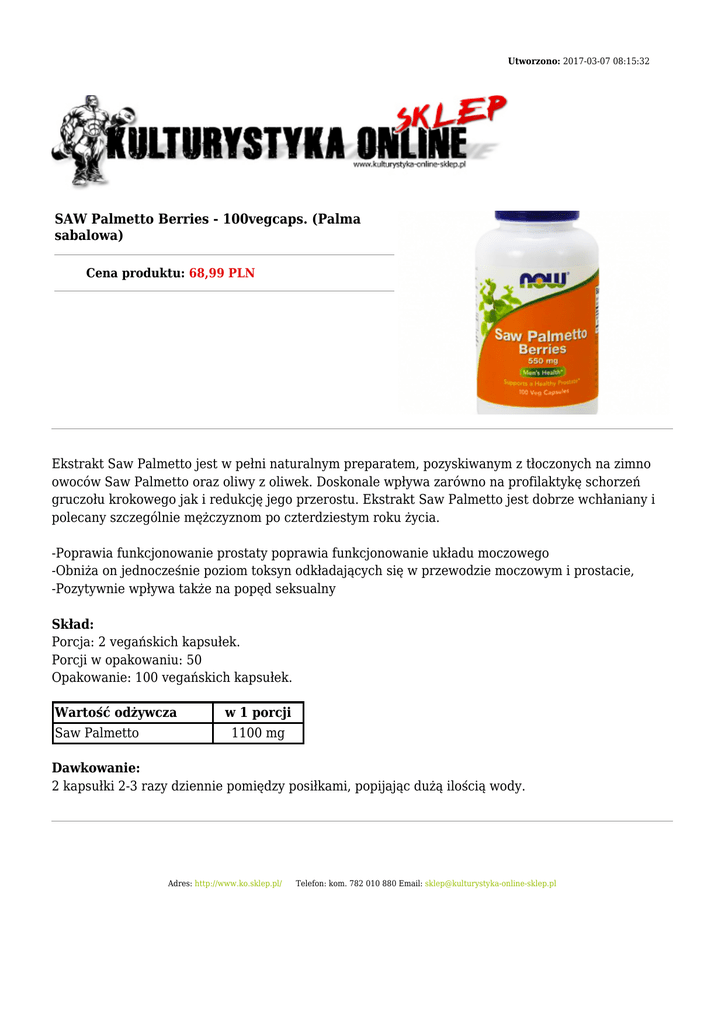 Utworzono: 2017-03-07 08:15:32 SAW Palmetto Berries - 100vegcaps. (Palma sabalowa) Cena produktu: 68,99 PLN Ekstrakt Saw Palmetto jest w pełni naturalnym preparatem, pozyskiwanym z tłoczonych na zimno owoców Saw Palmetto oraz oliwy z oliwek. Doskonale wpływa zarówno na profilaktykę schorzeń gruczołu krokowego jak i redukcję jego przerostu. Ekstrakt Saw Palmetto jest dobrze wchłaniany i polecany szczególnie mężczyznom po czterdziestym roku życia. -Poprawia funkcjonowanie prostaty poprawia funkcjonowanie układu moczowego -Obniża on jednocześnie poziom toksyn odkładających się w przewodzie moczowym i prostacie, -Pozytywnie wpływa także na popęd seksualny Skład: Porcja: 2 vegańskich kapsułek. Porcji w opakowaniu: 50 Opakowanie: 100 vegańskich kapsułek. Wartość odżywcza Saw Palmetto w 1 porcji 1100 mg Dawkowanie: 2 kapsułki 2-3 razy dziennie pomiędzy posiłkami, popijając dużą ilością wody. Adres: http://www.ko.sklep.pl/ Telefon: kom. 782 010 880 Email: [email protected]
