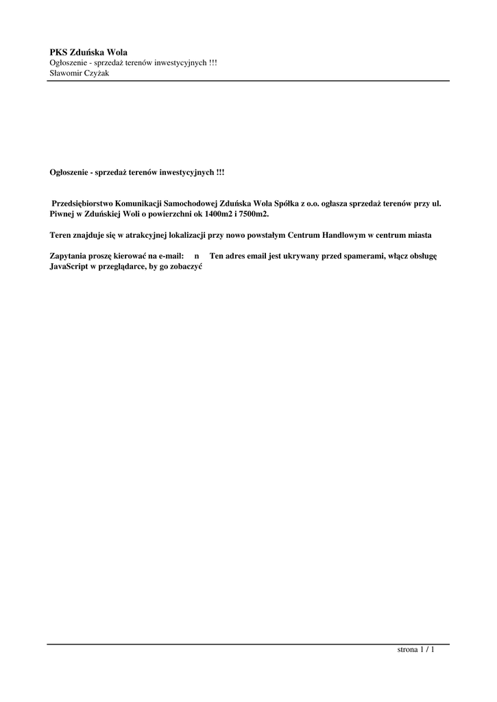 PKS Zduńska Wola Ogłoszenie - sprzedaż terenów inwestycyjnych !!! Sławomir Czyżak Ogłoszenie - sprzedaż terenów inwestycyjnych !!! Przedsiębiorstwo Komunikacji Samochodowej Zduńska Wola Spółka z o.o. ogłasza sprzedaż terenów przy ul. Piwnej w Zduńskiej Woli o powierzchni ok 1400m2 i 7500m2. Teren znajduje się w atrakcyjnej lokalizacji przy nowo powstałym Centrum Handlowym w centrum miasta Zapytania proszę kierować na e-mail: n Ten adres email jest ukrywany przed spamerami, włącz obsługę JavaScript w przeglądarce, by go zobaczyć strona 1 / 1