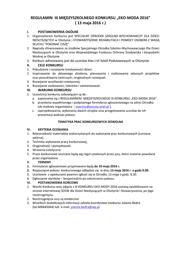 REGULAMIN III MIĘDZYSZKOLNEGO KONKURSU „EKO-MODA 2016” ( 13 maja 2016 r.) I. POSTANOWIENIA OGÓLNE 1. Organizatorem Konkursu jest SPECJALNY OŚRODEK SZKOLNO-WYCHOWAWCZY DLA DZIECI NIESŁYSZĄCYCH w Olsztynie i STOWARZYSZENIE REHABILITACJI I POMOCY OSOBOM Z WADĄ SŁUCHU "POKONAĆ CISZĘ". 2. Nagrody sfinansowano ze środków Specjalnego Ośrodka Szkolno-Wychowawczego Dla Dzieci Niesłyszących w Olsztynie oraz Wojewódzkiego Funduszu Ochrony Środowiska i Gospodarki Wodnej w Olsztynie 3. Konkurs adresowany jest do uczniów klas I-VI Szkół Podstawowych w Olsztynie. II. CELE KONKURSU 1. Pobudzanie i rozwijanie kreatywności dzieci. 2. Inspirowanie do aktywnego działania, planowania i realizowania własnych projektów oraz poszukiwania twórczych, oryginalnych rozwiązań. 3. Rozwijanie wrażliwości estetycznej. 4. Rozwijanie osobowości, talentów i zainteresowań. III. WARUNKI KONKURSU 1. Uczestnicy konkursu zobowiązani są do : a. zapoznania się z REGULAMINEM MIĘDZYSZKOLNEGO III KONKURSU „EKO-MODA 2016”. b. przesłania wypełnionego i podpisanego formularza zgłoszeniowego na adres Ośrodka lub mailowy organizatora ( [email protected] ). c. zaprojektowania, wykonania dwóch strojów oraz przygotowania uczniów do ich prezentacji podczas pokazu. TEMATYKA PRAC KONKURSOWYCH DOWOLNA IV. KRYTERIA OCENIANIA 1. Różnorodność materiałów wykorzystanych do wykonania prac konkursowych (surowce wtórne). 2. Technika wykonania pracy konkursowej. 3. Oryginalność i pomysłowość. 4. Wrażenia estetyczne. 5. Prace konkursowe oceniane będą wg reguł ustalonych przez jury, które zostanie powołane przez organizatora. V. TERMINY 1. Formularze zgłoszeniowe przyjmowane będą do 10 maja 2016 r. 2. Rozpoczęcie pokazu konkursowego odbędzie się w dniu 13 maja 2016 r. o godz.9.00. 3. Uczniowie z opiekunami powinni zgłosić się w Ośrodku 13 maja o godz. 8.30. 4. Ogłoszenie wyników – bezpośrednio po zakończeniu pokazu. VI. POSTANOWIENIA KOŃCOWE 1. Wyniki Konkursu oraz zdjęcia z III KONKURSU EKO-MODY 2016 zostaną opublikowane na stronie internetowej SOSW dla Dzieci Niesłyszących w Olsztynie i Stowarzyszenia, po jego rozstrzygnięciu. 2. Rozstrzygnięcia Jury są ostateczne. 3. Wszelkich dodatkowych informacji udziela koordynator konkursu Jolanta Bedra (tel.600645044) lub e-mail: [email protected]