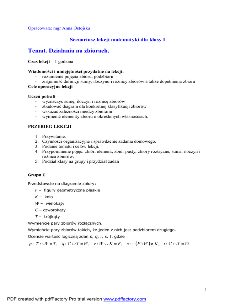 - znajomość definicji sumy, iloczynu i różnicy zbiorów a także dopełnienia zbioru