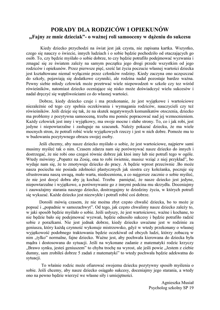PORADY DLA RODZICÓW I OPIEKUNÓW „Fajny ze mnie dzieciak”- o ważnej roli samooceny w dążeniu do sukcesu Kiedy dziecko przychodzi na świat jest jak czysta, nie zapisana kartka. Wszystko, czego się nauczy o świecie, innych ludziach i o sobie będzie pochodziło od otaczających go osób. To, czy będzie myślało o sobie dobrze, to czy będzie potrafiło podejmować wyzwania i zmagać się ze światem zależy na samym początku jego drogi przede wszystkim od jego rodziców i opiekunów. Przez pierwsze pięć, sześć lat życia poczucie własnej wartości dziecka jest kształtowane niemal wyłącznie przez członków rodziny. Kiedy zaczyna ono uczęszczać do szkoły, pojawiają się dodatkowe czynniki, ale rodzina nadal pozostaje bardzo ważna. Pewny siebie młody człowiek może przetrwać wiele niepowodzeń w szkole czy tez wśród rówieśników, natomiast dziecko oceniające się nisko może doświadczyć wielu sukcesów i nadal dręczyć się wątpliwościami co do własnej wartości. Dobrze, kiedy dziecko czuje i ma przekonanie, że jest wyjątkowe i wartościowe niezależnie od tego czy spełnia oczekiwania i wymagania rodziców, nauczycieli czy też rówieśników. Jeśli dzieje się tak, że na skutek negatywnych komunikatów otoczenia, dziecko ma problemy z pozytywna samooceną, trzeba mu pomóc popracować nad jej wzmocnieniem. Każdy człowiek jest inny i wyjątkowy, ma swoje mocne i słabe strony. To, co i jak robi, jest jedyne i niepowtarzalne i zasługuje na szacunek. Należy pokazać dziecku, że ma wiele mocnych stron, że potrafi robić wiele wyjątkowych rzeczy i jest w nich dobre. Pomoże mu to w budowaniu pozytywnego obrazu swojej osoby. Jeśli chcemy, aby nasze dziecko myślało o sobie, że jest wartościowe, najpierw sami musimy myśleć tak o nim. Czasem zdarza nam się porównywać nasze dziecko do innych i dostrzegać, że nie robi ono czegoś równie dobrze jak ktoś inny lub nie potrafi tego w ogóle. Wtedy mówimy „Popatrz na Zosię, ona to robi świetnie, musisz wziąć z niej przykład”, bo wydaje nam się, że to zmotywuje dziecko do pracy. A będzie wprost przeciwnie .Bo może nasza pociecha nie posiada zdolności plastycznych jak siostra czy koleżanka, poczuje się sfrustrowana naszą uwagą, mało warta, niedoceniona, a co najgorsze zacznie o sobie myśleć, że nie jest dosyć dobra aby ją kochać. Trzeba pamiętać, że nasze dziecko jest jedyne, niepowtarzalne i wyjątkowe, a porównywanie go z innymi podcina mu skrzydła. Doceniajmy i zauważajmy starania naszego dziecko, dostrzegajmy te dziedziny życia, w których potrafi się wykazać. Każde dziecko jest niezwykłe i potrafi robić coś dobrze. Dorośli mówią czasem, że nie można zbyt często chwalić dziecka, bo to może je popsuć i „popadnie w samozachwyt”. Od tego, jak często chwalimy nasze dziecko zależy to, w jaki sposób będzie myślało o sobie. Jeśli usłyszy, że jest wartościowe, ważne i kochane, to nie będzie bało się podejmować wyzwań, będzie odnosiło sukcesy i będzie potrafiło radzić sobie z porażkami. Nie jest jednak dobrze, kiedy dziecko uważane jest w rodzinie za geniusza, który każdą czynność wykonuje mistrzowsko, gdyż w wtedy przekonany o własnej wyjątkowość podobnego traktowania będzie oczekiwał od obcych ludzi, którzy zobaczą w nim „tylko” normalne, fajne dziecko. Ważne jest, aby pochwała kierowana do dziecka była mądra i dostosowana do sytuacji. Jeśli na wykonane zadanie z matematyki rodzic krzyczy „Brawo synku, jesteś geniuszem” to chyba trochę na wyrost, ale jeśli powie „Jestem z ciebie dumny, sam zrobiłeś dobrze 5 zadań z matematyki” to wtedy pochwała będzie adekwatna do sytuacji. To właśnie rodzic może ofiarować swojemu dziecku pozytywny sposób myślenia o sobie. Jeśli chcemy, aby nasze dziecko osiągało sukcesy, doceniajmy jego starania, a wtedy ono na pewno będzie wierzyć we własne siły i umiejętności. Agnieszka Musiał Psycholog szkolny SP 19