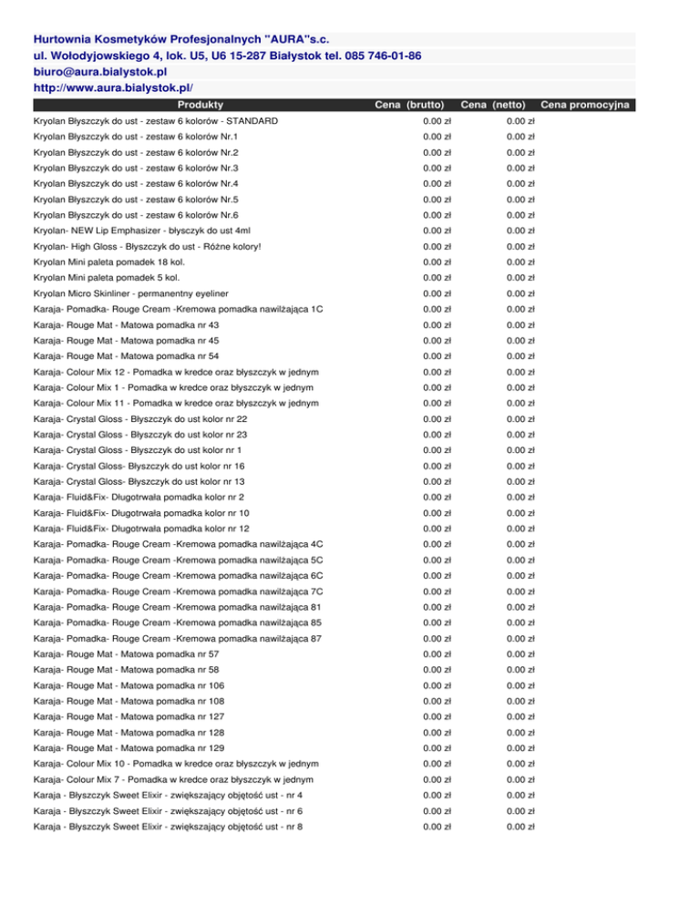 Hurtownia Kosmetyków Profesjonalnych "AURA"s.c. ul. Wołodyjowskiego 4, lok. U5, U6 15-287 Białystok tel. 085 746-01-86 [email protected] http://www.aura.bialystok.pl/ Produkty Cena (brutto) Cena (netto) Kryolan Błyszczyk do ust - zestaw 6 kolorów - STANDARD 0.00 zł 0.00 zł Kryolan Błyszczyk do ust - zestaw 6 kolorów Nr.1 0.00 zł 0.00 zł Kryolan Błyszczyk do ust - zestaw 6 kolorów Nr.2 0.00 zł 0.00 zł Kryolan Błyszczyk do ust - zestaw 6 kolorów Nr.3 0.00 zł 0.00 zł Kryolan Błyszczyk do ust - zestaw 6 kolorów Nr.4 0.00 zł 0.00 zł Kryolan Błyszczyk do ust - zestaw 6 kolorów Nr.5 0.00 zł 0.00 zł Kryolan Błyszczyk do ust - zestaw 6 kolorów Nr.6 0.00 zł 0.00 zł Kryolan- NEW Lip Emphasizer - błysczyk do ust 4ml 0.00 zł 0.00 zł Kryolan- High Gloss - Błyszczyk do ust - Różne kolory! 0.00 zł 0.00 zł Kryolan Mini paleta pomadek 18 kol. 0.00 zł 0.00 zł Kryolan Mini paleta pomadek 5 kol. 0.00 zł 0.00 zł Kryolan Micro Skinliner - permanentny eyeliner 0.00 zł 0.00 zł Karaja- Pomadka- Rouge Cream -Kremowa pomadka nawilżająca 1C 0.00 zł 0.00 zł Karaja- Rouge Mat - Matowa pomadka nr 43 0.00 zł 0.00 zł Karaja- Rouge Mat - Matowa pomadka nr 45 0.00 zł 0.00 zł Karaja- Rouge Mat - Matowa pomadka nr 54 0.00 zł 0.00 zł Karaja- Colour Mix 12 - Pomadka w kredce oraz błyszczyk w jednym 0.00 zł 0.00 zł Karaja- Colour Mix 1 - Pomadka w kredce oraz błyszczyk w jednym 0.00 zł 0.00 zł Karaja- Colour Mix 11 - Pomadka w kredce oraz błyszczyk w jednym 0.00 zł 0.00 zł Karaja- Crystal Gloss - Błyszczyk do ust kolor nr 22 0.00 zł 0.00 zł Karaja- Crystal Gloss - Błyszczyk do ust kolor nr 23 0.00 zł 0.00 zł Karaja- Crystal Gloss - Błyszczyk do ust kolor nr 1 0.00 zł 0.00 zł Karaja- Crystal Gloss- Błyszczyk do ust kolor nr 16 0.00 zł 0.00 zł Karaja- Crystal Gloss- Błyszczyk do ust kolor nr 13 0.00 zł 0.00 zł Karaja- Fluid&Fix- Długotrwała pomadka kolor nr 2 0.00 zł 0.00 zł Karaja- Fluid&Fix- Długotrwała pomadka kolor nr 10 0.00 zł 0.00 zł Karaja- Fluid&Fix- Długotrwała pomadka kolor nr 12 0.00 zł 0.00 zł Karaja- Pomadka- Rouge Cream -Kremowa pomadka nawilżająca 4C 0.00 zł 0.00 zł Karaja- Pomadka- Rouge Cream -Kremowa pomadka nawilżająca 5C 0.00 zł 0.00 zł Karaja- Pomadka- Rouge Cream -Kremowa pomadka nawilżająca 6C 0.00 zł 0.00 zł Karaja- Pomadka- Rouge Cream -Kremowa pomadka nawilżająca 7C 0.00 zł 0.00 zł Karaja- Pomadka- Rouge Cream -Kremowa pomadka nawilżająca 81 0.00 zł 0.00 zł Karaja- Pomadka- Rouge Cream -Kremowa pomadka nawilżająca 85 0.00 zł 0.00 zł Karaja- Pomadka- Rouge Cream -Kremowa pomadka nawilżająca 87 0.00 zł 0.00 zł Karaja- Rouge Mat - Matowa pomadka nr 57 0.00 zł 0.00 zł Karaja- Rouge Mat - Matowa pomadka nr 58 0.00 zł 0.00 zł Karaja- Rouge Mat - Matowa pomadka nr 106 0.00 zł 0.00 zł Karaja- Rouge Mat - Matowa pomadka nr 108 0.00 zł 0.00 zł Karaja- Rouge Mat - Matowa pomadka nr 127 0.00 zł 0.00 zł Karaja- Rouge Mat - Matowa pomadka nr 128 0.00 zł 0.00 zł Karaja- Rouge Mat - Matowa pomadka nr 129 0.00 zł 0.00 zł Karaja- Colour Mix 10 - Pomadka w kredce oraz błyszczyk w jednym 0.00 zł 0.00 zł Karaja- Colour Mix 7 - Pomadka w kredce oraz błyszczyk w jednym 0.00 zł 0.00 zł Karaja - Błyszczyk Sweet Elixir - zwiększający objętość ust - nr 4 0.00 zł 0.00 zł Karaja - Błyszczyk Sweet Elixir - zwiększający objętość ust - nr 6 0.00 zł 0.00 zł Karaja - Błyszczyk Sweet Elixir - zwiększający objętość ust - nr 8 0.00 zł 0.00 zł Cena promocyjna Karaja - Błyszczyk Sweet Elixir - zwiększający objętość ust - nr 10 0.00 zł 0.00 zł Karaja - Błyszczyk Sweet Elixir - zwiększający objętość ust - nr 15 0.00 zł 0.00 zł Karaja - Błyszczyk Sweet Elixir - zwiększający objętość ust - nr 16 0.00 zł 0.00 zł Karaja - Błyszczyk Sweet Elixir - zwiększający objętość ust - nr 18 0.00 zł 0.00 zł Karaja - Błyszczyk Sweet Elixir - zwiększający objętość ust - nr 17 0.00 zł 0.00 zł Karaja - Błyszczyk Sweet Elixir - zwiększający objętość ust - nr 19 0.00 zł 0.00 zł Karaja- Crystal Gloss - Błyszczyk do ust kolor nr 7 0.00 zł 0.00 zł Karaja- Crystal Gloss - Błyszczyk do ust kolor nr 8 0.00 zł 0.00 zł Karaja- Crystal Gloss - Błyszczyk do ust kolor nr 12 0.00 zł 0.00 zł Karaja - Wonder Fix - Intensywnie kryjący błyszczyk do ust - nr 2 0.00 zł 0.00 zł Karaja - Wonder Fix - Intensywnie kryjący błyszczyk do ust - nr 4 0.00 zł 0.00 zł Karaja - Wonder Fix - Intensywnie kryjący błyszczyk do ust - nr 7 0.00 zł 0.00 zł Karaja - Wonder Fix - Intensywnie kryjący błyszczyk do ust - nr 8 0.00 zł 0.00 zł Karaja - Wonder Fix - Intensywnie kryjący błyszczyk do ust - nr 10 0.00 zł 0.00 zł Karaja - Wonder Fix - Intensywnie kryjący błyszczyk do ust - nr 12 0.00 zł 0.00 zł Karaja - Lip Studio - Intensywnie kryjąca pomadka - nr 5 0.00 zł 0.00 zł Karaja - Lip Studio - Intensywnie kryjąca pomadka - nr 6 0.00 zł 0.00 zł Karaja - Lip Studio - Intensywnie kryjąca pomadka - nr 7 0.00 zł 0.00 zł Karaja - Lip Studio - Intensywnie kryjąca pomadka - nr 8 0.00 zł 0.00 zł Melkior - Szminka do ust matowa - NUDE 0.00 zł 0.00 zł Melkior - Szminka do ust matowa - SOFT PEACH 0.00 zł 0.00 zł Melkior - Szminka do ust matowa - SWEET ORANGE 0.00 zł 0.00 zł Melkior - Szminka do ust matowa - SILENT SPACE 0.00 zł 0.00 zł Melkior - Szminka do ust matowa - LE ROUGE 0.00 zł 0.00 zł Melkior - Szminka do ust matowa - LOVELY PINK 0.00 zł 0.00 zł Melkior - Szminka do ust matowa - DELICATE ROSE 0.00 zł 0.00 zł Melkior - Szminka do ust matowa - MOON KISS 0.00 zł 0.00 zł Melkior - Szminka do ust matowa - CANDY 0.00 zł 0.00 zł Melkior - Szminka do ust matowa - WILD BERRY 0.00 zł 0.00 zł Melkior - Szminka do ust matowa - FIRE 0.00 zł 0.00 zł Melkior - Szminka do ust matowa - CARDINAL RED 0.00 zł 0.00 zł Melkior - Szminka do ust matowa - INFINITY 0.00 zł 0.00 zł Melkior - Szminka do ust matowa - BREEZE 0.00 zł 0.00 zł Melkior - Szmin