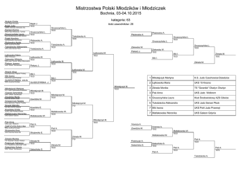 Mistrzostwa Polski Młodzików i Młodziczek Bochnia, 03-04.10.2015 Wojtyło Emilia WKS Śląsk Wrocław Bajak Julia UMKS Ostrowia Ostrowiec Św. Damian Karina MKS Pałac Młodzieży Tarnów Gruszczyńska Laura Klub Środowiskowy AZS Gliwice Pająk Karolina KS Budowlani Sosnowiec Płażewska Agata MKS Juvenia Wrocław Tułodziecka Aleksandra UKS Judo Sensei Płock Łętkowska Maria UKS 15 Krosno Zalewska Wiktoria UKS Judo "Kontra" Mińsk Mazowiecki Piekarz Joanna UKS "Orkan" Sochaczew Wójcik Alicja Klub Sportowy "Hajime" Puławy Miś Iwona UKS Pohl Judo Przemęt GLISZCZYŃSKA JULIA MKS Juvenia Wrocław Mikołajczyk Martyna K.S. Judo Czechowice-Dziedzice Vicenza Amendola UKS "Orkan" Sochaczew Zawidzka Marta Gwardia Bielsko-Biała Grzegorczyk Natalia kategoria: 63 Bajak J. 10:0 Gruszczyńska L. 10:0 Płażewska A. 10:0 Tułodziecka A. Łętkowska M. 10:0 Piekarz J. Miś I. 10:0 GLISZCZYŃSKA J. Mikołajczyk M. 10:0 Zawidzka M. ilość zawodników: 26 Gruszczyńska L. 10:0 KS AZS AWFiS Gdańsk Kowalska Emilia ULKS Judo Kowala Kowala Matlakowska Weronika UKS Galeon Gdynia Paś Anna UKS Judo Wolbrom ZARYCHTA PAULINA MKS Juvenia Wrocław Stryjewska Ewa UKS Ósemka Nowa Sól Zdrada Monika TS "Gwardia" Olsztyn Olsztyn Polańczyk Adrianna K.S."Akademia Judo-Łódź" Łódź Sałasińska Sylwia UKS "Orkan" Sochaczew Kowalska E. 10:0 Matlakowska W. Paś A. 10:0 Stryjewska E. Zdrada M. 10:0 Sałasińska S. Płażewska A. Gruszczyńska L. Tułodziecka A. 10:0 Gruszczyńska L. 10:0 Gruszczyńska L. 10:0 Zalewska W. Piekarz J. Łętkowska M. 10:0 Zalewska W. 10:0 Miś I. Miś I. 10:0 Łętkowska M. 10:0 Zdrada M. 10:0 Zdrada M. Łętkowska M. 10:0 Miś I. 10:0 Mikołajczyk M. 10:0 Mikołajczyk M. 10:0 Klub Sportowy "Hajime" Puławy Nowek Matylda Płażewska A. Tułodziecka A. 10:0 Mikołajczyk M. 7:0 Matlakowska W. 10:0 Mikołajczyk M. 10:0 Paś A. 10:0 Zdrada M. 10:0 K.S. Judo Czechowice-Dziedzice 2 Łętkowska Maria UKS 15 Krosno 3 Zdrada Monika TS "Gwardia" Olsztyn Olsztyn 3 Paś Anna UKS Judo Wolbrom 5 Gruszczyńska Laura Klub Środowiskowy AZS Gliwice 5 Tułodziecka Aleksandra UKS Judo Sensei Płock 7 Miś Iwona UKS Pohl Judo Przemęt 7 Matlakowska Weronika UKS Galeon Gdynia Vicenza A. Zawidzka M. Zdrada M. 7:0 1 Mikołajczyk Martyna Vicenza A. 10:0 Matlakowska W. Matlakowska W. 10:0 Paś A. 10:0 Polańczyk A. Sałasińska S. Sałasińska S. 10:0 Paś A. Paś A. 10:0 Paś A. 10"0 Tułodziecka A.