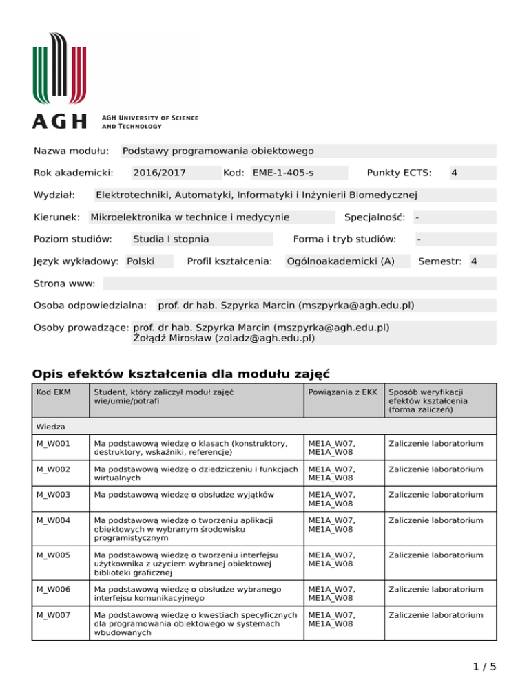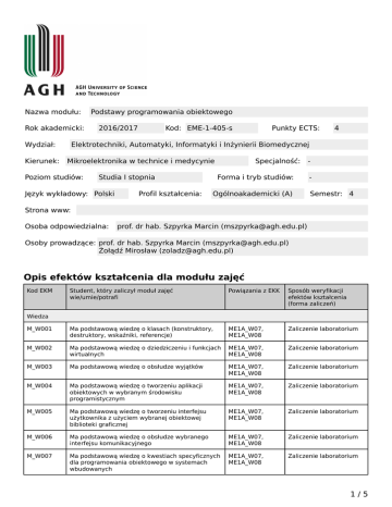 Nazwa modułu: Rok akademicki: Wydział: Kierunek: Podstawy programowania obiektowego 2016/2017 Kod: EME-1-405-s Punkty ECTS: 4 Elektrotechniki, Automatyki, Informatyki i Inżynierii Biomedycznej Mikroelektronika w technice i medycynie Poziom studiów: Studia I stopnia Język wykładowy: Polski Profil kształcenia: Specjalność: Forma i tryb studiów: Ogólnoakademicki (A) Semestr: 4 Strona www: Osoba odpowiedzialna: prof. dr hab. Szpyrka Marcin ([email protected]) Osoby prowadzące: prof. dr hab. Szpyrka Marcin ([email protected]) Żołądź Mirosław ([email protected]) Opis efektów kształcenia dla modułu zajęć Kod EKM Student, który zaliczył moduł zajęć wie/umie/potrafi Powiązania z EKK Sposób weryfikacji efektów kształcenia (forma zaliczeń) M_W001 Ma podstawową wiedzę o klasach (konstruktory, destruktory, wskaźniki, referencje) ME1A_W07, ME1A_W08 Zaliczenie laboratorium M_W002 Ma podstawową wiedzę o dziedziczeniu i funkcjach wirtualnych ME1A_W07, ME1A_W08 Zaliczenie laboratorium M_W003 Ma podstawową wiedzę o obsłudze wyjątków ME1A_W07, ME1A_W08 Zaliczenie laboratorium M_W004 Ma podstawową wiedzę o tworzeniu aplikacji obiektowych w wybranym środowisku programistycznym ME1A_W07, ME1A_W08 Zaliczenie laboratorium M_W005 Ma podstawową wiedzę o tworzeniu interfejsu użytkownika z użyciem wybranej obiektowej biblioteki graficznej ME1A_W07, ME1A_W08 Zaliczenie laboratorium M_W006 Ma podstawową wiedzę o obsłudze wybranego interfejsu komunikacyjnego ME1A_W07, ME1A_W08 Zaliczenie laboratorium M_W007 Ma podstawową wiedzę o kwestiach specyficznych dla programowania obiektowego w systemach wbudowanych ME1A_W07, ME1A_W08 Zaliczenie laboratorium Wiedza 1/5 Karta modułu - Podstawy programowania obiektowego Umiejętności M_U001 Potrafi w podstawowym zakresie budować klasy zawierające konstruktor/destruktor ME1A_U22 Zaliczenie laboratorium M_U002 Potrafi w podstawowym zakresie wykorzystywać wskaźniki do składników klas ME1A_U22 Zaliczenie laboratorium M_U003 Potrafi w podstawowym zakresie wykorzystywać dziedziczenie i funkcje wirtualne ME1A_U22 Zaliczenie laboratorium M_U004 Potrafi w podstawowym zakresie obsługiwać wyjątki ME1A_U22 Zaliczenie laboratorium M_U005 Potrafi w podstawowym zakresie tworzyć aplikacje obiektowe w wybranym środowisku programistycznym ME1A_U22 Zaliczenie laboratorium M_U006 Potrafi w podstawowym zakresie tworzyć interfejs użytkownika z użyciem wybranej biblioteki graficznej ME1A_U22 Zaliczenie laboratorium M_U007 Potrafi w podstawowym zakresie obsługiwać wybrane interfejsy komunikacyjne ME1A_U22 Zaliczenie laboratorium M_U088 Potrafi w podstawowym zakresie tworzyć programy obiektowe dla systemów wbudowanych ME1A_U22 Zaliczenie laboratorium Matryca efektów kształcenia w odniesieniu do form zajęć Konwersatori um Zajęcia seminaryjne Zajęcia praktyczne Zajęcia terenowe Zajęcia warsztatowe Ma podstawową wiedzę o klasach (konstruktory, destruktory, wskaźniki, referencje) + - - - - - - - - - - M_W002 Ma podstawową wiedzę o dziedziczeniu i funkcjach wirtualnych + - - - - - - - - - - M_W003 Ma podstawową wiedzę o obsłudze wyjątków + - - - - - - - - - - M_W004 Ma podstawową wiedzę o tworzeniu aplikacji obiektowych w wybranym środowisku programistycznym + - - - - - - - - - - M_W005 Ma podstawową wiedzę o tworzeniu interfejsu użytkownika z użyciem wybranej obiektowej biblioteki graficznej + - - - - - - - - - - E-learning Ćwiczenia projektowe M_W001 Inne Ćwiczenia laboratoryjne Forma zajęć Ćwiczenia audytoryjne Student, który zaliczył moduł zajęć wie/umie/potrafi Wykład Kod EKM Wiedza 2/5 Karta modułu - Podstawy programowania obiektowego M_W006 Ma podstawową wiedzę o obsłudze wybranego interfejsu komunikacyjnego + - - - - - - - - - - M_W007 Ma podstawową wiedzę o kwestiach specyficznych dla programowania obiektowego w systemach wbudowanych + - - - - - - - - - - M_U001 Potrafi w podstawowym zakresie budować klasy zawierające konstruktor/destruktor - - + - - - - - - - - M_U002 Potrafi w podstawowym zakresie wykorzystywać wskaźniki do składników klas - - + - - - - - - - - M_U003 Potrafi w podstawowym zakresie wykorzystywać dziedziczenie i funkcje wirtualne - - + - - - - - - - - M_U004 Potrafi w podstawowym zakresie obsługiwać wyjątki - - + - - - - - - - - M_U005 Potrafi w podstawowym zakresie tworzyć aplikacje obiektowe w wybranym środowisku programistycznym - - + - - - - - - - - M_U006 Potrafi w podstawowym zakresie tworzyć interfejs użytkownika z użyciem wybranej biblioteki graficznej - - + - - - - - - - - M_U007 Potrafi w podstawowym zakresie obsługiwać wybrane interfejsy komunikacyjne - - + - - - - - - - - M_U088 Potrafi w podstawowym zakresie tworzyć programy obiektowe dla systemów wbudowanych - - + - - - - - - - - Umiejętności Treść modułu zajęć (program wykładów i pozostałych zajęć) Wykład 1. Język C++ (powtórzenie podstawowych wiadomości): typy danych, instrukcje sterujące, funkcje, wskaźniki, obsługa plików. 2. Klasy: składniki klasy, wskaźnik this, konstruktory, destruktory, przeładowanie operatorów, konwersje. 3. Dziedziczenie i funkcje wirtualne. 4. Obsługa wyjątków. 5. Podstawowe informacje o szablonach funkcji i szablonach klas. Wybrane szablony biblioteki standardowej. 6. Biblioteka Qt i rozszerzenia języka C++. Przegląd wybranych klas. Przykłady implementacji aplikacji z interfejsem graficznym. 3/5 Karta modułu - Podstawy programowania obiektowego Ćwiczenia laboratoryjne 1. Tworzenie klas zawierających konstruktor/destruktor. 2. Wykorzystywanie wskaźników do składników klas. 3. Stosowanie dziedziczenie i funkcji wirtualnych. 4. Obsługa wyjątków. 5. Tworzeni interfejsu użytkownika z użyciem wybranej biblioteki graficznej. 6. Obsługa wybranego interfejsu komunikacyjnego. 7. Tworzenie programu kontrolno/pomiarowego dla wybranego systemu wbudowanego z wykorzystaniem technik obiektowych. 8. Tworzenie aplikacji użytkownika 