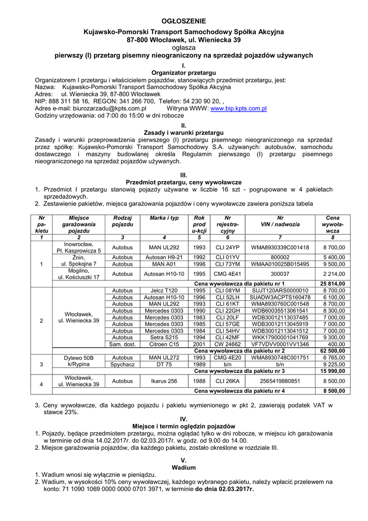 OGŁOSZENIE Kujawsko-Pomorski Transport Samochodowy Spółka Akcyjna 87-800 Włocławek, ul. Wieniecka 39 ogłasza pierwszy (I) przetarg pisemny nieograniczony na sprzedaż pojazdów używanych I. Organizator przetargu Organizatorem I przetargu i właścicielem pojazdów, stanowiących przedmiot przetargu, jest: Nazwa: Kujawsko-Pomorski Transport Samochodowy Spółka Akcyjna Adres: ul. Wieniecka 39, 87-800 Włocławek NIP: 888 311 58 16, REGON: 341 266 700, Telefon: 54 230 90 20, , Adres e-mail: [email protected] Witryna WWW: www.bip.kpts.com.pl Godziny urzędowania: od 7:00 do 15:00 w dni robocze II. Zasady i warunki przetargu Zasady i warunki przeprowadzenia pierwszego (I) przetargu pisemnego nieograniczonego na sprzedaż przez spółkę: Kujawsko-Pomorski Transport Samochodowy S.A. używanych: autobusów, samochodu dostawczego i maszyny budowlanej określa Regulamin pierwszego (I) przetargu pisemnego nieograniczonego na sprzedaż pojazdów używanych. III. Przedmiot przetargu, ceny wywoławcze 1. Przedmiot I przetargu stanowią pojazdy używane w liczbie 16 szt - pogrupowane w 4 pakietach sprzedażowych. 2. Zestawienie pakietów, miejsca garażowania pojazdów i ceny wywoławcze zawiera poniższa tabela Nr pakietu 1 1 Miejsce garażowania pojazdu 2 Inowrocław, Pl. Kasprowicza 5 Żnin, ul. Spokojna 7 Mogilno, ul. Kościuszki 17 Rodzaj pojazdu Marka i typ Nr rejestracyjny 6 Nr VIN / nadwozia 4 Rok prod u-kcji 5 7 Cena wywoławcza 8 3 Autobus MAN UL292 1993 CLI 24YP WMA8930339C001418 8 700,00 Autobus Autobus Autosan H9-21 MAN A01 1992 1996 CLI 01YV CLI 73YM 800002 WMAA010025B015495 5 400,00 9 500,00 Autobus Autosan H10-10 1995 CMG 4E41 300037 2 214,00 Jelcz T120 Autosan H10-10 MAN UL292 Mercedes 0303 Mercedes 0303 Mercedes 0303 Mercedes 0303 Setra S215 Citroen C15 2 Włocławek, ul. Wieniecka 39 Autobus Autobus Autobus Autobus Autobus Autobus Autobus Autobus Sam. dost. 3 Dylewo 50B k/Rypina Autobus Spychacz MAN UL272 DT 75 4 Włocławek, ul. Wieniecka 39 Autobus Ikarus 256 Cena wywoławcza dla pakietu nr 1 1995 CLI 08YM SUJT120ARS0000010 1996 CLI 52LH SUADW3ACPTS160478 1993 CLI 61KT WMA8930760C001548 1990 CLI 22GH WDB60035513061541 1983 CLI 20LF WDB30012113037485 1985 CLI 57GE WDB30012113045919 1984 CLI 54HV WDB30012113041512 1994 CLI 42MF WKK17900001041769 2001 CW 24662 VF7VDVV0001VV1346 Cena wywoławcza dla pakietu nr 2 1993 CMG 4E20 WMA8930748C001751 1989 b/n b/n Cena wywoławcza dla pakietu nr 3 1988 CLI 26KA 2565419880851 Cena wywoławcza dla pakietu nr 4 25 814,00 8 700,00 6 100,00 8 700,00 8 300,00 7 000,00 7 000,00 7 000,00 9 300,00 400,00 62 500,00 6 765,00 9 225,00 15 990,00 8 500,00 8 500,00 3. Ceny wywoławcze, dla każdego pojazdu i pakietu wymienionego w pkt 2, zawierają podatek VAT w stawce 23%. IV. Miejsce i termin oględzin pojazdów 1. Pojazdy, będące przedmiotem przetargu, można oglądać tylko w dni robocze, w miejscu ich garażowania w terminie od dnia 14.02.2017r. do 02.03.2017r. w godz. od 9.00 do 14.00. 2. Miejsce garażowania pojazdów, dla każdego pakietu, zostało określone w rozdziale III. V. Wadium 1. Wadium wnosi się wyłącznie w pieniądzu. 2. Wadium, w wysokości 10% ceny wywoławczej, każdego wybranego pakietu, należy wpłacić przelewem na konto: 71 1090 1069 0000 0000 0701 3971, w terminie do dnia 02.03.2017r. Za skuteczny termin wniesienia wadium wpłacanego na konto uznaje się termin zaksięgowania środków pieniężnych na rachunku bankowym organizatora przetargu. 3. W dokumencie potwierdzającym wpłatę wadium musi być podana informacja, że wadium dotyczy zakupu pojazdów oraz numer pakietu lub pakietów, których wadium dotyczy. 4. Wadium złożone przez oferentów, których oferty nie zostały wybrane lub zostały odrzucone, zwraca się w terminie 5 dni, odpowiednio od dnia dokonania wyboru lub odrzucenia oferty. 5. Wadium złożone przez nabywcę zalicza się na poczet ceny nabycia. 6. Wadium nie podlega zwrotowi w przypadku, gdy: 1/ oferent, którego oferta została wybrana, uchyli się od zapłaty ceny nabycia, 2/ oferent, którego oferta została wybrana uchyli się od podpisania umowy. 7. W przypadku unieważnienia przetargu, wadium zwraca się niezwłocznie wszystkim uczestnikom przetargu. VI. Oferta 1. Oferta zakupu złożona w przetargu powinna zawierać w szczególności: 1/ imię, nazwisko lub nazwę przedsiębiorstwa oraz dane teleadresowe, a w przypadku osób fizycznych prowadzących działalność gospodarczą – również adres zamieszkania, 2/ oferowaną cenę dla wybranego pakietu oraz oddzielnie dla każdego pojazdu w pakiecie, 3/ oświadczenie oferenta, że: a/ zapoznał się ze stanem prawnym i technicznym przedmiotu przetargu lub, że ponosi odpowiedzialność za skutki wynikające z rezygnacji z oględzin, b/ zapoznał się z treścią Regulaminu I przetargu, wzorem umowy i przyjmuje je bez zastrzeżeń, c/ dokona zapłaty ceny nabycia w wyznaczonym terminie i na wskazane konto, 4/ informację o terminie związania ofertą, 5/ podpis pod treścią oferty. 2. Każdy oferent może składać oferty na dowolną ilość pakietów, z tym że na jeden pakiet może złożyć tylko jedną ofertę. Ofertę składa się w formie pisemnej. 3. Składając ofertę na wybrany pakiet (pakiety) oferent wypełnia wzór formularza oferty – odpowiedni dla każdego wybranego pakietu. Wzory formularzy dla poszczególnych pakietów stanowią załączniki o numerach, 1, 2, 3 i 4. 4. Oferta złożona na wybrany pakiet jest ofertą na wszystkie pojazdy wchodzące w skład tego pakietu. 5. Wraz z ofertą oferent składa: 1/ w przypadku podmiotów prowadzących działalność gospodarczą – dokument w postaci aktualnego odpisu z właściwego rejestru lub informację odpowiadającą aktualnemu odpisowi z rejestru przedsiębiorców pobraną zgodnie z art. 4 ust. 4aa ustawy z dnia 20 sierpnia 1997 o Krajowym Rejestrze Sądowym (t. j. Dz. U. z 2016r., poz. 687 ze zm.) albo aktualny wydruk z Centralnej Ewidencji i Informacji o Działalno