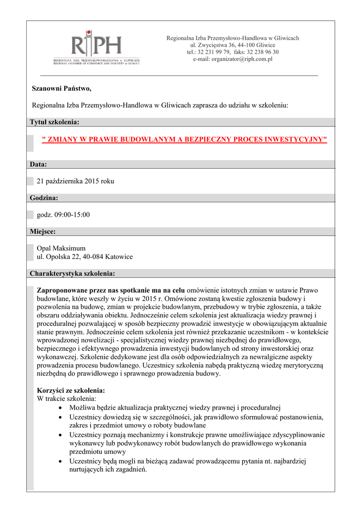 Regionalna Izba Przemysłowo-Handlowa w Gliwicach ul. Zwycięstwa 36, 44-100 Gliwice tel.: 32 231 99 79, faks: 32 238 96 30 e-mail: [email protected] Szanowni Państwo, Regionalna Izba Przemysłowo-Handlowa w Gliwicach zaprasza do udziału w szkoleniu: Tytuł szkolenia: " ZMIANY W PRAWIE BUDOWLANYM A BEZPIECZNY PROCES INWESTYCYJNY" Data: 21 października 2015 roku Godzina: godz. 09:00-15:00 Miejsce: Opal Maksimum ul. Opolska 22, 40-084 Katowice Charakterystyka szkolenia: Zaproponowane przez nas spotkanie ma na celu omówienie istotnych zmian w ustawie Prawo budowlane, które weszły w życiu w 2015 r. Omówione zostaną kwestie zgłoszenia budowy i pozwolenia na budowę, zmian w projekcie budowlanym, przebudowy w trybie zgłoszenia, a także obszaru oddziaływania obiektu. Jednocześnie celem szkolenia jest aktualizacja wiedzy prawnej i proceduralnej pozwalającej w sposób bezpieczny prowadzić inwestycje w obowiązującym aktualnie stanie prawnym. Jednocześnie celem szkolenia jest również przekazanie uczestnikom - w kontekście wprowadzonej nowelizacji - specjalistycznej wiedzy prawnej niezbędnej do prawidłowego, bezpiecznego i efektywnego prowadzenia inwestycji budowlanych od strony inwestorskiej oraz wykonawczej. Szkolenie dedykowane jest dla osób odpowiedzialnych za newralgiczne aspekty prowadzenia procesu budowlanego. Uczestnicy szkolenia nabędą praktyczną wiedzę merytoryczną niezbędną do prawidłowego i sprawnego prowadzenia budowy. Korzyści ze szkolenia: W trakcie szkolenia: Możliwa będzie aktualizacja praktycznej wiedzy prawnej i proceduralnej Uczestnicy dowiedzą się w szczególności, jak prawidłowo sformułować postanowienia, zakres i przedmiot umowy o roboty budowlane Uczestnicy poznają mechanizmy i konstrukcje prawne umożliwiające zdyscyplinowanie wykonawcy lub podwykonawcy robót budowlanych do prawidłowego wykonania przedmiotu umowy Uczestnicy będą mogli na bieżącą zadawać prowadzącemu pytania nt. najbardziej nurtujących ich zagadnień. Regionalna Izba Przemysłowo-Handlowa w Gliwicach ul. Zwycięstwa 36, 44-100 Gliwice tel.: 32 231 99 79, faks: 32 238 96 30 e-mail: [email protected] Prowadzący: Szkolenie poprowadzi Tomasz Sułkowski - prawnik, doktorant i wspólnik zarządzający w Kancelarii Prawnej specjalizującej się w prowadzeniu obsługi prawnej przedsiębiorstw i inwestycji budowlanych. Prowadzący jest praktykiem w dziedzinie prawa gospodarczego, obsługując pod kątem prawnym przedsięwzięcia budowlane od strony wykonawczej i inwestorskiej na rynku prywatnym oraz zamówień publicznych. Jest opiekunem prawnym wielu firm budowlanych na terenie Śląska i województw ościennych. Cena: 260 PLN netto/osobę (dla firm zrzeszonych w Izbie 210 PLN netto/osobę) + 23% VAT W cenie: koszt uczestnictwa, obsługa cateringowa (przerwa kawowa oraz obiad). Zgłoszenia: Uczestnictwo prosimy potwierdzać telefonicznie na numer: 32 231 99 79 lub pocztą elektroniczną na adres: [email protected] do dnia 19 października 2015 roku. Kontakt: Anna Malcherczyk tel. 32 231 99 79 e-mail: [email protected] W związku z ograniczoną ilością miejsc o uczestnictwie w szkoleniu decyduje kolejność zgłoszeń. Organizator zastrzega sobie prawo odwołania szkolenia bez do podawania przyczyny.