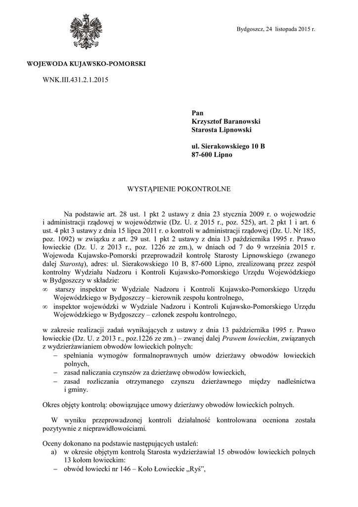 Bydgoszcz, 24 listopada 2015 r. WOJEWODA KUJAWSKO-POMORSKI WNK.III.431.2.1.2015 Pan Krzysztof Baranowski Starosta Lipnowski ul. Sierakowskiego 10 B 87-600 Lipno WYSTĄPIENIE POKONTROLNE Na podstawie art. 28 ust. 1 pkt 2 ustawy z dnia 23 stycznia 2009 r. o wojewodzie i administracji rządowej w województwie (Dz. U. z 2015 r., poz. 525), art. 2 pkt 1 i art. 6 ust. 4 pkt 3 ustawy z dnia 15 lipca 2011 r. o kontroli w administracji rządowej (Dz. U. Nr 185, poz. 1092) w związku z art. 29 ust. 1 pkt 2 ustawy z dnia 13 października 1995 r. Prawo łowieckie (Dz. U. z 2013 r., poz. 1226 ze zm.), w dniach od 7 do 9 września 2015 r. Wojewoda Kujawsko-Pomorski przeprowadził kontrolę Starosty Lipnowskiego (zwanego dalej Starostą), adres: ul. Sierakowskiego 10 B, 87-600 Lipno, zrealizowaną przez zespół kontrolny Wydziału Nadzoru i Kontroli Kujawsko-Pomorskiego Urzędu Wojewódzkiego w Bydgoszczy w składzie: • starszy inspektor w Wydziale Nadzoru i Kontroli Kujawsko-Pomorskiego Urzędu Wojewódzkiego w Bydgoszczy – kierownik zespołu kontrolnego, • inspektor wojewódzki w Wydziale Nadzoru i Kontroli Kujawsko-Pomorskiego Urzędu Wojewódzkiego w Bydgoszczy – członek zespołu kontrolnego, w zakresie realizacji zadań wynikających z ustawy z dnia 13 października 1995 r. Prawo łowieckie (Dz. U. z 2013 r., poz.1226 ze zm.) – zwanej dalej Prawem łowieckim, związanych z wydzierżawianiem obwodów łowieckich polnych: − spełniania wymogów formalnoprawnych umów dzierżawy obwodów łowieckich polnych, − zasad naliczania czynszów za dzierżawę obwodów łowieckich, − zasad rozliczania otrzymanego czynszu dzierżawnego między nadleśnictwa i gminy. Okres objęty kontrolą: obowiązujące umowy dzierżawy obwodów łowieckich polnych. W wyniku przeprowadzonej kontroli działalność kontrolowana oceniona została pozytywnie z nieprawidłowościami. Oceny dokonano na podstawie następujących ustaleń: a) w okresie objętym kontrolą Starosta wydzierżawiał 15 obwodów łowieckich polnych 13 kołom łowieckim: − obwód łowiecki nr 146 – Koło Łowieckie „Ryś”, − − − − − − − − − − − − − − obwód łowiecki nr 159 – Koło Łowieckie Nr 12 „Sokół”, obwód łowiecki nr 160 – Koło Łowieckie Nr 11 „Ponowa”, obwód łowiecki nr 161 – Koło Łowieckie Nr 144 „Żubr”, obwód łowiecki nr 162 – Koło Łowieckie Nr 236 „Żbik”, obwód łowiecki nr 176 – Koło Łowieckie Nr 55 „Dzik”, obwód łowiecki nr 178 – Koło Łowieckie Nr 8 „Bażant”, obwód łowiecki nr 179 – Koło Łowieckie Nr 144 „Żubr”, obwód łowiecki nr 194 – Koło Łowieckie Nr 57 „Odyniec”, obwód łowiecki nr 196 – Koło Łowieckie Nr 54 „Łoś”, obwód łowiecki nr 197 – Koło Łowieckie Nr 58 „Szarak”, obwód łowiecki nr 211 – Koło Łowieckie Nr 224 „Ponowa”, obwód łowiecki nr 212 – Koło Łowieckie Nr 6 „Zys”, obwód łowiecki nr 213 – Koło Łowieckie Nr 59 „Szarak”, obwód łowiecki nr 214 – Koło Łowieckie Nr 224 „Ponowa”, b) umowy dzierżawy zawarte zostały zgodnie z art. 29 ust. 2 Prawa łowieckiego na okres 10 lat, tj,: 14 umów od 1 kwietnia 2007 r. do 31 marca 2017 r., jedna umowa od 1 kwietnia 2013 r. do 31 marca 2023 r. Dla wszystkich obwodów określono termin płatności czynszu dzierżawy jednorazowo w terminie do 31 maja każdego roku. Wydzierżawiający w terminie do 31 marca każdego roku powiadamia wydzierżawiającego o terminie i wysokości opłaty według załączonej faktury. Umowy dzierżawy spełniały wymagania określone w art. 29a ust. 1 Prawa łowieckiego, c) w związku z wejściem w życie od 31.01.2014 r. nowego podziału województwa na obwody łowieckie (uchwała Nr XLV/739/14 Sejmiku Województwa KujawskoPomorskiego z dnia 27 stycznia 2014 r. w sprawie podziału województwa kujawskopomorskiego na obwody łowieckie - Dz. Urz. Woj. Kuj.-Pom. z 2014 r., poz. 290 – zwanej dalej uchwałą z dnia 27.01.2014 r., i dokonaną zmianą numeracji oraz powierzchni obwodów łowieckich nr 152 – na 146, 165 – na 159, 166 – na 160, 167 – na 161, 168 – na 162, 184 – na 176, 186 – na 178, 187 – na 179, 202 – na 194, 204 – na 196, 205 – na 197, 219 – na 211, 220 – na 212, 221 – na 213 i 222 – na 214. Podmiot kontrolowany, 15 aneksami z dnia 03.03.2014 r. dokonał zmian odnoszących się do treści umów pierwotnych dzierżawy obwodów łowieckich dostosowując numerację, powierzchnie użytkowe obwodów do numeracji i powierzchni określonych w ww. uchwale sejmiku. W 7 przypadkach na 15 aneksów stwierdzono podpisy niepełnej reprezentacji kół łowieckich. d) zawarcie umów poprzedzone zostało (zgodnie z art. 29 ust. 1 Prawa łowieckiego) wnioskami Zarządu Okręgowego Polskiego Związku Łowieckiego we Włocławku, oraz pozytywnymi opiniami Kujawsko-Pomorskiej Izby Rolniczej. W czterech przypadkach organy gmin objętych lokalizacją obwodów wynikającą z zapisów uchwały z dnia 27.01.2014 r. wydały pozytywne opinie już po terminie sporządzenia aneksu do umowy, w czterech przypadkach opinie zostały dołączone w trakcie postępowania kontrolnego na wniosek Starosty oraz stwierdzono jednorazowy przypadek braku opinii wójta, e) podmiot kontrolowany przedstawił wyliczenia wysokości czynszów dzierżawnych dla wszystkich wydzierżawionych obwodów łowieckich. Wyliczeń dokonano w oparciu o powierzchnie użytkowe tych obwodów określone w załączniku nr 2 do uchwały z dnia 27.01.2014 r. z wykorzystaniem zasad określonych w art. 30 ust. 2a Prawa 2 łowieckiego oraz § 4 rozporządzenia Ministra Środowiska z dnia 4 grudnia 2002 r. w sprawie zasad kategoryzacji obwodów łowieckich, szczegółowych zasad ustalania czynszu dzierżawnego oraz udziału dzierżawców obwodów łowieckich w kosztach ochrony lasu przed zwierzyną (Dz. U. Nr 210, poz. 1791 ze zm.). Przy ustalaniu stawki czynszu dzierżawnego nie stosowano równowartośc