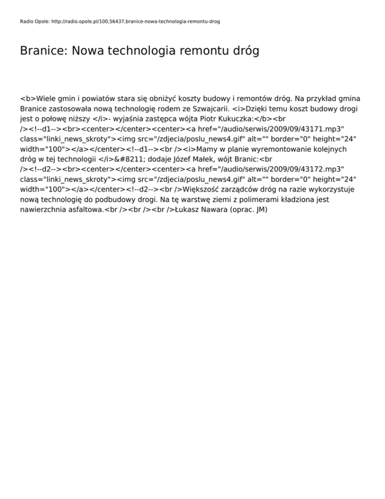 Radio Opole: http://radio.opole.pl/100,56437,branice-nowa-technologia-remontu-drog Branice: Nowa technologia remontu dróg <b>Wiele gmin i powiatów stara się obniżyć koszty budowy i remontów dróg. Na przykład gmina Branice zastosowała nową technologię rodem ze Szwajcarii. <i>Dzięki temu koszt budowy drogi jest o połowę niższy </i>- wyjaśnia zastępca wójta Piotr Kukuczka:</b><br /><!--d1--><br><center></center><center><a href="/audio/serwis/2009/09/43171.mp3" class="linki_news_skroty"><img src="/zdjecia/poslu_news4.gif" alt="" border="0" height="24" width="100"></a></center><!--d1--><br /><i>Mamy w planie wyremontowanie kolejnych dróg w tej technologii </i>– dodaje Józef Małek, wójt Branic:<br /><!--d2--><br><center></center><center><a href="/audio/serwis/2009/09/43172.mp3" class="linki_news_skroty"><img src="/zdjecia/poslu_news4.gif" alt="" border="0" height="24" width="100"></a></center><!--d2--><br />Większość zarządców dróg na razie wykorzystuje nową technologię do podbudowy drogi. Na tę warstwę ziemi z polimerami kładziona jest nawierzchnia asfaltowa.<br /><br /><br />Łukasz Nawara (oprac. JM)