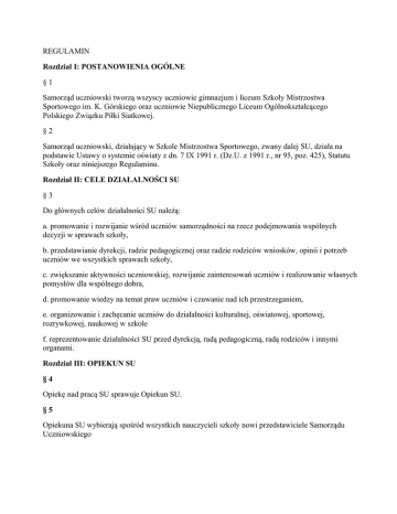 REGULAMIN Rozdział I: POSTANOWIENIA OGÓLNE §1 Samorząd uczniowski tworzą wszyscy uczniowie gimnazjum i liceum Szkoły Mistrzostwa Sportowego im. K. Górskiego oraz uczniowie Niepublicznego Liceum Ogólnokształcącego Polskiego Związku Piłki Siatkowej. §2 Samorząd uczniowski, działający w Szkole Mistrzostwa Sportowego, zwany dalej SU, działa na podstawie Ustawy o systemie oświaty z dn. 7 IX 1991 r. (Dz.U. z 1991 r., nr 95, poz. 425), Statutu Szkoły oraz niniejszego Regulaminu. Rozdział II: CELE DZIAŁALNOŚCI SU §3 Do głównych celów działalności SU należą: a. promowanie i rozwijanie wśród uczniów samorządności na rzecz podejmowania wspólnych decyzji w sprawach szkoły, b. przedstawianie dyrekcji, radzie pedagogicznej oraz radzie rodziców wniosków, opinii i potrzeb uczniów we wszystkich sprawach szkoły, c. zwiększanie aktywności uczniowskiej, rozwijanie zainteresowań uczniów i realizowanie własnych pomysłów dla wspólnego dobra, d. promowanie wiedzy na temat praw uczniów i czuwanie nad ich przestrzeganiem, e. organizowanie i zachęcanie uczniów do działalności kulturalnej, oświatowej, sportowej, rozrywkowej, naukowej w szkole f. reprezentowanie działalności SU przed dyrekcją, radą pedagogiczną, radą rodziców i innymi organami. Rozdział III: OPIEKUN SU §4 Opiekę nad pracą SU sprawuje Opiekun SU. §5 Opiekuna SU wybierają spośród wszystkich nauczycieli szkoły nowi przedstawiciele Samorządu Uczniowskiego §6 Opiekun SU wspomaga jego działalność poprzez: a. wsparcie SU w sprawach merytorycznych i organizacyjnych, b. inspirowanie uczniów do działania, c. pośredniczenie w relacjach SU z dyrekcją oraz radą pedagogiczną. Rozdział IV: ORGANY SU - KOMPETENCJE, ZADANIA, STRUKTURA. §7 Przedstawiciele Samorządów Klasowych: a. identyfikują potrzeby uczniów, b. inspirują i zachęcają uczniów do działalności kulturalnej, oświatowej, sportowej, rozrywkowej, naukowej w szkole, c. informują uczniów o działalności Zarządu SU. Zebranie ogólne Przedstawicieli Samorządów Klasowych wszystkich klas w szkole nazywane jest Radą Samorządów Klasowych. §8 Do obowiązków Przedstawicieli Samorządów Klasowych należy: a. uczestnictwo w pracach Rady Samorządów Klasowych i realizacja celów SU, b. stosowanie się w swojej działalności do wytycznych Zarządu SU lub dyrekcji, c. troska o wysoki poziom organizacyjny i dobrą atmosferę podczas pracy SU, d. włączanie uczniów w ogólnoszkolne działania Zarządu SU. §9 Do kompetencji Rady Samorządów Klasowych należy: a. współpraca z Zarządem SU i Opiekunem SU, b. opiniowanie planu działań i konkretnych inicjatyw Zarządu SU, c. zgłaszanie propozycji działań dla Zarządu SU, d. kontrolowanie zgodności działań Zarządu SU z niniejszym Regulaminem oraz Statutem Szkoły e. rozpatrywanie i opiniowanie semestralnych i rocznych sprawozdań Przewodniczącego SU z działalności SU i innych spraw wniesionych przez członków Zarządu SU pod obrady. Obrady Rady Samorządów Klasowych zwoływane są przez Przewodniczącego Zarządu SU lub na żądanie co najmniej połowy członków Rady Samorządów Klasowych. § 10 Do kompetencji Zarządu SU należy: a. koordynowanie, inicjowanie i organizowanie działań uczniowskich, b. opracowanie rocznego planu działania SU, c. identyfikacja potrzeb uczniów i odpowiadanie na te potrzeby, d. przedstawianie dyrekcji, radzie pedagogicznej, radzie rodziców wniosków, opinii, sugestii członków SU, e. zbieranie i archiwizowanie [w teczce/segregatorze] bieżącej dokumentacji SU. Obrady Zarządu SU zwoływane są przez Przewodniczącego Zarządu SU lub na żądanie co najmniej połowy członków Zarządu SU lub Opiekuna SU przynajmniej raz w miesiącu. § 11 Do obowiązków członków Zarządu SU należy: a. uczestnictwo w pracach Zarządu SU i realizacja celów SU, b. stosowanie się w swojej działalności do wytycznych dyrekcji, c. uwzględnianie w swojej działalności potrzeb uczniów, d. troska o wysoki poziom organizacyjny i dobrą atmosferę podczas pracy SU, e. włączanie uczniów w ogólnoszkolne działania Zarządu SU. § 12 Zarząd SU składa się z: 1. Trzech przewodniczących SU (gimnazjum SMS, liceum SMS, NLOPZPS) 2. Trzech wiceprzewodniczących SU(gimnazjum SMS, liceum SMS, NLOPZPS) § 13 Przewodniczący SU: a. wspólnie kierują pracami Zarządu SU, b. reprezentują SU wobec dyrekcji szkoły, rady pedagogicznej, rady rodziców oraz innych organizacji, c. przedstawiają uczniom, dyrekcji, radzie pedagogicznej, radzie rodziców plan pracy Zarządu SU oraz sprawozdanie końcowe z działalności SU, d. zwołują i przewodniczą zebraniom Zarządu SU oraz Rady Samorządów Klasowych, e. podczas każdego z zebrań Zarządu SU oraz Rady Samorządów Klasowych wskazuje inna osobę sporządzającą notatkę z obrad, która zostaje dodana do archiwum dokumentacji SU. § 14 1. Wybieralne organy SU podejmują decyzje większością głosów w obecności co najmniej połowy członków. 2. Decyzje Rady Samorządów Klasowych oraz Zarządu SU mogą być uchylone przez dyrekcję szkoły gdy są sprzeczne z prawem lub statutem szkoły. § 15 1. Działania SU finansowane są przez Dyrekcję Szkoły. 2. Na wniosek SU, otrzymuje on potrzebne środki finansowe, które rozlicza w oparciu o faktury wystawione na Szkołę Mistrzostwa Sportowego im. Kazimierza Górskiego. 3. SU za zgodą Dyrekcji może korzystać ze szkolnych zasobów. Rozdział V: ORDYNACJA WYBORCZA § 16 Organy wybieralne SU: Zarząd SU, Przedstawiciele Samorządów Klasowych oraz Opiekun SU wybierani są co roku w miesiącu wrześniu. Wybory do organów SU są równe, tajne, powszechne, bezpośrednie i większościowe. § 17 Prawo głosowania (czynne prawo wyborcze) posiada każdy uczeń szkoły. § 18 Prawo kandydowania (bierne prawo wyborcze) na: a. stałego członka Zarządu SU – posiada każdy uczeń szkoły, b. Przedstawiciela Samorządu Klasowego – posiada każdy