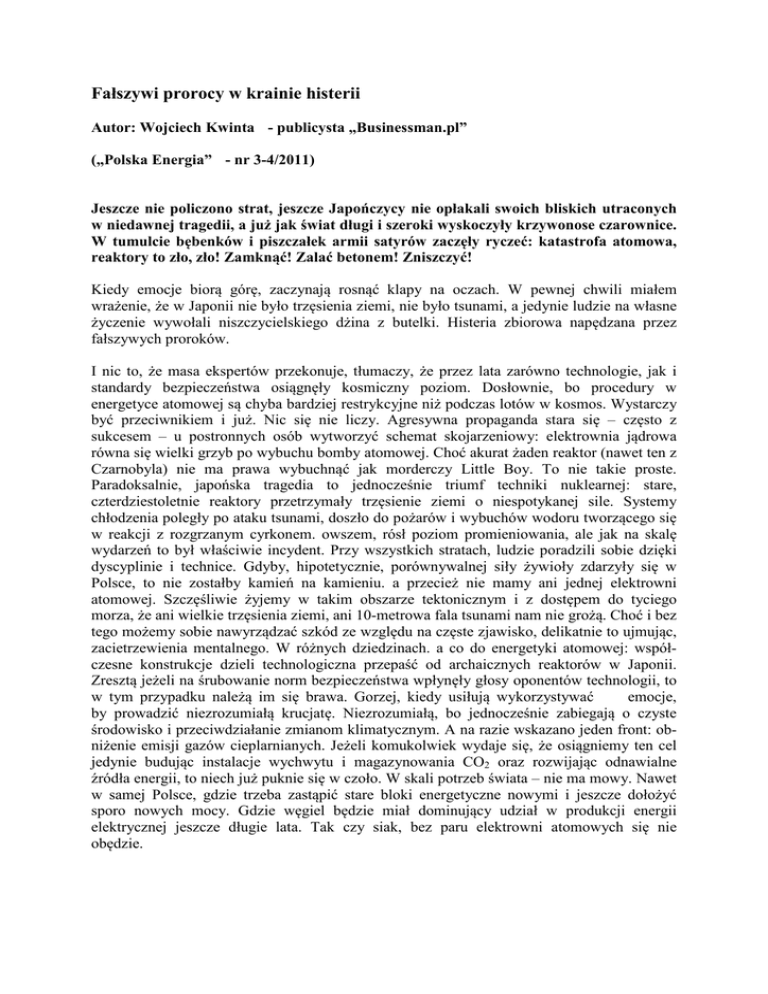 Fałszywi prorocy w krainie histerii Autor: Wojciech Kwinta - publicysta „Businessman.pl” („Polska Energia” - nr 3-4/2011) Jeszcze nie policzono strat, jeszcze Japończycy nie opłakali swoich bliskich utraconych w niedawnej tragedii, a już jak świat długi i szeroki wyskoczyły krzywonose czarownice. W tumulcie bębenków i piszczałek armii satyrów zaczęły ryczeć: katastrofa atomowa, reaktory to zło, zło! Zamknąć! Zalać betonem! Zniszczyć! Kiedy emocje biorą górę, zaczynają rosnąć klapy na oczach. W pewnej chwili miałem wrażenie, że w Japonii nie było trzęsienia ziemi, nie było tsunami, a jedynie ludzie na własne życzenie wywołali niszczycielskiego dżina z butelki. Histeria zbiorowa napędzana przez fałszywych proroków. I nic to, że masa ekspertów przekonuje, tłumaczy, że przez lata zarówno technologie, jak i standardy bezpieczeństwa osiągnęły kosmiczny poziom. Dosłownie, bo procedury w energetyce atomowej są chyba bardziej restrykcyjne niż podczas lotów w kosmos. Wystarczy być przeciwnikiem i już. Nic się nie liczy. Agresywna propaganda stara się – często z sukcesem – u postronnych osób wytworzyć schemat skojarzeniowy: elektrownia jądrowa równa się wielki grzyb po wybuchu bomby atomowej. Choć akurat żaden reaktor (nawet ten z Czarnobyla) nie ma prawa wybuchnąć jak morderczy Little Boy. To nie takie proste. Paradoksalnie, japońska tragedia to jednocześnie triumf techniki nuklearnej: stare, czterdziestoletnie reaktory przetrzymały trzęsienie ziemi o niespotykanej sile. Systemy chłodzenia poległy po ataku tsunami, doszło do pożarów i wybuchów wodoru tworzącego się w reakcji z rozgrzanym cyrkonem. owszem, rósł poziom promieniowania, ale jak na skalę wydarzeń to był właściwie incydent. Przy wszystkich stratach, ludzie poradzili sobie dzięki dyscyplinie i technice. Gdyby, hipotetycznie, porównywalnej siły żywioły zdarzyły się w Polsce, to nie zostałby kamień na kamieniu. a przecież nie mamy ani jednej elektrowni atomowej. Szczęśliwie żyjemy w takim obszarze tektonicznym i z dostępem do tyciego morza, że ani wielkie trzęsienia ziemi, ani 10-metrowa fala tsunami nam nie grożą. Choć i bez tego możemy sobie nawyrządzać szkód ze względu na częste zjawisko, delikatnie to ujmując, zacietrzewienia mentalnego. W różnych dziedzinach. a co do energetyki atomowej: współczesne konstrukcje dzieli technologiczna przepaść od archaicznych reaktorów w Japonii. Zresztą jeżeli na śrubowanie norm bezpieczeństwa wpłynęły głosy oponentów technologii, to w tym przypadku należą im się brawa. Gorzej, kiedy usiłują wykorzystywać emocje, by prowadzić niezrozumiałą krucjatę. Niezrozumiałą, bo jednocześnie zabiegają o czyste środowisko i przeciwdziałanie zmianom klimatycznym. A na razie wskazano jeden front: obniżenie emisji gazów cieplarnianych. Jeżeli komukolwiek wydaje się, że osiągniemy ten cel jedynie budując instalacje wychwytu i magazynowania CO2 oraz rozwijając odnawialne źródła energii, to niech już puknie się w czoło. W skali potrzeb świata – nie ma mowy. Nawet w samej Polsce, gdzie trzeba zastąpić stare bloki energetyczne nowymi i jeszcze dołożyć sporo nowych mocy. Gdzie węgiel będzie miał dominujący udział w produkcji energii elektrycznej jeszcze długie lata. Tak czy siak, bez paru elektrowni atomowych się nie obędzie. Siła histerii napędzana przez złych proroków to codzienność naszej cywilizacji. Gdy zobaczyłem 60 tys. Niemców demonstrujących przeciw energetyce atomowej, opadły mi ręce. Czego oni chcą? żeby nie było trzęsień, ani tsunami? Ja też chcę i co z tego? Gdy przeczytałem, że niemiecki premier Brandenburgii i władze Berlina liczą, że Polska zrezygnuje z programu atomowego – obśmiałem się jak norka. Co za różnica, czy reaktory będą u nas, czy na Białorusi? Żadna. Przyznam, że ucieszyła mnie zdecydowana postawa naszego rządu, deklarującego kontynuację planów budowy elektrowni atomowej, i opozycji, która też wykazała się rozsądkiem. Jasny punkt, szczególnie w porównaniu z reakcjami władz paru innych krajów. Ale cóż, taki jest współczesny świat, że ciągle mamy się czegoś bać: reaktorów, modyfikowanej żywności, dioksyn, akrylamidów, ultrafioletu, braku ozonu, braku cukru i wódki sprzedawanej na stacjach benzynowych. Dlatego warto sobie czasem przypomnieć słowa poety: gdy wieje wiatr historii, ludziom jak pięknym ptakom rosną skrzydła, natomiast trzęsą się portki pętakom.