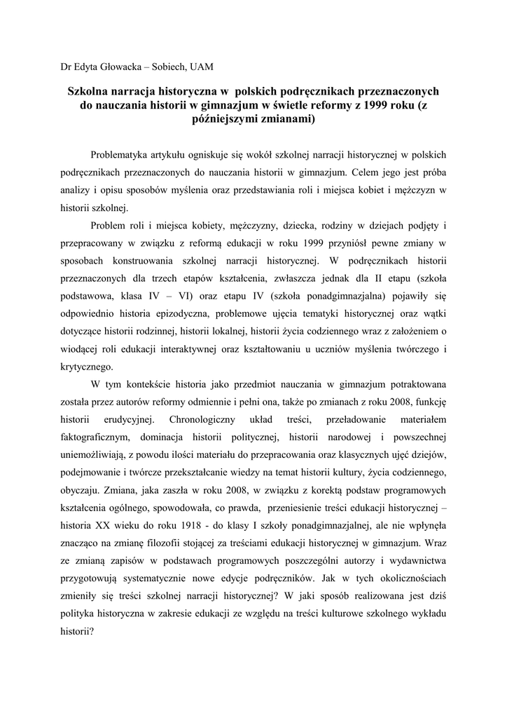 Dr Edyta Głowacka – Sobiech, UAM Szkolna narracja historyczna w polskich podręcznikach przeznaczonych do nauczania historii w gimnazjum w świetle reformy z 1999 roku (z późniejszymi zmianami) Problematyka artykułu ogniskuje się wokół szkolnej narracji historycznej w polskich podręcznikach przeznaczonych do nauczania historii w gimnazjum. Celem jego jest próba analizy i opisu sposobów myślenia oraz przedstawiania roli i miejsca kobiet i mężczyzn w historii szkolnej. Problem roli i miejsca kobiety, mężczyzny, dziecka, rodziny w dziejach podjęty i przepracowany w związku z reformą edukacji w roku 1999 przyniósł pewne zmiany w sposobach konstruowania szkolnej narracji historycznej. W podręcznikach historii przeznaczonych dla trzech etapów kształcenia, zwłaszcza jednak dla II etapu (szkoła podstawowa, klasa IV – VI) oraz etapu IV (szkoła ponadgimnazjalna) pojawiły się odpowiednio historia epizodyczna, problemowe ujęcia tematyki historycznej oraz wątki dotyczące historii rodzinnej, historii lokalnej, historii życia codziennego wraz z założeniem o wiodącej roli edukacji interaktywnej oraz kształtowaniu u uczniów myślenia twórczego i krytycznego. W tym kontekście historia jako przedmiot nauczania w gimnazjum potraktowana została przez autorów reformy odmiennie i pełni ona, także po zmianach z roku 2008, funkcję historii erudycyjnej. Chronologiczny układ treści, przeładowanie materiałem faktograficznym, dominacja historii politycznej, historii narodowej i powszechnej uniemożliwiają, z powodu ilości materiału do przepracowania oraz klasycznych ujęć dziejów, podejmowanie i twórcze przekształcanie wiedzy na temat historii kultury, życia codziennego, obyczaju. Zmiana, jaka zaszła w roku 2008, w związku z korektą podstaw programowych kształcenia ogólnego, spowodowała, co prawda, przeniesienie treści edukacji historycznej – historia XX wieku do roku 1918 - do klasy I szkoły ponadgimnazjalnej, ale nie wpłynęła znacząco na zmianę filozofii stojącej za treściami edukacji historycznej w gimnazjum. Wraz ze zmianą zapisów w podstawach programowych poszczególni autorzy i wydawnictwa przygotowują systematycznie nowe edycje podręczników. Jak w tych okolicznościach zmieniły się treści szkolnej narracji historycznej? W jaki sposób realizowana jest dziś polityka historyczna w zakresie edukacji ze względu na treści kulturowe szkolnego wykładu historii?