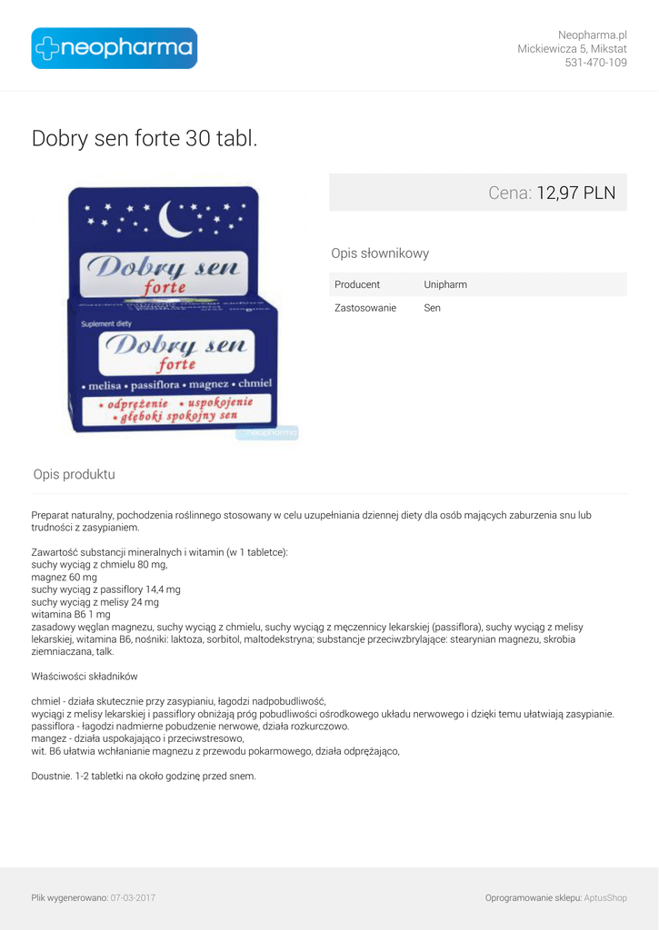 Neopharma.pl Mickiewicza 5, Mikstat 531-470-109 Dobry sen forte 30 tabl. Cena: 12,97 PLN Opis słownikowy Producent Unipharm Zastosowanie Sen Opis produktu Preparat naturalny, pochodzenia roślinnego stosowany w celu uzupełniania dziennej diety dla osób mających zaburzenia snu lub trudności z zasypianiem. Zawartość substancji mineralnych i witamin (w 1 tabletce): suchy wyciąg z chmielu 80 mg, magnez 60 mg suchy wyciąg z passiflory 14,4 mg suchy wyciąg z melisy 24 mg witamina B6 1 mg zasadowy węglan magnezu, suchy wyciąg z chmielu, suchy wyciąg z męczennicy lekarskiej (passiflora), suchy wyciąg z melisy lekarskiej, witamina B6, nośniki: laktoza, sorbitol, maltodekstryna; substancje przeciwzbrylające: stearynian magnezu, skrobia ziemniaczana, talk. Właściwości składników chmiel - działa skutecznie przy zasypianiu, łagodzi nadpobudliwość, wyciągi z melisy lekarskiej i passiflory obniżają próg pobudliwości ośrodkowego układu nerwowego i dzięki temu ułatwiają zasypianie. passiflora - łagodzi nadmierne pobudzenie nerwowe, działa rozkurczowo. mangez - działa uspokajająco i przeciwstresowo, wit. B6 ułatwia wchłanianie magnezu z przewodu pokarmowego, działa odprężająco, Doustnie. 1-2 tabletki na około godzinę przed snem. Plik wygenerowano: 07-03-2017 Powered by TCPDF (www.tcpdf.org) Oprogramowanie sklepu: AptusShop