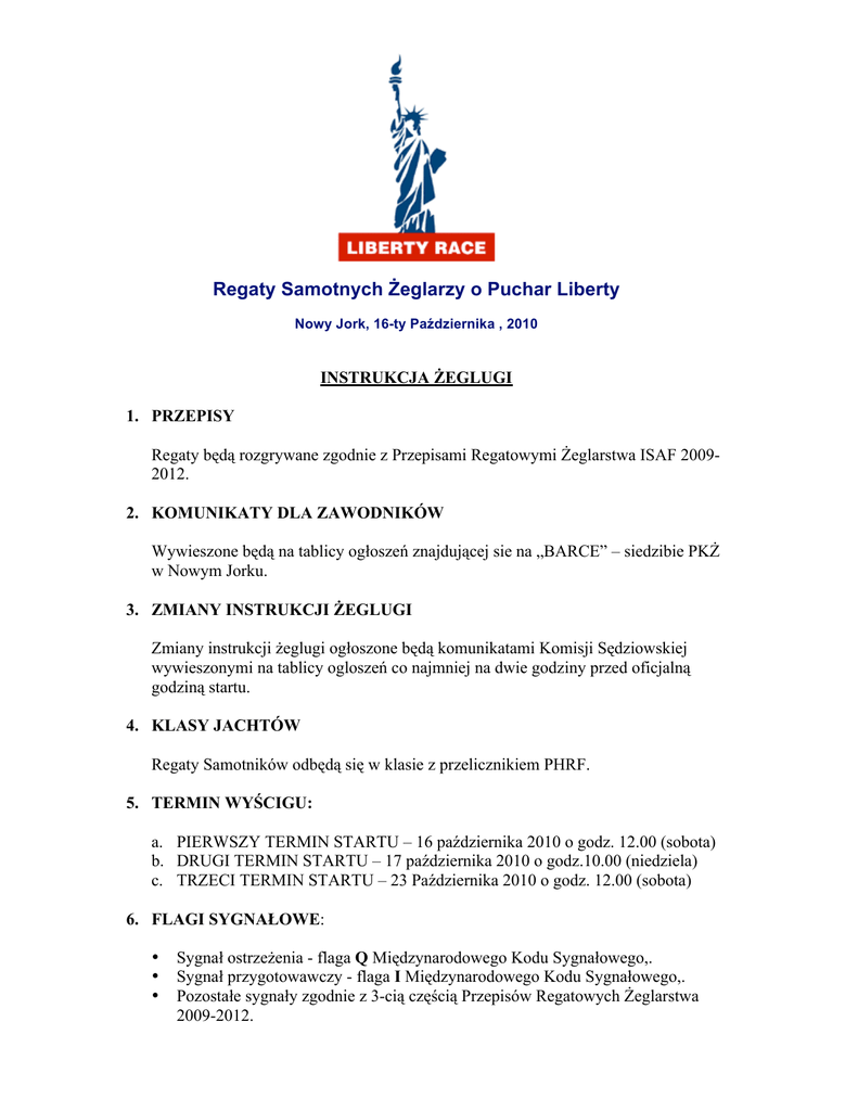 Regaty Samotnych Żeglarzy o Puchar Liberty Nowy Jork, 16-ty Października , 2010 INSTRUKCJA ŻEGLUGI 1. PRZEPISY Regaty będą rozgrywane zgodnie z Przepisami Regatowymi Żeglarstwa ISAF 20092012. 2. KOMUNIKATY DLA ZAWODNIKÓW Wywieszone będą na tablicy ogłoszeń znajdującej sie na „BARCE” – siedzibie PKŻ w Nowym Jorku. 3. ZMIANY INSTRUKCJI ŻEGLUGI Zmiany instrukcji żeglugi ogłoszone będą komunikatami Komisji Sędziowskiej wywieszonymi na tablicy ogloszeń co najmniej na dwie godziny przed oficjalną godziną startu. 4. KLASY JACHTÓW Regaty Samotników odbędą się w klasie z przelicznikiem PHRF. 5. TERMIN WYŚCIGU: a. PIERWSZY TERMIN STARTU – 16 października 2010 o godz. 12.00 (sobota) b. DRUGI TERMIN STARTU – 17 października 2010 o godz.10.00 (niedziela) c. TRZECI TERMIN STARTU – 23 Października 2010 o godz. 12.00 (sobota) 6. FLAGI SYGNAŁOWE: • • • Sygnał ostrzeżenia - flaga Q Międzynarodowego Kodu Sygnałowego,. Sygnał przygotowawczy - flaga I Międzynarodowego Kodu Sygnałowego,. Pozostałe sygnały zgodnie z 3-cią częścią Przepisów Regatowych Żeglarstwa 2009-2012. 7. ZNAKI W regatach wykorzystana będzie boja pneumatyczna koloru pomarańczowego i znaki nawigacyjne. 8. START Procedura startowa. Sygnał Ostrzeżenia Przygotowania Jednej minuty Startu Flaga i sygnał dzwiękowy Flaga Q, 1 sygnał dźwiękowy Flaga I, 1 sygnał dźwiękowy Opuszczenie flagi przygotowania, 1 długi sygnał dźwiękowy Opuszczenie flagi przygotowania, 1 sygnał dźwiękowy Minuty do startu 5 4 1 0 Linia startu wyznaczona będzie w rejonie boji R – „20”. Pozycja boji R – „20”: Lat: 40° 34.184’ N Lon: 073° 53.910’ W Linia startu wyznaczona będzie pomiędzy masztem na statku KS (komisji sędziowskiej) i boją pneumatyczną koloru pomarańczowego i ograniczona boją i statkiem KS. Start odbywać się będzie w kierunku pierwszego znaku kursowego boji R – „10”. Boję należy okrążyć zostawiając ją po prawej burcie. Pozycja boji R – „10”: Lat: 40° 34.220’ N Lon: 074° 00.707’ W Odwołania startu /falstarty/ sygnalizowane bedą zgodnie z art.29 Przepisów Regatowych Żeglarstwa 2009-2012. • Indywidualne – flaga X MKS i jeden sygnał dźwiękowy • Generalne – flaga „1 zastępczy” MKS i dwa sygnały dźwiękowe. Komisja sędziowska nie podaje numeru ani nazwy jachtu, który naruszył procedurę startową. 9. TRASA Trasa A: Z lini startu ( okolice boji R – „20”) do boji R – „10”(prawa burta), w kierunku Verrazano Bridge. Pozycja środka mostu Verrazano Bridge: Lat: 40 stopni 36.38’ N Lon: 074 stopni 02.68’ W Metę stanowić będzie boja R – „2” i statek komisji regatowej. Współrzędne boji R –„2” Lat: 40 stopni 37.357” N Lon: 074 stopni 02.810 W Trasa B ( SKRÓCONA): Z lini startu ( okolice boji R – „20”) do boji R – „10”(prawa burta), Pozycja boji R – „10”: Lat: 40 stopni 34.220’ N Lon: 074 stopni 00.707’ W Metę stanowić będzie boja R – „10” i statek komisji regatowej. TRASA A lub B wyznaczona będzie przed sygnałem ostrzegawczym w postaci flagi z napisem litery A lub B na statku komisji sędziowskiej. Skrócenie trasy po starcie, podane będzie przez radio UKF na kanale 78 i przez telefony komórkowe do uczestników regat. Ponadto w pobliżu boji R –„10” na statku KS wywieszona bedzie flaga „S” MKS 10. META Meta wyznaczona będzie namiernikiem na statku Komisji Sędziowskiej i • • Trasa A -boją numer R – „2” Trasa B – boją numer R –„10” Statek ustawiony na lini mety oznaczony będzie flagą koloru niebieskiego. 11. OŚWIADCZENIA Przejście lini mety w obecności statku KS jest równoznaczne z oświadczeniem o prawidłowym przebyciu trasy. 12. JACHTY WYCOFUJĄCE SIĘ Z WYŚCIGU. Jacht wycofujący sie z wyścigu powinien niezwłocznie powiadomić o tym KS lub organizatora. i podać miejsce swojego pobytu. 13. PROTESTY Sygnalizowane są zgodnie z Przepisami Regatowymi Żeglarstwa 2009-2012 i muszą być zlożone w formie pisemnej do KS w ciągu 30 minut po przybyciu Komisji do portu. Przepis 61..1(a) PRŻ ma zastosowanie. Termin i miejsce rozpatrywania protestu będzie ogłoszone komunikatem. 14. PUNKTACJA Jachty klasyfikowane bedą na podstawie skorygowanego czasu przekroczenia mety i przelicznika PHRF. Wyniki ogłoszone będą na tablicy ogłoszeń regat i ogłoszone publicznie na uroczystości rozdania nagród. 15. PRZEPISY PORZĄDKOWE a. Zawodnicy uczestniczą w regatach całkowicie na własne ryzyko – Patrz przepis 4, /Dezyzja o uczestniczeniu w wyścigu/ b. Organizator nie przyjmuje żadnej odpowiedzialności za uszkodzenia sprzętu lub uszkodzenia osób lub śmierci w związku z regatami, przed podczas lub po ragatach. c. Jacht ma obowiązek zgłosić się przed startem do KS przepływając w pobliżu statku. Nie zgłoszenie się może być potraktowane jako DNC /nie przybył na pole startowe/. d. Wprowadza się obowiązek zgłaszania zamiaru protestowania oraz informacje o wykonaniu kary po przekroczeniu linii mety. e. KS prowadzić będzie nasłuch na kanale 78. 16. NAGRODY Zakończenie regat i uroczyste rozdanie nagród odbędzie się w dniu wyścigu na „Barce”, siedzibie PKŻ lub w innym dniu i miejscu podanym w osobnym zawiadomieniu. ŻYCZYMY WSZYSTKIM UCZESTNIKOM REGAT ZADOWOLENIA I SUKCESÓW! Komisja Sędziowska i Organizatorzy Regat