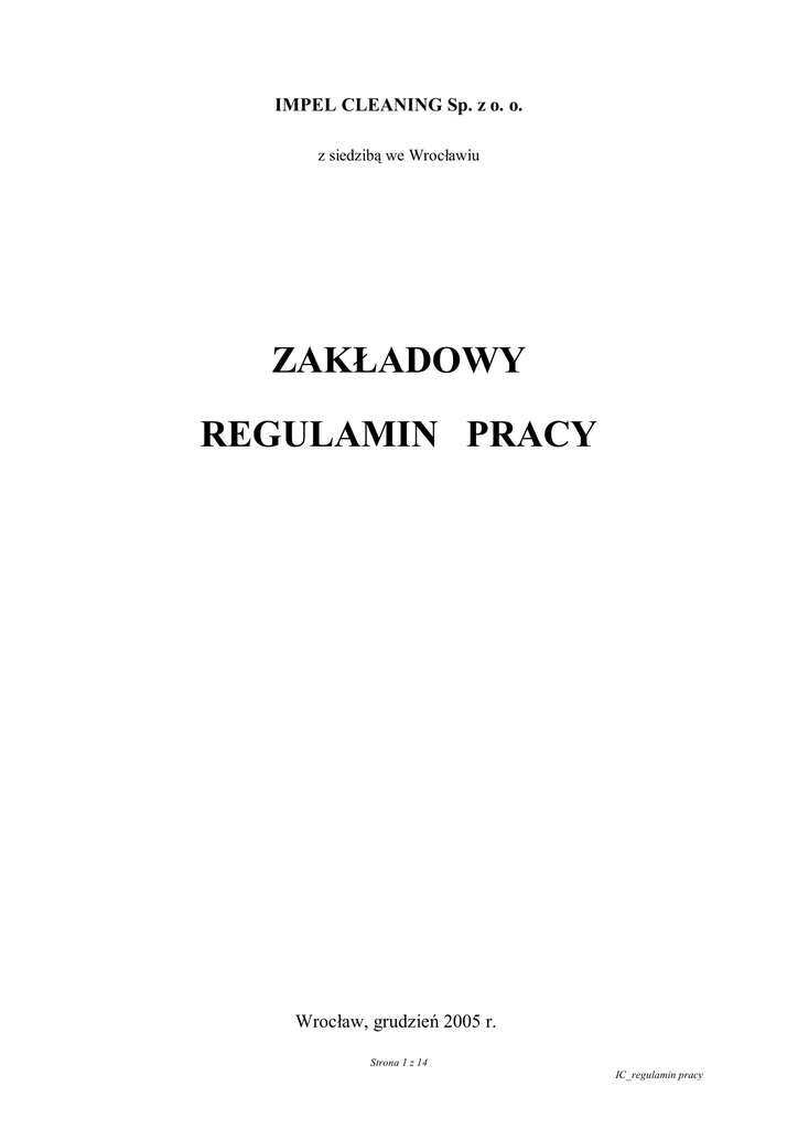 IMPEL CLEANING Sp. z o. o. z siedzibą we Wrocławiu ZAKŁADOWY REGULAMIN PRACY Wrocław, grudzień 2005 r. Strona 1 z 14 IC_regulamin pracy SPIS TREŚCI ROZDZIAŁ I. POSTANOWIENIA OGÓLNE........................................................................................... 2 ROZDZIAŁ II. OBOWIĄZKI PRACOWNIKÓW, OBOWIĄZKI PRACODAWCY.............................. 2 ROZDZIAŁ III. CZAS PRACY PRACOWNIKÓW.................................................................................... 4 ROZDZIAŁ IV. ORGANIZACJA PRACY PRACOWNIKÓW.................................................................. 7 ROZDZIAŁ V. TERMIN, MIEJSCE I CZAS WYPŁATY WYNAGRODZENIA ..................................... 8 ROZDZIAŁ VI. ZASADY USPRAWIEDLIWIANIA NIEOBECNOŚCI W PRACY ............................... 8 ORAZ UDZIELANIA PRACOWNIKOM ZWOLNIEŃ OD PRACY.......................................................... 8 ROZDZIAŁ VII. URLOPY........................................................................................................................... 9 ROZDZIAŁ IX. ODPOWIEDZIALNOŚĆ MATERIALNA PRACOWNIKÓW...................................... 11 ROZDZIAŁ X. OBOWIĄZKI DOTYCZĄCE BEZPIECZEŃSTWA I HIGIENY PRACY .................... 12 ORAZ OCHRONY PRZECIWPOŻAROWEJ ........................................................................................... 12 ROZDZIAŁ XI. PROFILAKTYCZNA OCHRONA ZDROWIA PRACOWNIKÓW.............................. 14 ROZDZIAŁ XII. POSTANOWIENIA KOŃCOWE .................................................................................. 14 ZAŁĄCZNIK NR 1A DO ZRP. WYKAZ PRAC SZCZEGÓLNIE UCIĄŻLIWYCH LUB SZKODLIWYCH DLA ZDROWIA KOBIET. ZAŁĄCZNIK NR 2 DO ZAKŁADOWEGO REGULAMINU PRACY. RÓWNE TRAKTOWANIE W ZATRUDNIENIU. ROZDZIAŁ I. Postanowienia ogólne Na podstawie art.104 §1 ustawy z dnia 26 czerwca 1974r. Kodeks Pracy (Dz.U. z 1974, nr 24, poz. 141 z późn. zm.), Rozporządzenia Ministra Pracy Płacy i Polityki Socjalnej z dnia 15.05.1996r. w sprawie sposobu usprawiedliwiania nieobecności w pracy i udzielania pracownikom zwolnień od pracy (Dz.U. z 1996, nr 60 poz. 281), ustawy z dnia 27.08.1997r. o rehabilitacji zawodowej i społecznej oraz zatrudnianiu osób niepełnosprawnych (Dz.U. nr 123 poz. 776 z późn. zmianami) ustala się, co następuje: 1. Zakładowy Regulamin Pracy ma zastosowanie do Pracowników Impel Cleaning Sp. z o. o., zwanej w dalszej części Pracodawcą, zatrudnionych na podstawie umowy o pracę. 2. Umowa o pracę powinna zostać zawarta na piśmie i określać strony umowy, rodzaj umowy, datę jej zawarcia oraz warunki pracy i płacy, w szczególności: rodzaj pracy, miejsce wykonywania pracy, wynagrodzenie za pracę odpowiadające rodzajowi pracy, ze wskazaniem składników wynagrodzenia, wymiar czasu pracy i termin rozpoczęcia pracy. Do dokonywania czynności prawnych wynikających ze stosunku pracy w imieniu pracodawcy uprawniona jest osoba, która została do tego upoważniona w drodze udzielonego pełnomocnictwa lub powierzonego zakresu obowiązków zatwierdzonego przez osoby uprawnione do reprezentowania Spółki zgodnie z wpisem w Krajowym Rejestrze Sądowym. 3. Zakładowy Regulamin Pracy, zwany dalej Regulaminem, obowiązuje wszystkich Pracowników bez względu na rodzaj wykonywanej pracy i zajmowane stanowisko. ROZDZIAŁ II. Obowiązki Pracowników, obowiązki Pracodawcy 1. Do podstawowych obowiązków każdego Pracownika wynikających z zakresu powierzonych mu obowiązków należy: 1.1 wykorzystanie w pełni czasu pracy na realizację obowiązków zawodowych, Strona 2 z 14 IC_regulamin pracy 1.2 rzetelne i efektywne wykonywanie pracy oraz dążenie do uzyskiwania jak najlepszych wyników w pracy, 1.3 przestrzeganie ustalonego w spółce czasu pracy i porządku, 1.4 dokładne i sumienne wykonywanie poleceń przełożonych, 1.5 przestrzeganie przepisów i zasad bezpieczeństwa i higieny pracy oraz przepisów przeciwpożarowych, 1.6 dbanie o dobro i mienie spółki oraz używanie go zgodnie z przeznaczeniem, 1.7 przestrzeganie przepisów o zwalczaniu nieuczciwej konkurencji i tajemnicy pracodawcy, 1.8 dążenie do uzyskania w pracy jak najlepszych wyników i przejawiania w tym celu odpowiedniej inicjatywy, 1.9 przestrzeganie zasad współżycia społecznego, 1.10 niepalenie papierosów na terenie spółki poza miejscami wyznaczonymi. 1.11 wykorzystywanie narzędzi pracodawcy, w tym komputera i poczty elektronicznej, wyłącznie do celów służbowych. 1.12 nie używanie słów wulgarnych, niegrzecznych ani niestosownych w stosunku do przełożonych, współpracowników oraz osób trzecich 1.13 nie przyjmowanie na adres zakładu pracy prywatnej korespondencji 1.14 nie wykorzystywanie wewnętrznego obiegu poczty do nadawania prywatnej korespondencji Za szczególnie rażące naruszenie ustalonego porządku i dyscypliny pracy uważa się w szczególności: 2.1 złe i niedbałe wykonywanie pracy oraz niszczenie mienia spółki, 2.2 wykonywanie w służbowym czasie pracy, prac nie związanych z zadaniami wynikającymi ze stosunku pracy, 2.3 zakłócanie porządku i spokoju w miejscu pracy, 2.4 opuszczanie miejsca pracy bez usprawiedliwienia i spóźnianie się do pracy, 2.5 stawianie się do pracy w stanie po użyciu alkoholu lub spożywanie alkoholu w czasie pracy lub w miejscu pracy, 2.6 niewykonywanie poleceń służbowych przełożonych, 2.7 niewłaściwy stosunek do przełożonych i pozostałych pracowników, 2.8 nieprzestrzeganie przepisów i zasad bhp oraz przepisów przeciwpożarowych, 2.9 wyrządzenie zakładowi szkody lub zagarnięcie mienia spółki (kradzież mienia lub współudział w kradzieży), 2.10 rozpowszechnianie informacji, których ujawnienie mogłoby narazić Pracodawcę na szkodę, w tym dotyczących wynagrodzenia za pracę, jako chronionych prawnie dóbr osobistych Pracowników, 2.11 nieterminowe załatwianie dokumentów, 2.12 naruszenie tajemnicy Pracodawcy. 2. 3. Pracodawca ma prawo rozwiązać z Pracow