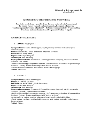 Załącznik nr 1 do zaproszenia do złożenia ofert SZCZEGÓŁOWY OPIS PRZEDMIOTU ZAMÓWIENIA Przedmiot zamówienia – projekt, druk, dostawa materiałów informacyjnych dla Gminy Nysa w ramach realizacji zadania „Kampania edukacyjna w zakresie gospodarowania odpadami” – dofinansowana ze środków Wojewódzkiego Funduszu Ochrony Środowiska i Gospodarki Wodnej w Opolu SZCZEGÓŁY TECHNICZNE 1. ULOTKI (wg projektu ) Opis przedmiotu: ulotka informacyjna, projekt graficzny zostanie dostarczony przez Zamawiającego, Format: składany na 3 części do formatu A5 (148 x 210 mm) Ilość kolorów: 4+4 (CMYK), Papier: kreda, błysk 130 g/m2 Technologia: druk offsetowy Wymagania dodatkowe: Przedstawić Zamawiającemu do akceptacji jakości wykonania minimum 1 szt. ulotki, - każda ulotka musi być zaopatrzona napisem „Dofinansowano ze środków Wojewódzkiego Funduszu Ochrony Środowiska i Gospodarki Wodnej w Opolu” - ostateczna treść ulotki może ulec zmianie przez Zamawiającego Nakład: 20.000 szt. 2. PLAKATY Opis przedmiotu: plakat informacyjny, Format: A2, (420 x 594 mm) Ilość kolorów: 4+0 (CMYK), błysk dwustronny, Papier: kreda, błysk 170 g/m2 Technologia: druk offsetowy Wymagania dodatkowe: Przedstawić Zamawiającemu do akceptacji jakości wykonania minimum 2 projekty plakatów (wydrukowane), - każdy plakat musi być zaopatrzony napisem „Dofinansowano ze środków Wojewódzkiego Funduszu Ochrony Środowiska i Gospodarki Wodnej w Opolu” - szata graficzna plakatu powinna odpowiadać szacie graficznej ulotki i tablicy - Treść plakatu – spójna z treścią ulotki, ostateczna treść plakatu może ulec zmianie przez Zamawiającego Nakład: 200 szt. 3. TABLICE INFORMACYJNE Opis przedmiotu: tablica informacyjna, Format: A3, (297 x 420 mm) Ilość kolorów: 4+0 (CMYK), błysk jednostronny, Papier: wydruk A3 na folii + klejenie na płytę PCV min. 2 mm, Wymagania dodatkowe: Przedstawić Zamawiającemu do akceptacji jakości wykonania minimum 1 projekty tablicy, - każdy tablica musi być zaopatrzony napisem „Dofinansowano ze środków Wojewódzkiego Funduszu Ochrony Środowiska i Gospodarki Wodnej w Opolu”, - szata graficzna tablicy powinna odpowiadać szacie graficznej ulotki i plakatu, - Treść tablicy – spójna z treścią ulotki i plakatu, ostateczna treść tablicy może ulec zmianie przez Zamawiającego Nakład: 200 szt.