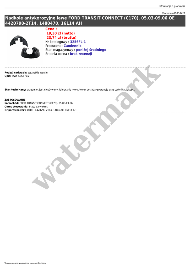 Informacje o produkcie Utworzono 07-03-2017 Nadkole antykorozyjne lewe FORD TRANSIT CONNECT (C170), 05.03-09.06 OE 4420790-2T14, 1480470, 16114 AH Cena : 19,30 zł (netto) 23,74 zł (brutto) Rodzaj nadwozia: Wszystkie wersje Opis: lewe ABS+PCV er m ar k Nr katalogowy : 3256FL-1 Producent : Zamiennik Stan magazynowy : poniżej średniego Średnia ocena : brak recenzji Stan techniczny: przedmiot jest nieużywany, fabrycznie nowy, towar posiada gwarancję oraz certyfikat jakości. w at ZASTOSOWANIE Samochód: FORD TRANSIT CONNECT (C170), 05.03-09.06 Okres stosowania: Przez cały okres Nr porównawczy OEM: 4420790-2T14, 1480470, 16114 AH Wygenerowano w programie www.oscGold.com