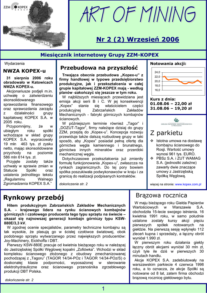 Nr 2 (2) Wrzesień 2006 Miesięcznik internetowy Grupy ZZM-KOPEX Wydarzenia NWZA KOPEX-u 31 sierpnia 2006 roku obradowało w Katowicach NWZA KOPEX-u. Akcjonariusze podjęli m.in. uchwałę o zatwierdzeniu skonsolidowanego sprawozdania finansowego oraz sprawozdania zarządu z działalności grupy kapitałowej KOPEX S.A. w 2005 roku. Przypomnijmy, że w ubiegłym roku spółki wchodzące w skład grupy KOPEX S.A. wypracowały 19 mln 463 tys. zł zysku netto, mając skonsolidowane przychody na poziomie 586 mln 614 tys. zł. Przyjęte zostały także uchwały w sprawie zmian w Statucie Spółki oraz ustalenia jednolitego tekstu „Regulaminu Walnego Zgromadzenia KOPEX S.A.” Przebudowa na przyszłość Trwająca obecnie przebudowa „Kopex-u” z firmy handlowej w typowe przedsiębiorstwo produkcyjne, jak i przekształcenia w całej grupie kapitałowej ZZM-KOPEX mają - według planów -zakończyć się jeszcze w tym roku. W najbliższych miesiącach przewidziana jest emisja akcji serii B i C. W jej konsekwencji „Kopex” stanie się właścicielem części produkcyjnej Zabrzańskich Zakładów Mechanicznych - fabryki górniczych kombajnów ścianowych. W późniejszym terminie również „Tagor” i „DOZUT-Tagor”, firmy należące dzisiaj do grupy ZZM, przejdą do „Kopex-u”. Koncepcja rozwoju przewiduje także dalszą rozbudowę grupy w taki sposób, aby „Kopex” posiadał pełną ofertę dla górnictwa węgla kamiennego i brunatnego, górnictwa innych minerałów oraz przeróbki mechanicznej węgla. Dotychczasowe przekształcenia już zmieniły formułę funkcjonowania „Kopex-u”, zwłaszcza na rynkach zagranicznych. Do tej pory bowiem spółka poszukiwała podwykonawców w kraju i za granicą do realizacji podpisanych kontraktów. dokończenie str. 2 Notowania akcji: 24,0 22,0 20,0 18,0 16,0 Kurs z dnia: 01.08.06 – 22,00 zł 31.08.06 – 19,20 zł Z parkietu Istotna umowa na dostawę kombajnu ścianowego do Rosji. Wartość umowy wynosi 961 tys. EURO. PBSz S.A. i ZUT WAMAG S.A. (jednostki zależne) zawarły dwie znaczące umowy z Jastrzębską Spółką Węglową. więcej na stronie: www.kopex.com.pl Brązowa rocznica Rynkowy przebój Hitem produkcyjnym Zabrzańskich Zakładów Mechanicznych S.A. - krajowego lidera na rynku ścianowych kombajnów górniczych i czołowego producenta tego typu sprzętu na świecie – okazał się najnowszej generacji kombajn górniczy typu KSW880E/3,3 kV. W zgodnej ocenie specjalistów, parametry techniczne kombajnu są tak wysokie, że plasują go w ścisłej czołówce światowej, obok podobnego sprzętu wytwarzanego przez największych producentów: Joy-Machinery, Eickhoffa i DBT. Pierwszy KSW-880E pracuje od kwietnia bieżącego roku w należącej do Jastrzębskiej Spółki Węglowej kopalni „Zofiówka”. Wchodzi w skład kompleksu ścianowego złożonego z obudowy zmechanizowanej pochodzącej z „Tagoru” (TAGOR 14/34-POz i TAGOR 14/34-POz/S) o doskonałej klasie podporności, wyposażonej w sterowanie elektrohydrauliczne oraz ścianowego przenośnika zgrzebłowego produkcji DBT Polska. dokończenie str. 2 1 W maju bieżącego roku Giełda Papierów Wartościowych w Warszawie S.A. obchodziła 15-lecie swojego istnienia. 16 kwietnia 1991 roku, w samo południe ustalone zostały kursy akcji pięciu pierwszych spółek notowanych na giełdzie. Na pierwszą sesję wpłynęło 112 zleceń kupna i sprzedaży, a łączny obrót wyniósł 1.990 zł. W pierwszym roku działania giełdy łączny obrót akcjami wyniósł 30 mln zł, czyli tyle ile dziś w pierwszych 30 minutach handlu. Akcje KOPEX S.A. zadebiutowały na warszawskim parkiecie 4 czerwca 1998 roku, a to oznacza, że akcje Spółki są notowane od 8 lat, zatem firma obchodzi brązową rocznicę giełdowego bytu. Miesięcznik internetowy Grupy ZZM-KOPEX Dokończenie ze str. 1 Dokończenie ze str. 1 Rynkowy przebój Przebudowa na przyszłość - To jeden z najlepszych polskich kombajnów górniczych, posiadający bardzo dużą moc, ogromne możliwości wydobywcze, zdolny do wybierania bardzo niskich ścian – wylicza dyrektor do spraw handlowych ZZM Andrzej Smutek. O sprzęcie ze znakiem grupy ZZM – zarówno kombajnie jak i obudowie - w samych superlatywach wypowiadają się przedstawiciele JSW i kopalni „Zofiówka”. W ich opinii, wynikającej z kilkumiesięcznej eksploatacji, zainstalowane maszyny i urządzenia pozwalają na osiągnięcie bardzo dużego wydobycia przy zachowaniu najwyższych norm bezpieczeństwa. Po tak udanym debiucie można spodziewać się kolejnych zamówień najnowszego kombajnu i obudowy, w tym także ze strony zagranicznych inwestorów. (Więcej na temat KSW-880E czytaj na stronie www.zzm.com.pl) Dzisiaj w ramach umów sprzedaje to, co wytwarza grupa ZZM-KOPEX, w tym głównie kombajny ścianowe, obudowy zmechanizowane, urządzenia do mechanicznej przeróbki węgla oraz kompletne wyposażenie dla kopań odkrywkowych. Grupa ma wszelkie podstawy – zarówno produkcyjne jak i handlowe - by odnieść kolejne sukcesy rynkowe i zwiększyć swoje wpływy w kraju i za granicą. W ostatnich trzech latach ZZM zainwestowały około 150 mln zł w bardzo nowoczesne technologie i urządzenia. W branży górniczej to ewenement na skalę światową. Z drugiej zaś strony, atutem są wieloletnie kontakty handlowe, zwłaszcza „Kopex-u”, z inwestorami na największych rynkach górniczych świata, co zwiększa szanse rynkowych podbojów. Najwyższą jakość prezentuje dostarczany odbiorcom sprzęt. ZZM są krajowym liderem w produkcji ścianowych kombajnów górniczych i czołowym producentem tego typu wyposażenia kopalń na świecie. Światowym liderem jest również „Tagor” – producent obudów zmechanizowanych, który niedawno zainwestował w nowoczesne technologie. Tak dobrych stojaków hydraulicznych jak w tej firmie, nikt na świecie nie wytwarza. W dalszej perspektywie również „Wamag”, który został dokapitalizowany, jak i „Kopex-FAMAGO