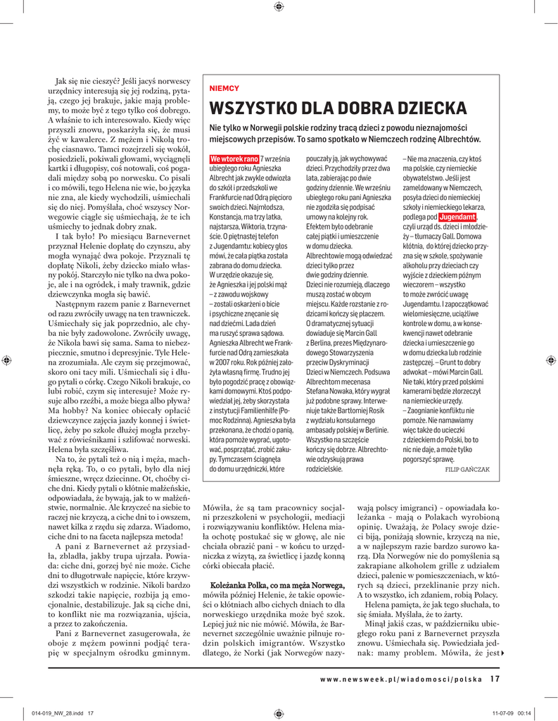 Jak się nie cieszyć? Jeśli jacyś norwescy urzędnicy interesują się jej rodziną, pytają, czego jej brakuje, jakie mają problemy, to może być z tego tylko coś dobrego. A właśnie to ich interesowało. Kiedy więc przyszli znowu, poskarżyła się, że musi żyć w kawalerce. Z mężem i Nikolą trochę ciasnawo. Tamci rozejrzeli się wokół, posiedzieli, pokiwali głowami, wyciągnęli kartki i długopisy, coś notowali, coś pogadali między sobą po norwesku. Co pisali i co mówili, tego Helena nie wie, bo języka nie zna, ale kiedy wychodzili, uśmiechali się do niej. Pomyślała, choć wszyscy Norwegowie ciągle się uśmiechają, że te ich uśmiechy to jednak dobry znak. I tak było! Po miesiącu Barnevernet przyznał Helenie dopłatę do czynszu, aby mogła wynająć dwa pokoje. Przyznali tę dopłatę Nikoli, żeby dziecko miało własny pokój. Starczyło nie tylko na dwa pokoje, ale i na ogródek, i mały trawnik, gdzie dziewczynka mogła się bawić. Następnym razem panie z Barnevernet od razu zwróciły uwagę na ten trawniczek. Uśmiechały się jak poprzednio, ale chyba nie były zadowolone. Zwróciły uwagę, że Nikola bawi się sama. Sama to niebezpiecznie, smutno i depresyjnie. Tyle Helena zrozumiała. Ale czym się przejmować, skoro oni tacy mili. Uśmiechali się i długo pytali o córkę. Czego Nikoli brakuje, co lubi robić, czym się interesuje? Może rysuje albo rzeźbi, a może biega albo pływa? Ma hobby? Na koniec obiecały opłacić dziewczynce zajęcia jazdy konnej i świetlicę, żeby po szkole dłużej mogła przebywać z rówieśnikami i szlifować norweski. Helena była szczęśliwa. Na to, że pytali też o nią i męża, machnęła ręką. To, o co pytali, było dla niej śmieszne, wręcz dziecinne. Ot, choćby ciche dni. Kiedy pytali o kłótnie małżeńskie, odpowiadała, że bywają, jak to w małżeństwie, normalnie. Ale krzyczeć na siebie to raczej nie krzyczą, a ciche dni to i owszem, nawet kilka z rzędu się zdarza. Wiadomo, ciche dni to na faceta najlepsza metoda! A pani z Barnevernet aż przysiadła, zbladła, jakby trupa ujrzała. Powiada: ciche dni, gorzej być nie może. Ciche dni to długotrwałe napięcie, które krzywdzi wszystkich w rodzinie. Nikoli bardzo szkodzi takie napięcie, rozbija ją emocjonalnie, destabilizuje. Jak są ciche dni, to konflikt nie ma rozwiązania, ujścia, a przez to zakończenia. Pani z Barnevernet zasugerowała, że oboje z mężem powinni podjąć terapię w specjalnym ośrodku gminnym. NIEMCY WSZYSTKO DLA DOBRA DZIECKA Nie tylko w Norwegii polskie rodziny tracą dzieci z powodu nieznajomości miejscowych przepisów. To samo spotkało w Niemczech rodzinę Albrechtów. We wtorek rano 7 września ubiegłego roku Agnieszka Albrecht jak zwykle odwiozła do szkół i przedszkoli we Frankfurcie nad Odrą pięcioro swoich dzieci. Najmłodsza, Konstancja, ma trzy latka, najstarsza, Wiktoria, trzynaście. O piętnastej telefon z Jugendamtu: kobiecy głos mówi, że cała piątka została zabrana do domu dziecka. W urzędzie okazuje się, że Agnieszka i jej polski mąż – z zawodu wojskowy – zostali oskarżeni o bicie i psychiczne znęcanie się nad dziećmi. Lada dzień ma ruszyć sprawa sądowa. Agnieszka Albrecht we Frankfurcie nad Odrą zamieszkała w 2007 roku. Rok później założyła własną firmę. Trudno jej było pogodzić pracę z obowiązkami domowymi. Ktoś podpowiedział jej, żeby skorzystała z instytucji Familienhilfe (Pomoc Rodzinna). Agnieszka była przekonana, że chodzi o panią, która pomoże wyprać, ugotować, posprzątać, zrobić zakupy. Tymczasem ściągnęła do domu urzędniczki, które pouczały ją, jak wychowywać dzieci. Przychodziły przez dwa lata, zabierając po dwie godziny dziennie. We wrześniu ubiegłego roku pani Agnieszka nie zgodziła się podpisać umowy na kolejny rok. Efektem było odebranie całej piątki i umieszczenie w domu dziecka. Albrechtowie mogą odwiedzać dzieci tylko przez dwie godziny dziennie. Dzieci nie rozumieją, dlaczego muszą zostać w obcym miejscu. Każde rozstanie z rodzicami kończy się płaczem. O dramatycznej sytuacji dowiaduje się Marcin Gall z Berlina, prezes Międzynarodowego Stowarzyszenia przeciw Dyskryminacji Dzieci w Niemczech. Podsuwa Albrechtom mecenasa Stefana Nowaka, który wygrał już podobne sprawy. Interweniuje także Bartłomiej Rosik z wydziału konsularnego ambasady polskiej w Berlinie. Wszystko na szczęście kończy się dobrze. Albrechtowie odzyskują prawa rodzicielskie. Mówiła, że są tam pracownicy socjalni przeszkoleni w psychologii, mediacji i rozwiązywaniu konfliktów. Helena miała ochotę postukać się w głowę, ale nie chciała obrazić pani – w końcu to urzędniczka z wizytą, za świetlicę i jazdę konną córki obiecała płacić. Koleżanka Polka, co ma męża Norwega, mówiła później Helenie, że takie opowieści o kłótniach albo cichych dniach to dla norweskiego urzędnika może być szok. Lepiej już nic nie mówić. Mówiła, że Barnevernet szczególnie uważnie pilnuje rodzin polskich imigrantów. Wszystko dlatego, że Norki ( jak Norwegów nazy- – Nie ma znaczenia, czy ktoś ma polskie, czy niemieckie obywatelstwo. Jeśli jest zameldowany w Niemczech, posyła dzieci do niemieckiej szkoły i niemieckiego lekarza, podlega pod Jugendamt , czyli urząd ds. dzieci i młodzieży – tłumaczy Gall. Domowa kłótnia, do której dziecko przyzna się w szkole, spożywanie alkoholu przy dzieciach czy wyjście z dzieckiem późnym wieczorem – wszystko to może zwrócić uwagę Jugendamtu. I zapoczątkować wielomiesięczne, uciążliwe kontrole w domu, a w konsekwencji nawet odebranie dziecka i umieszczenie go w domu dziecka lub rodzinie zastępczej. – Grunt to dobry adwokat – mówi Marcin Gall. Nie taki, który przed polskimi kamerami będzie złorzeczył na niemieckie urzędy. – Zaognianie konfliktu nie pomoże. Nie namawiamy więc także do ucieczki z dzieckiem 