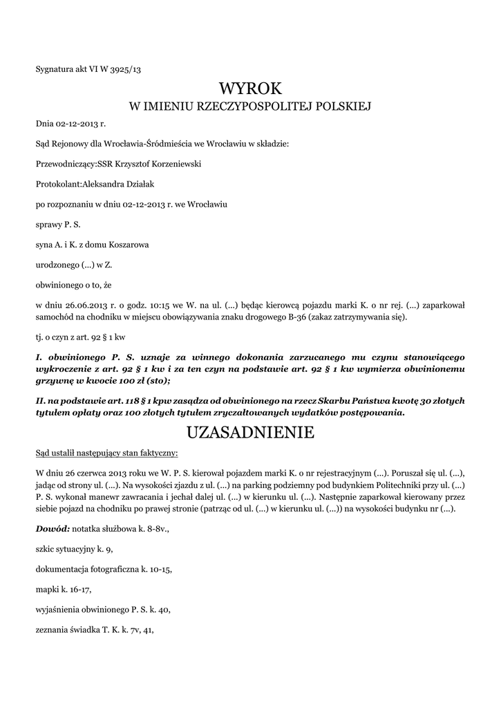 Sygnatura akt VI W 3925/13 WYROK W IMIENIU RZECZYPOSPOLITEJ POLSKIEJ Dnia 02-12-2013 r. Sąd Rejonowy dla Wrocławia-Śródmieścia we Wrocławiu w składzie: Przewodniczący:SSR Krzysztof Korzeniewski Protokolant:Aleksandra Działak po rozpoznaniu w dniu 02-12-2013 r. we Wrocławiu sprawy P. S. syna A. i K. z domu Koszarowa urodzonego (...) w Z. obwinionego o to, że w dniu 26.06.2013 r. o godz. 10:15 we W. na ul. (...) będąc kierowcą pojazdu marki K. o nr rej. (...) zaparkował samochód na chodniku w miejscu obowiązywania znaku drogowego B-36 (zakaz zatrzymywania się). tj. o czyn z art. 92 § 1 kw I. obwinionego P. S. uznaje za winnego dokonania zarzucanego mu czynu stanowiącego wykroczenie z art. 92 § 1 kw i za ten czyn na podstawie art. 92 § 1 kw wymierza obwinionemu grzywnę w kwocie 100 zł (sto); II. na podstawie art. 118 § 1 kpw zasądza od obwinionego na rzecz Skarbu Państwa kwotę 30 złotych tytułem opłaty oraz 100 złotych tytułem zryczałtowanych wydatków postępowania. UZASADNIENIE Sąd ustalił następujący stan faktyczny: W dniu 26 czerwca 2013 roku we W. P. S. kierował pojazdem marki K. o nr rejestracyjnym (...). Poruszał się ul. (...), jadąc od strony ul. (...). Na wysokości zjazdu z ul. (...) na parking podziemny pod budynkiem Politechniki przy ul. (...) P. S. wykonał manewr zawracania i jechał dalej ul. (...) w kierunku ul. (...). Następnie zaparkował kierowany przez siebie pojazd na chodniku po prawej stronie (patrząc od ul. (...) w kierunku ul. (...)) na wysokości budynku nr (...). Dowód: notatka służbowa k. 8-8v., szkic sytuacyjny k. 9, dokumentacja fotograficzna k. 10-15, mapki k. 16-17, wyjaśnienia obwinionego P. S. k. 40, zeznania świadka T. K. k. 7v, 41, Na chodniku, po prawej stronie przy skrzyżowaniu ul. (...) oraz ul. (...) ( w kierunku ul. (...)) znajduje się znak drogowy B-36 (zakaz zatrzymywania się) z zastrzeżeniem „nie dotyczy zatok”. Dowód: notatka służbowa k. 8-8v., szkic sytuacyjny k. 9, dokumentacja fotograficzna k. 11, mapa k.16-17, zeznania świadka T. K. k. 7v., 41, wyjaśnienia obwinionego P. S. k. 40, P. S. jest żonaty, ma na utrzymaniu troje dzieci, jest zatrudniony na stanowisku kierownika temperatur za wynagrodzeniem w wysokości 3500 złotych. Nie był karany za czyny przeciwko bezpieczeństwu w ruchu drogowym. P. S. nie był leczony psychiatrycznie, neurologicznie ani odwykowo. Dowód: wywiad środowiskowy k. 33, informacja o wpisach w ewidencji kierowców k. 39, wyjaśnienia obwinionego k. 40 Obwiniony P. S. w postępowaniu jurysdykcyjnym przyznał się do popełnienia zarzucanego mu czynu. Wyjaśnił, że zaparkował pojazd przy ul. (...) w miejscu obowiązywania znaku B-36. Wyjaśnił, że nie zauważył tego znaku, gdyż zawracał na ul. (...), a ponadto w tym miejscu stał inny pojazd, co jego zdaniem świadczyło o możliwości parkowania w tym miejscu. Dowód: wyjaśnienia obwinionego k. 40 Sąd zważył, co następuje: Ustalając opisany wyżej stan faktyczny Sąd oparł się na dowodach w postaci: notatki służbowej, dokumentacji fotograficznej, map, zeznaniach funkcjonariusza Straży Miejskiej T. K. oraz wyjaśnieniach obwinionego P. S.. Odnosząc się do wyjaśnień obwinionego wskazać należy, iż przyznał się on do popełnienia zarzuconego mu wykroczenia i potwierdził, że zaparkował swój pojazd w miejscu i w sposób opisany we wniosku o ukaranie. Jego wyjaśnienia korespondują z pozostałym materiałem dowodowym zgromadzonym w sprawie i jako wiarygodne zasługiwały na uwzględnienie. Podobnie na uwzględnienie zasługiwały zeznania funkcjonariusza Straży Miejskiej T. K.. Jest on osobą obcą w stosunku do obwinionego, a zdarzenie będące przedmiotem niniejszego postępowania ujawnił w toku wykonywania czynności służbowych. Biorąc pod uwagę fakt, że jego zeznania pozostają zbieżne z wyjaśnieniami obwinionego, a także pozostałym materiałem dowodowym, należało uznać je za wiarygodne. Z wyjaśnieniami obwinionego oraz zeznaniami T. K. korespondował również pozostały materiał dowodowy zgromadzony w niniejszej sprawie – notatka służbowa, jak również mapy oraz dokumentacja fotograficzna. Ich wiarygodność nie była przez strony postępowania, wobec czego zostały one uwzględnione. Stosownie do treści art. 92 § 1 k.w. kto nie stosuje się do znaku lub sygnału drogowego albo do sygnału lub polecenia osoby uprawnionej do kierowania ruchem lub do kontroli ruchu drogowego podlega karze grzywny albo karze nagany. Natomiast zgodnie z § 28 ust. 2 oraz ust. 3 pkt rozporządzenia Ministra Infrastruktury oraz Spraw Wewnętrznych i Administracji z dnia 31 lipca 2002 r. w sprawie znaków i sygnałów drogowych (Dz. U. Nr 170, poz. 1393 z późn. zm.) znak B-36 „zakaz zatrzymywania się" oznacza zakaz zatrzymania pojazdu i dotyczy on tej strony drogi, po której znak się znajduje, z wyjątkiem miejsc, gdzie za pomocą znaku dopuszcza się postój lub zatrzymanie. Stosownie do treści art. 5 k.w. wykroczenie można popełnić zarówno umyślnie jak i nieumyślnie, chyba że ustawa przewiduje odpowiedzialność tylko za wykroczenie umyślne. Wykroczenie stypizowane w art. 92 § 1 k.w. z uwagi na brak szczegółowej regulacji w tym przedmiocie może być popełnione zarówno w sposób umyślny, jak i nieumyślny. Nie ulega wątpliwości, że działanie obwinionego P. S. nie miało charakteru umyślnego. Z uwagi na fakt, iż wykonał on manewr zawracania i nie widział znaku B-36 nie jest możliwe przyjęcie, że działał on z zamiarem bezpośrednim, czy też wynikowym popełnienia wykroczenia. Jednakże w ocenie Sądu obwiniony nie zachował wymaganych w danych okolicznościach reguł ostrożności. Obwiniony jako osoba posiadająca uprawnienia do kierowania pojazdów niewątpliwie powinien mieć świadomość tego, że znak zakazujący parkowania po prawej stronie ul. (...) mógł znajdować się przy początku ulicy (przy wjeździe od strony ul. (...)). T