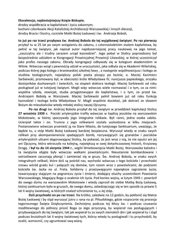 Ekscelencjo, najdostojniejszy Księże Biskupie, drodzy współbracia w kapłaństwie i życiu zakonnym, kochani członkowie Akcji Katolickiej Archidiecezji Warszawskiej i innych diecezji, drodzy Bracia i Siostry, czciciele Matki Bożej Łaskawej i św. Andrzeja Boboli, to już po raz trzeci przybywa św. Andrzej Bobola do tej wyjątkowej świątyni. Po raz pierwszy przybył tu w 25 lat po swym wstąpieniu do zakonu, z czternastoletnim stażem kapłaństwa, by pełnić w tej świątyni, jak napisał autor najobszerniejszej pracy naukowej na jego temat, „zaszczytny ale i trudny zarazem urząd kaznodziei”. Jego pobyt w Stolicy poprzedzony był bezpośrednio udziałem w Kongregacji Prowincjalnej Prowincji Litewskiej, w której uczestniczył jako profes naszego zakonu. Obrady kongregacji odbywały się w kolegium akademickim w Wilnie. Wówczas wziął z pewnością udział w uroczystości, jaka odbyła się w Akademii Wileńskiej, podczas której jego kolega z braniewskiej szkolnej ławy , a następnie współnowicjusz i kolega ze studiów teologicznych, największy polski poeta piszący po łacinie, o. Maciej Kazimierz Sarbiewski, promowany był, w obecności króla Władysława IV, nuncjusza papieskiego, orszaku dostojników duchownych i świeckich, na stopień doktora teologii. Maciej Sarbiewski od roku posługiwał już w tutejszej świątyni. Mogli więc wówczas wiele rozmawiać i o tym, co za nimi: wspólna szkoła, nowicjat, studia przygotowujące do kapłaństwa, i o tym, co przed św. Andrzejem Bobolą w Warszawie. Maciej Sarbiewski pełnił bowiem już od roku funkcję kaznodziei i teologa króla Władysława IV. Mogli wspólnie dociekać, jak dotrzeć ze słowem Bożym do mieszkańców wtedy młodej stolicy naszej Ojczyzny. Po raz drugi św. Andrzej Bobola przybył do tej świątyni w przeddzień kapitulacji Stolicy 27 września 1939 r. Pociski artyleryjskie trafiły wówczas w kaplicę jezuitów na warszawskim Mokotowie, w której spoczywały jego integralne relikwie. Byli ranni, jedna osoba zabita. Ucierpiał także i on. Trumna z jego relikwiami została uszkodzona w kilku miejscach. Postanowiono wówczas przenieść ją na Stare Miasto, do tutejszego Sanktuarium, uważając, że będzie tu, u stóp Matki Bożej Łaskawej bardziej bezpieczna. Wyruszył wtedy w znaku swych relikwii przy akompaniamencie spadających bomb, rozrywających się granatów i pocisków artyleryjskich ulicami dogorywającej Stolicy, by pokazać, że jest wraz z nią, że nie opuści ani jej ani Ojczyzny, która wkroczyła na kolejną, największą w swej dotychczasowej historii, Krzyżową Drogę. I był tu do 14 sierpnia 1944 r., wigilii Wniebowzięcia Matki Bożej. Warszawska katedra i ta świątynia objęte były wówczas walkami powstańczymi. Nieustannie bombardowane i ostrzeliwane zaczynają płonąć i zamieniać się w gruzy. Św. Andrzej Bobola, w znaku swych integralnych relikwii, które dziś są pośród nas, wychodzi wówczas z tego kościoła i przechodzi znowu wśród gradu kul i palących się domów, tym razem wraz z powstańcami, do podziemi kościoła św. Jacka na ul. Freta. Solidarny z przeżywającymi największe zagrożenie życia; towarzyszący stającym na pograniczu życia i śmierci, dodający otuchy uczestnikom Powstania Warszawskiego, błagający Boga o ocalenie ich życia. Pod koniec wojny, w lutym 1945 r. powrócił do swego domu na warszawskim Mokotowie i wtedy zaprosił do siebie Matkę Bożą Łaskawą, której sanktuarium było w gruzach, do swego domu, odwdzięczając się w ten sposób za prawie 5 lat II wojny światowej, w których znalazł schronienie tu, u Jej stóp. Dziś przychodzi on po raz trzeci. Na krótko, zaledwie na 12 godzin, by pokłonić się Matce Bożej Łaskawej i by stąd wyruszyć jutro z rana na pl. Piłsudskiego, gdzie rozpocznie się procesja tegorocznego Święta Dziękczynienia. Zechciejmy podczas tej Mszy św. i podczas czuwania modlitewnego do północy prosić Boga za Jego przyczyną, by wspierał nas posługujących i przybywających do tej świątyni, tak jak wspierał tu za swych ziemskich dni i jak wspierał tu i stąd podczas brutalnych lat II wojny światowej tych, którzy wtedy tu posługiwali i tu przychodzili, by ocalić, wzmocnić, czy ugruntować swą wiarę.