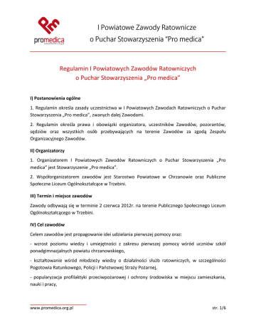 Regulamin I Powiatowych Zawodów Ratowniczych o Puchar Stowarzyszenia „Pro medica” I) Postanowienia ogólne 1. Regulamin określa zasady uczestnictwa w I Powiatowych Zawodach Ratowniczych o Puchar Stowarzyszenia „Pro medica”, zwanych dalej Zawodami. 2. Regulamin określa prawa i obowiązki organizatora, uczestników Zawodów, pozorantów, sędziów oraz wszystkich osób przebywających na terenie Zawodów za zgodą Zespołu Organizacyjnego Zawodów. II) Organizatorzy 1. Organizatorem I Powiatowych Zawodów Ratowniczych o Puchar Stowarzyszenia „Pro medica” jest Stowarzyszenie „Pro medica”. 2. Współorganizatorem zawodów jest Starostwo Powiatowe w Chrzanowie oraz Publiczne Społeczne Liceum Ogólnokształcące w Trzebini. III) Termin i miejsce zawodów Zawody odbywają się w terminie 2 czerwca 2012r. na terenie Publicznego Społecznego Liceum Ogólnokształcącego w Trzebini. IV) Cel zawodów Celem zawodów jest propagowanie idei udzielania pierwszej pomocy oraz: - wzrost poziomu wiedzy i umiejętności z zakresu pierwszej pomocy wśród uczniów szkół ponadgimnazjalnych powiatu chrzanowskiego, - kształtowanie wśród młodzieży wiedzy o działalności służb ratowniczych, w szczególności Pogotowia Ratunkowego, Policji i Państwowej Straży Pożarnej, - popularyzacja profilaktyki przeciwpożarowej i ochrony środowiska w miejscu zamieszkania, nauki i pracy, www.promedica.org.pl str. 1/6 - integracja młodzieży powiatu chrzanowskiego interesującej się zagadnieniami związanymi z ratownictwem, - propagowanie zdrowego stylu życia i profilaktyki antyalkoholowej, V) Zespół Organizacyjny Zawodów: W skład Zespołu Organizacyjnego Zawodów wchodzą: Michał Zalewski – Koordynator oraz Główny Sędzia Zawodów Katarzyna Pilarczyk – Szef Biura Zawodów Aleksandra Wąs – Członek Biura Zawodów ds. zgłoszeń VI) Zgłoszenia 1. Zgłoszenia na Zawody odbywają się wyłącznie drogą elektroniczną, za pomogą formularza dostępnego na stronie internetowej organizatora Zawodów – www.promedica.org.pl 2. Ostateczny termin zgłoszeń upływa dnia 20 maja 2012r. 3. Poprzez zgłoszenie uczestnicy potwierdzają, że zapoznali się z regulaminem i akceptują jego postanowienia. 4. Potwierdzenie zakwalifikowania do udziału w Zawodach zostanie przesłane opiekunowi oraz szefowi patrolu drogą elektroniczną. VII) Uczestnicy: 1. Uczestnikami Zawodów mogą być wyłącznie uczniowie szkół ponadgimznajalnych z powiatu chrzanowskiego. 2. Każda szkoła może wystawić maksymalnie jedną reprezentację. W Zawodach nie mogą brać udział patrole mieszane, czyli składające się z uczniów pochodzących z różnych szkół. 3. Wszyscy członkowie patrolu pozostają przez cały czas trwania Zawodów pod nadzorem opiekuna. 4. Opiekunem patrolu może być wyłącznie nauczyciel ze szkoły, z której pochodzi patrol. 5. Uczestnicy biorą udział w Zawodach w 4-osobowych patrolach. www.promedica.org.pl str. 2/6 6. Udział w zawodach może wiązać się z przebywaniem w strefie wysokiego i niskiego ciśnienia, narażeniem na stres, przebywaniem w ciasnych, zamkniętych pomieszczeniach oraz intensywnym wysiłkiem fizycznym. W Zawodach mogą wziąć udział wyłącznie osoby, których stan zdrowia na to pozwala. VIII) Kwalifikacja uczestników 1. Patrol zostaje w pełni zakwalifikowany w momencie otrzymania potwierdzenia kwalifikacji od biura Zawodów. 2. Patrole, które w dniu zawodów nie będą spełniały wymagań określonych niniejszym Regulaminem nie zostaną dopuszczone do startu. IX) Przebieg Zawodów 1. Zawody rozpoczynają się w sobotę 2 czerwca 2012r. o godz. 10.00 i kończą się tego samego dnia ok. godz. 14.00. 2. Rejestracja uczestników odbywa się w sobotę 2 czerwca 2012r. od godz. 8.30 do 9.30. 3. Przy rejestracji uczestnicy Zawodów powinni okazać legitymację szkolne oraz zgody rodziców lub opiekunów prawnych niepełnoletnich uczestników. 4. Każdy patrol otrzyma: - numer startowy, który zostanie wylosowany na początku zawodów, - tabelę czasową, w której określona będzie godzina rozpoczęcia zadania na każdym punkcie, 5. Wykaz umiejętności wymaganych podczas Zawodów określa załącznik nr 1 do Regulaminu. X) Wyposażenie patroli W skład obowiązkowego wyposażenia patroli biorących udział w Zawodach wchodzą: - apteczka wraz z wyposażeniem (organizator nie zapewnia wyposażenia apteczek, wyposażenie kompletuje samodzielnie każdy zespół we własnym zakresie, zgodnie z poziomem Zawodów; należy tak dobrać ilość wyposażenia, aby móc wykonać ok. 5 złożonych zadań; w przypadku konieczności użycia „specjalnych” przyrządów, np. AED, będą się one znajdowały na punkcie lub wcześniej zespół otrzyma informacje o miejscu ich przechowywania), - przedmioty ochrony osobistej (rękawiczki, maseczki do sztucznego oddychania), www.promedica.org.pl str. 3/6 - folie życia (NRC), - telefon komórkowy, długopis, - nożyczki, XI) Zadania 1. Oceniając parametry życiowe pozoranta lub manekina, o ile sędzia nie poda innej informacji, należy przyjąć parametry życiowe takie, jakie są symulowane przez pozoranta lub na manekinie. 2. Sędzia nie jest świadkiem zdarzenia, nie można zadawać mu pytań dotyczących miejsca zdarzenia, wypadku etc. 3. Wszystkie zabiegi nieinwazyjne (np. zabezpieczenie poszkodowanego, opatrywanie ran itp.) w czasie zadania należy wykonywać w sposób rzeczywisty. 4. Wszelkie zabiegi inwazyjne (np. uciskanie klatki piersiowej) można wykonywać wyłącznie na manekinach znajdujących się na miejscu zdarzenia. Jeśli na miejscu nie ma manekina, a zespół stwierdzi, że należy wykonać zabieg inwazyjny, należy poprosić o niego sędziego. 5. Na miejscu wykonywania zadania, ograniczonym oraz oznakowanym, mogą znajdować się wyłącznie uczestnicy Zawodów wraz z opiekunem, pozoranci, sędziowie i osoby upoważnione przez organizatora. 6. Opiekun nie jest członkiem zespołu, nie bierze udzia