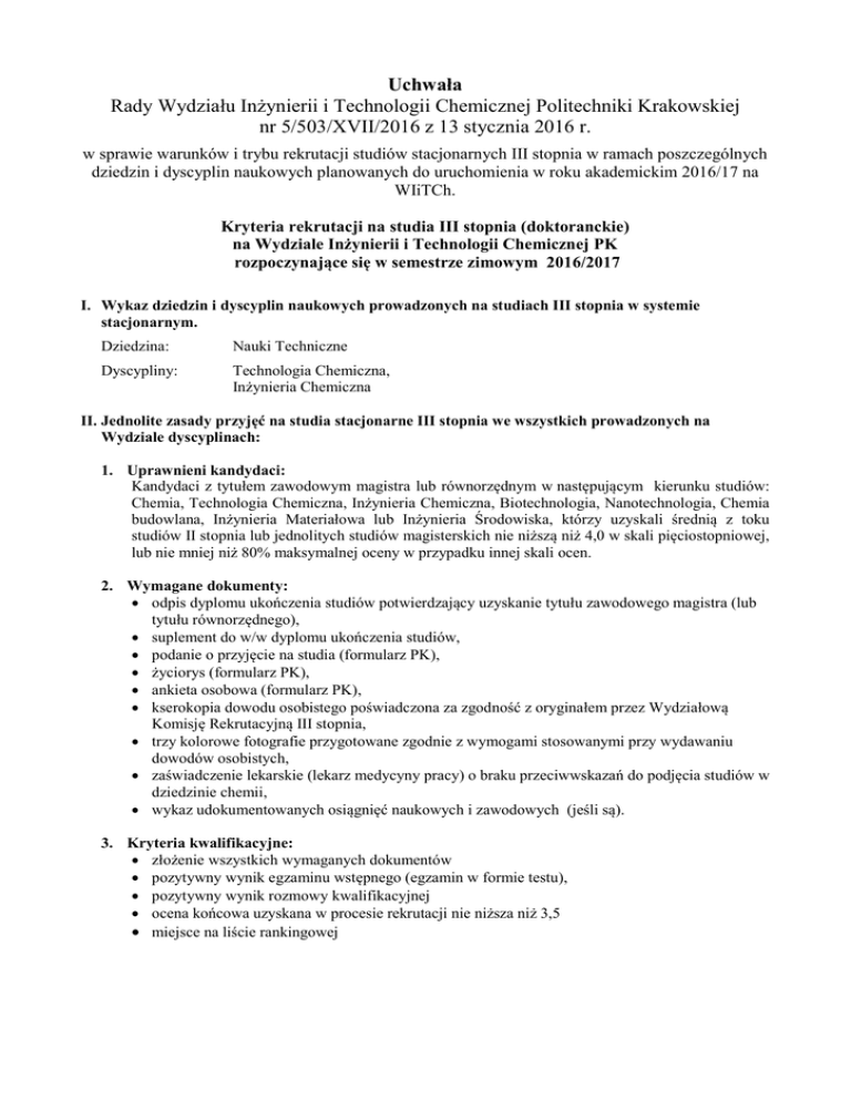 Uchwała Rady Wydziału Inżynierii i Technologii Chemicznej Politechniki Krakowskiej nr 5/503/XVII/2016 z 13 stycznia 2016 r. w sprawie warunków i trybu rekrutacji studiów stacjonarnych III stopnia w ramach poszczególnych dziedzin i dyscyplin naukowych planowanych do uruchomienia w roku akademickim 2016/17 na WIiTCh. Kryteria rekrutacji na studia III stopnia (doktoranckie) na Wydziale Inżynierii i Technologii Chemicznej PK rozpoczynające się w semestrze zimowym 2016/2017 I. Wykaz dziedzin i dyscyplin naukowych prowadzonych na studiach III stopnia w systemie stacjonarnym. Dziedzina: Dyscypliny: Nauki Techniczne Technologia Chemiczna, Inżynieria Chemiczna II. Jednolite zasady przyjęć na studia stacjonarne III stopnia we wszystkich prowadzonych na Wydziale dyscyplinach: 1. Uprawnieni kandydaci: Kandydaci z tytułem zawodowym magistra lub równorzędnym w następującym kierunku studiów: Chemia, Technologia Chemiczna, Inżynieria Chemiczna, Biotechnologia, Nanotechnologia, Chemia budowlana, Inżynieria Materiałowa lub Inżynieria Środowiska, którzy uzyskali średnią z toku studiów II stopnia lub jednolitych studiów magisterskich nie niższą niż 4,0 w skali pięciostopniowej, lub nie mniej niż 80% maksymalnej oceny w przypadku innej skali ocen. 2. Wymagane dokumenty: odpis dyplomu ukończenia studiów potwierdzający uzyskanie tytułu zawodowego magistra (lub tytułu równorzędnego), suplement do w/w dyplomu ukończenia studiów, podanie o przyjęcie na studia (formularz PK), życiorys (formularz PK), ankieta osobowa (formularz PK), kserokopia dowodu osobistego poświadczona za zgodność z oryginałem przez Wydziałową Komisję Rekrutacyjną III stopnia, trzy kolorowe fotografie przygotowane zgodnie z wymogami stosowanymi przy wydawaniu dowodów osobistych, zaświadczenie lekarskie (lekarz medycyny pracy) o braku przeciwwskazań do podjęcia studiów w dziedzinie chemii, wykaz udokumentowanych osiągnięć naukowych i zawodowych (jeśli są). 3. Kryteria kwalifikacyjne: złożenie wszystkich wymaganych dokumentów pozytywny wynik egzaminu wstępnego (egzamin w formie testu), pozytywny wynik rozmowy kwalifikacyjnej ocena końcowa uzyskana w procesie rekrutacji nie niższa niż 3,5 miejsce na liście rankingowej 4. Zakres zagadnień wymagany do egzaminu wstępnego: Zestaw pytań testowych (bez odpowiedzi), z którego w sposób losowy będą wybierane pytania do egzaminu wstępnego zostanie zamieszczony w internecie na stronach Wydziału, na zakładce dla doktorantów, w sekcji dotyczącej rekrutacji na studia III stopnia, co najmniej na jeden miesiąc przed terminem egzaminu. Osobny zestaw pytań będzie obowiązywał dla dyscypliny Technologia Chemiczna i osobny dla dyscypliny Inżynieria Chemiczna. 5. Forma egzaminu wstępnego: Egzamin wstępny prowadzony będzie w formie testu kompetencyjnego dla kandydatów na studia III stopnia, w podobny sposób w jaki przeprowadzane są na Wydziale testy kompetencyjne dla absolwentów studiów I i II stopnia, to znaczy: test jednokrotnego wyboru zawiera 50 losowo wybranych pytań z przewidzianej na dany rok akademicki puli pytań; całkowity czas trwania testu wynosi 60 minut, Pula pytań do testu kompetencyjnego dla kandydatów na studia III stopnia składa się z pytań wybranych z puli pytań do testów kompetencyjnych dla absolwentów studiów I i II stopnia, odpowiednich do wybranego kierunku studiów, oraz pytań ustalonych przez Komisję Rekrutacyjną III stopnia. W trakcie trwania egzaminu, nie wolno mieć przy sobie żadnych notatek ani żadnych włączonych urządzeń elektronicznych (w tym również telefonu). Warunkiem wpuszczenia na salę egzaminacyjną jest okazanie dowodu osobistego lub paszportu. Do egzaminu wstępnego na studia doktoranckie można przystąpić tylko raz w danym roku akademickim i tylko do jednej z oferowanych na Wydziale dyscyplin. Żaden wynik z testu kompetencyjnego dla absolwentów studiów II ani I stopnia nie zwalnia z egzaminu wstępnego na studia doktoranckie prowadzone na Wydziale. 6. Kryteria oceny wyników egzaminu wstępnego i skala ocen: Egzamin wstępny uważa się za zdany, gdy kandydat uzyskał nie mniej niż 60% maksymalnej liczby punktów możliwych do uzyskania, które odpowiada ocenie 3,00. Ocenę z egzaminu wylicza się z dokładnością do dwóch miejsc po przecinku, dzieląc liczbę uzyskanych punktów przez maksymalną liczbę punktów możliwych do uzyskania i mnożąc wynik przez 5. Tak wyliczoną ocenę bierze się do obliczenia oceny końcowej bez zaokrąglania. 7. Zakres, kryteria i skala ocen rozmowy kwalifikacyjnej: Do rozmowy kwalifikacyjnej dopuszczeni są tylko kandydaci, którzy zdali egzamin wstępny. Na rozmowie kwalifikacyjnej oceniane są następujące kompetencje i umiejętności kandydata: o kompetencje kandydata z zakresu tematyki pracy dyplomowej, wybranej przez kandydata tematyki pracy doktorskiej, znajomości technik laboratoryjnych, itp., (maks. 20 pkt.) o dotychczasowe osiągnięcia naukowe lub zawodowe kandydata, takie jak np.: publikacje, udział w konferencjach, zaangażowanie w koła naukowe, zdobyte doświadczenie zawodowe, np. na praktykach lub stażach, itp. (maks. 10 pkt.) o umiejętność autoprezentacji (np. sposób wypowiedzi, komunikatywność, umiejętność przekazu informacji technicznych, itp.), (maks. 20 pkt). Ocenę z rozmowy kwalifikacyjnej oblicza się z dokładnością do dwóch miejsc po przecinku, dzieląc sumaryczną liczbę uzyskanych na rozmowie punktów przez liczbę maksymalną (tj. 50) i mnożąc wynik przez 5. 8. Ocena końcowa i lista rankingowa: Ocenę końcową kandydata uzyskaną w procesie rekrutacji oblicza się jako średnią ważoną równą sumie: 60% oceny z egzaminu wstępnego + 40% oceny z rozmowy kwalifikacyjnej i podaje się ją z dokładnością do dwóch miejsc po przecinku bez zaokrąglania. Listę rankingową ustala się na podstawie oceny końcowej porządkując kandydatów w kolejności od oceny najwyżs