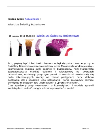 Jesteś tutaj: Aktualności > Wieści ze Świetlicy Bożenkowo 11 marzec 2011 07:42:00 Wieści ze Świetlicy Bożenkowo Ach, piękną być ! Pod takim hasłem odbył się pokaz kosmetyczny w Świetlicy Bożenkowo przeprowadzony przez Małgorzatę Andrzejewską – kosmetyczkę mającą swój gabinet w Bydgoszczy. Pani Małgorzata zaprezentowała makijaż dzienny i wieczorowy na twarzach ochotniczek, udzielając przy tym porad. Uczestniczki dowiedziały się dużo interesujących rzeczy na temat pielęgnacji cery, doboru podkładu, jak i sposobie jego nakładania. Panie zauważyły różnicę pomiędzy makijażem tzw „domowym” a „profesjonalnym”. Czas spędzony przy rozmowach o kosmetykach i urodzie sprawił kobietą dużo radość, mogły w końcu pomyśleć o sobie! http://ztilpqi.osielsko.pl/blog/1_499-wiesci_ze_swietlicy_bozenkowo.html Strona 1/2 HK drukuj Wróć http://ztilpqi.osielsko.pl/blog/1_499-wiesci_ze_swietlicy_bozenkowo.html Powered by TCPDF (www.tcpdf.org) Strona 2/2