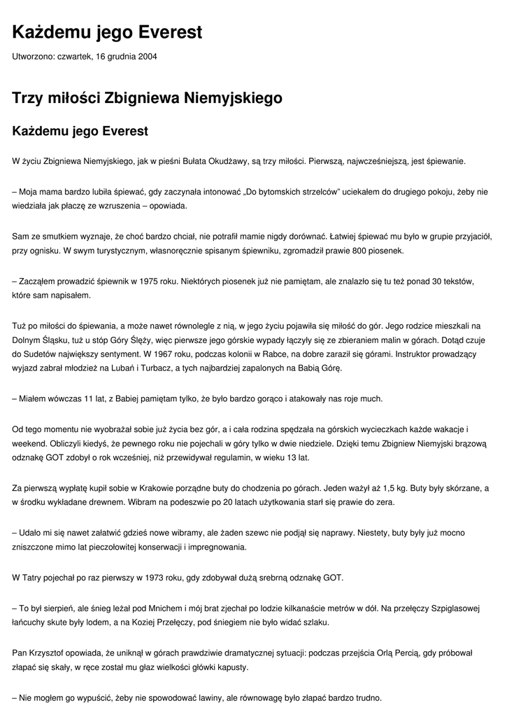 Każdemu jego Everest Utworzono: czwartek, 16 grudnia 2004 Trzy miłości Zbigniewa Niemyjskiego Każdemu jego Everest W życiu Zbigniewa Niemyjskiego, jak w pieśni Bułata Okudżawy, są trzy miłości. Pierwszą, najwcześniejszą, jest śpiewanie. – Moja mama bardzo lubiła śpiewać, gdy zaczynała intonować „Do bytomskich strzelców” uciekałem do drugiego pokoju, żeby nie wiedziała jak płaczę ze wzruszenia – opowiada. Sam ze smutkiem wyznaje, że choć bardzo chciał, nie potrafił mamie nigdy dorównać. Łatwiej śpiewać mu było w grupie przyjaciół, przy ognisku. W swym turystycznym, własnoręcznie spisanym śpiewniku, zgromadził prawie 800 piosenek. – Zacząłem prowadzić śpiewnik w 1975 roku. Niektórych piosenek już nie pamiętam, ale znalazło się tu też ponad 30 tekstów, które sam napisałem. Tuż po miłości do śpiewania, a może nawet równolegle z nią, w jego życiu pojawiła się miłość do gór. Jego rodzice mieszkali na Dolnym Śląsku, tuż u stóp Góry Ślęży, więc pierwsze jego górskie wypady łączyły się ze zbieraniem malin w górach. Dotąd czuje do Sudetów największy sentyment. W 1967 roku, podczas kolonii w Rabce, na dobre zaraził się górami. Instruktor prowadzący wyjazd zabrał młodzież na Lubań i Turbacz, a tych najbardziej zapalonych na Babią Górę. – Miałem wówczas 11 lat, z Babiej pamiętam tylko, że było bardzo gorąco i atakowały nas roje much. Od tego momentu nie wyobrażał sobie już życia bez gór, a i cała rodzina spędzała na górskich wycieczkach każde wakacje i weekend. Obliczyli kiedyś, że pewnego roku nie pojechali w góry tylko w dwie niedziele. Dzięki temu Zbigniew Niemyjski brązową odznakę GOT zdobył o rok wcześniej, niż przewidywał regulamin, w wieku 13 lat. Za pierwszą wypłatę kupił sobie w Krakowie porządne buty do chodzenia po górach. Jeden ważył aż 1,5 kg. Buty były skórzane, a w środku wykładane drewnem. Wibram na podeszwie po 20 latach użytkowania starł się prawie do zera. – Udało mi się nawet załatwić gdzieś nowe wibramy, ale żaden szewc nie podjął się naprawy. Niestety, buty były już mocno zniszczone mimo lat pieczołowitej konserwacji i impregnowania. W Tatry pojechał po raz pierwszy w 1973 roku, gdy zdobywał dużą srebrną odznakę GOT. – To był sierpień, ale śnieg leżał pod Mnichem i mój brat zjechał po lodzie kilkanaście metrów w dół. Na przełęczy Szpiglasowej łańcuchy skute były lodem, a na Koziej Przełęczy, pod śniegiem nie było widać szlaku. Pan Krzysztof opowiada, że uniknął w górach prawdziwie dramatycznej sytuacji: podczas przejścia Orlą Percią, gdy próbował złapać się skały, w ręce został mu głaz wielkości główki kapusty. – Nie mogłem go wypuścić, żeby nie spowodować lawiny, ale równowagę było złapać bardzo trudno. Swoimi górskim doświadczeniami dzieli się dzięki swej trzeciej miłości – działalności społecznej. Już w latach 70. szkolił i egzaminował przewodników turystyki, a podczas służby wojskowej w Mrągowie organizował wycieczki dla wojska. Obecnie szefuje kołu PTTK działającemu przy kopalni „Wieczorek”, którego członkiem jest od 1988 roku, działa w zarządzie oddziału górnośląskiego PTTK, ma spore doświadczenie związkowe, a swoje turystyczne wojaże opisuje w zakładowej gazetce. Przed rokiem wraz z kolegami z koła wyruszyli na wymarzoną wycieczkę w Alpy. – Poruszaliśmy się w dolinie rzeki Inn, w trójkącie Austria, Włochy, Szwajcaria. Wyprawa trwała 11 dni, a dzięki temu, że podróżowaliśmy hotel-busem, czyli autobusem z miejscami do spania, koszty były naprawdę niewysokie – opowiada. Największa wysokość osiągnięta podczas wyprawy to stacja kolejki linowej, znajdująca się 3303 metry nad poziomem morza. – Ale szczyt Mutler, mający 3296 metrów, zdobyliśmy na własnych nogach – zaznacza turysta. Alpy zrobiły na Niemyjskim dużo większe wrażenie, niż Tatry, bo gdy wejdzie się na szczyt po widnokrąg widać same góry, a różnica wysokości od podnóża do wierzchołka góry to nawet 1,5 km. Z górskich wędrówek, oprócz wrażeń, przywozi pamiątkowe odznaki. Jest wśród nich odznaka „Za wytrwałość w turystyce”. Żeby ją zdobyć, trzeba chodzić po górach przynajmniej 13 lat, ale zazwyczaj jej zdobywanie trwa o wiele dłużej. Jest też odznaka „Każdemu jego Everest”, przyznawana za zdobycie przewyższeń. Regulamin zdobywania złotej odznaki zakłada pokonanie 8800 metrów w pionie aż 14 razy – tyle, ile jest na świecie ośmiotysięczników. Panu Zbigniewowi brakuje do jej zdobycia jeszcze 3 tys. metrów. Okazja ku temu będzie na pewno podczas kolejnej alpejskiej wyprawy, zaplanowanej na 2009 rok. Turyści z „Wieczorka” chcą wówczas wyruszyć do doliny Zermat w Szwajcarii, która otoczona jest największym skupiskiem czterotysięczników w Alpach. Anna Zych