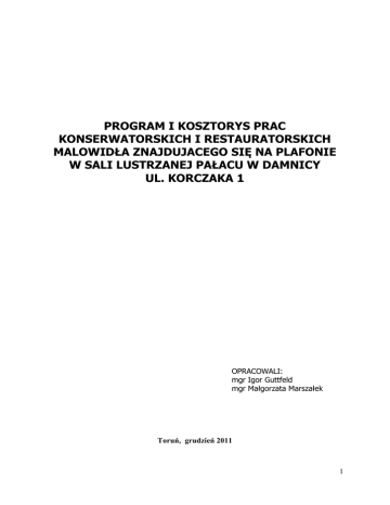 PROGRAM I KOSZTORYS PRAC KONSERWATORSKICH I RESTAURATORSKICH MALOWIDŁA ZNAJDUJACEGO SIĘ NA PLAFONIE W SALI LUSTRZANEJ PAŁACU W DAMNICY UL. KORCZAKA 1 OPRACOWALI: mgr Igor Guttfeld mgr Małgorzata Marszałek Toruń, grudzień 2011 1 1.0. WPROWADZENIE Program prac i kosztorys zostały przygotowane na zlecenie Powiatu Słupskiego w ramach zadania inwestycyjnego pn. „Wykonanie ekspertyzy technicznej stropu w sali lustrzanej w budynku Ośrodka Szkolno – Wychowawczego w Damnicy”. 2.0. MALOWIDŁO NA SUFICIE SALI LUSTRZANEJ 2.1. OPIS INWENTARYZACYJNY OBIEKTU 2.1.1. Rodzaj i tytuł obiektu Malowidło na stropie Sali Lustrzanej w pałacu w Damnicy wpisane do rejestru zabytków województwa pomorskiego dnia 12 03 1987 roku pod nr A – 240. 2.1.2. Czas powstania, autor Malowidło znajduje się w pałacu pochodzącym z końca XIX wieku, wzniesionym na zlecenie Richarda von Blankensee, a zaprojektowanym przez architekta Gustawa Koehlbacha (Knoblauch?). Plafon powstał około 1900 roku, sygnowany jest przez Maxa Gȁrtnera.1, 2 1 Informacje zaczerpnięta z Białej Karty obiektu 2 www.damnica.pl/zabytki.htm 2 2.1.3. Opis Plafon przedstawia alegorie czterech pór roku. Na środku sufitu zawieszony jest kryształowy żyrandol spod którego wychodzą namalowane promienie symbolizujące słońce. Wokół niego, tworząc jakby wieniec, namalowane są cztery pory roku symbolizowane przez postacie kobiece, pomiędzy nimi, umieszczone zostały putta symbolizujące poszczególne miesiące. Pory roku umieszczone zostały symetrycznie, każda na połowie długości jednego boku sali, a miesiące po trzy pomiędzy nimi. Postacie namalowane zostały głowami skierowanymi do środka sali. Sygnatura autora malowidła umieszczona jest na jednej z kart wypadających z torby putta symbolizującego styczeń. Całość kompozycji ujęta jest od dołu ramą wykonaną techniką sztukatorską. W narożnikach przedstawienia znajdują się sztukaterie w formie przeplatającej się szarfy z elementami kwiatowymi. Dekoracje sztukatorskie w formie ornamentów roślinnych znajdują się również na połowie długości każdego z boków sali. Wszystkie elementy sztukatorskie połączone są szarfą wykonaną tą samą techniką, biegnącą dookoła sufitu. 2.2. TECHNIKA WYKONANIA Malowidło wykonano w technice temperowej na mineralnym gipsowo – piaskowo wapiennym tynku, o zróżnicowanej grubości, narzuconym na słomiane maty, nabite na deski stropowe. Strop typu podwójnego, oparty jest na dwóch stalowych podciągach ułożonych w poprzek sali. Dolną część stropu, na której znajduje się malowidło stanowią belki drewniane przekroju 18x9,5cm o rozstawie 85-88cm oraz deska sufitowa grubości 2,5cm. 3 3.0. STAN ZACHOWANIA I PRZYCZYNY ZNISZCZEŃ Stan zachowania malowidła jest zły. Występują promieniowe spękanie tynku od narożników po środek stropu. Pęknięcia tynku widoczne są również w fasecie. Powierzchnia jest nierówna, falująca. Pomiędzy spękanymi fragmentami tynku występują przesunięcia w poziomie. Widoczne są ubytki w sztukaterii. Zniszczenia malowidła najprawdopodobniej spowodowane są głównie samą technologią nakładania tynku – na warstwę deskowania nałożone są maty z trzciny przyczepione do deskowania za pomocą gwoździ i drucików. Na tak przygotowaną powierzchnię nakładano tynk. Biorąc pod uwagę naturalne procesy starzeniowe materiału jakim jest trzcina i możliwość korozji elementów metalowych (nieodporność na zmienne warunki wilgotnościowo – temperaturowe) oraz złą adhezję tak przygotowanego tynku do podłoża drewnianego, jak również możliwość zastosowania tynku o nieodpowiednich właściwościach (powstawanie drobnych spękań bezpośrednio po nałożeniu tynku) można przypuszczać, że odspojenie następowało stopniowo od momentu nałożenia tynku. Na pewno na kondycję malowidła i odspojenie warstwy tynku od desek ma również wpływ nadmierne ugięcie konstrukcji stropu, które obecnie wynosi w części środkowej 57mm. Nie można wykluczyć, że dodatkowym czynnikiem niszczącym jest obciążenie dynamiczne jakiemu poddawany jest strop - powyżej znajdują się sale lekcyjne oraz pokoje internatowe. W 1975 roku przeprowadzono konserwację malowidła. Oczyszczono jego powierzchnię. Temperową warstwę malarską konsolidowano dyspersją wodną polioctanu winylu, którą również wzmacniano osłabione tynki oraz krawędzie pęknięć. Odspojone fragmenty sztukaterii podklejano klejem “wikol”. W miejscach odspojeń tynku od desek stropowych, wzdłuż pęknięć, zakładano stalowe wkręty z podkładkami średnicy 10mm (wkręcano je w deski stropu). Uzupełnienia wykonano zaprawą wapienno-gipsowo-piaskową. Po punktowaniu malowidło zabezpieczono werniksem damarowym z dodatkiem wosku.3 Szerokie zastosowanie dyspersji wodnej polioctanu winylu do konsolidacji i wzmacniania oryginalnych warstw technologicznych skutkuje uszczelnieniem powierzchni malowidła. Procesy starzeniowe błony POW prowadzą do powstania 4 charakterystycznych zniszczeń obiektu – odspajanie się warstwy malarskiej, która występuję w postaci charakterystycznych, odspojonych „miseczek” oraz zmiany kolorystyki warstwy malarskiej. Użyte do stabilizacji odspojonego tynku wkręty początkowo spełniały swoją rolę, jednakże w wyniku długotrwałego oddziaływania dynamicznych obciążeń wynikających z charakteru eksploatacji budynku spowodowały wykruszenie tynku w punktach oparcia podkładek (luźne zagłębienie śrub wraz z podkładkami w tynk). 3 Informacje zaczerpnięto z dokumentacji konserwatorskiej opracowanej przez mgr Elżbietę Mirowską 5 4.0. WNIOSKI I ZAŁOŻENIA KONSERWATORSKIE Wykonane prace miały na celu: ocenę stanu zachowania malowidła i wykazanie głównych przyczyn zniszczeń na podstawie dokonanej oceny stanu zachowania obiektu opracowanie programu prac konserwatorskich i restauratorskich przygotowanie kosztorysu na prace konserwators