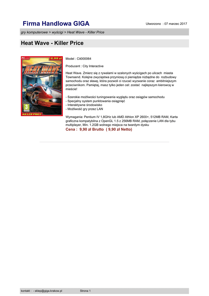 Firma Handlowa GIGA Utworzono : 07 marzec 2017 gry komputerowe > wyścigi > Heat Wave - Killer Price Heat Wave - Killer Price Model : Cit000064 Producent : City Interactive Heat Wave. Zmierz się z rywalami w szalonych wyścigach po ulicach miasta Townsend. Kolejne zwycięstwa przyniosą ci pieniądze nizbędne do rozbudowy samochodu oraz sławę, która pozwoli ci rzucać wyzwanie coraz ambitniejszym przeciwnikom. Pamiętaj, masz tylko jeden cel: zostać najlepszym kierowcą w mieście! - Szerokie możliwości tuningowania wyglądu oraz osiągów samochodu - Specjalny system punktowania osiągnięć - Interaktywne środowisko - Możliwość gry przez LAN Wymagania: Pentium IV 1,8GHz lub AMD Athlon XP 2600+, 512MB RAM, Karta graficzna kompatybilna z OpenGL 1.5 z 256MB RAM, połączenie LAN dla tybu multiplayer, Min. 1.2GB wolnego miejsca na twardym dysku Cena : 9,90 zł Brutto ( 9,90 zł Netto) kontakt : - [email protected] Strona 1