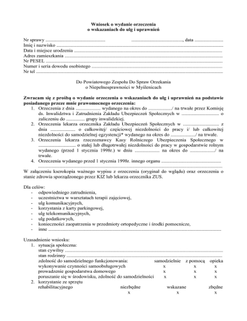 Wniosek o wydanie orzeczenia o wskazaniach do ulg i uprawnień Nr sprawy ................................................ ........................................., data ....................... Imię i nazwisko ...................................................................................................................................... Data i miejsce urodzenia ....................................................................................................................... Adres zamieszkania ............................................................................................................................... Nr PESEL .............................................................................................................................................. Numer i seria dowodu osobistego ......................................................................................................... Nr tel ...................................................................................................................................................... Do Powiatowego Zespołu Do Spraw Orzekania o Niepełnosprawności w Myślenicach Zwracam się z prośbą o wydanie orzeczenia o wskazaniach do ulg i uprawnień na podstawie posiadanego przeze mnie prawomocnego orzeczenia: 1. Orzeczenia z dnia .................... wydanego na okres do .................../ na trwałe przez Komisję ds. Inwalidztwa i Zatrudnienia Zakładu Ubezpieczeń Społecznych w .............................. o zaliczeniu do ............... grupy inwalidzkiej. 2. Orzeczenia lekarza orzecznika Zakładu Ubezpieczeń Społecznych w ............................. z dnia .................... o całkowitej/ częściowej niezdolności do pracy i/ lub całkowitej niezdolności do samodzielnej egzystencji* wydanego na okres do ..................../ na trwałe. 3. Orzeczenia lekarza rzeczoznawcy Kasy Rolniczego Ubezpieczenia Społecznego w .............................. o stałej lub długotrwałej niezdolności do pracy w gospodarstwie rolnym wydanego (przed 1 stycznia 1998r.) w dniu .................... na okres do ..................../ na trwałe. 4. Orzeczenia wydanego przed 1 stycznia 1998r. innego organu ................................................ .................................................................................................................................................... W załączeniu kserokopia waŜnego wypisu z orzeczenia (oryginał do wglądu) oraz orzeczenia o stanie zdrowia sporządzonego przez KIZ lub lekarza orzecznika ZUS. Dla celów: - odpowiedniego zatrudnienia, - uczestnictwa w warsztatach terapii zajęciowej, - ulg komunikacyjnych, - korzystania z karty parkingowej, - ulg telekomunikacyjnych, - ulg podatkowych, - konieczności zaopatrzenia w przedmioty ortopedyczne i środki pomocnicze, - inne ........................................................................................................................................... Uzasadnienie wniosku: 1. sytuacja społeczna: stan cywilny ............................................................................................................................... stan rodzinny ............................................................................................................................. zdolność do samodzielnego funkcjonowania: samodzielnie z pomocą opieka wykonywanie czynności samoobsługowych x x x prowadzenie gospodarstwa domowego x x x poruszanie się w środowisku, zdolność do samodzielności x x x 2. korzystanie ze sprzętu rehabilitacyjnego niezbędne wskazane zbędne x x x 3. sytuacja zawodowa: wykształcenie ............................................................................................................................. zawód ......................................................................................................................................... obecne zatrudnienie ................................................................................................................... Oświadczam, Ŝe: 1. pobieram świadczenia (nie pobieram)* z ubezpieczenia społecznego, jakie .................................................................................................................................................... 2. od kiedy...................................................................................................................................... 3. aktualnie toczy się (nie toczy się)* w mojej sprawie postępowanie przed innym organem orzeczniczym, podać jakim ....................................................................................................... 4. składałem (nie składałem)* uprzednio wniosek o ustalenie stopnia niepełnosprawności: kiedy .......................................................................................................................................... z jakim skutkiem ........................................................................................................................ 5. mogę (nie mogę)* samodzielnie przybyć na posiedzenie składu orzekającego (jeŜeli nie, to naleŜy załączyć zaświadczenie lekarskie potwierdzające niemoŜność wzięcia udziału w posiedzeniu z powodu długotrwałej lub nie rokującej poprawy choroby). 6. w razie stwierdzonej przez zespół orzekający konieczności wykonania badań dodatkowych, konsultacji specjalistycznych lub obserwacji szpitalnych, uzupełniających złoŜone zaświadczenie o stanie zdrowia wydane przez lekarza nie będącego lekarzem ubezpieczenia zdrowotnego, jestem świadomy wymogu ponoszenia ich kosztów we własnym zakresie. 7. zobowiązuje się do informowania Powiatowego Zespołu ds. Orzekania o Niepełnosprawności w Myślenicach (zgodnie z art. 41 KPA) o zmianie adresu lub miejsca pobytu. W przypadku otrzymania orzeczenia o wskazaniach do ulg i uprawnień Starosta wystawia legitymację dokumentującą stopień niepełnospraw