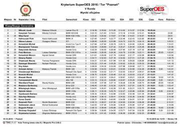 Kryterium SuperOES 2016 / Tor "Poznań" V Runda Wyniki oficjalne Miejsce Nr Nazwisko i imię Pilot Samochód Mateusz Witucki Mikołaj Cichocki Lancer Evo IX BMW M3 E46 BMW E30 318is BMW iX STI Klasa SS1 SS2 SS3 SS4 SS5 SS6 Czas 6 5 4 6 6 4 5 4 4 3 3 3 3 4 5 4 4 4 5 5 4 4 4 5 3 3 5 4 4 4 4 3:16.36 3:23.10 3:23.40 3:27.85 3:28.95 3:27.66 3:32.58 3:32.29 3:44.80 3:31.61 3:34.71 3:33.31 3:32.22 3:38.05 3:30.98 3:33.92 3:36.70 3:33.11 3:33.12 3:33.59 3:49.45 3:34.81 3:38.11 3:36.34 3:36.40 3:36.27 3:39.13 3:42.83 3:36.12 3:39.94 3:45.19 3:16.64 3:21.63 3:20.84 3:24.67 3:26.55 3:27.64 3:28.69 3:30.05 3:26.58 3:29.08 3:32.63 3:31.63 3:31.44 3:34.34 3:34.02 3:33.42 3:32.60 3:32.32 3:32.23 3:37.58 3:31.80 3:35.91 3:35.39 3:35.43 3:36.12 3:39.30 3:39.57 3:37.46 3:39.09 3:39.85 3:41.43 3:13.35 3:19.51 3:19.67 3:22.77 3:23.88 3:28.79 3:27.42 3:28.59 3:26.38 3:27.79 3:27.16 3:31.99 3:35.29 3:33.09 3:30.81 3:31.71 3:30.49 3:29.41 3:29.90 3:27.14 3:33.30 3:32.26 3:45.79 3:32.88 3:39.41 3:40.60 3:37.50 3:35.68 3:45.98 3:34.05 3:39.60 3:14.02 3:15.16 3:17.86 3:22.46 3:24.72 3:25.13 3:26.47 3:27.60 3:24.79 3:28.52 3:34.92 3:31.00 3:30.02 3:27.98 3:30.60 3:32.03 3:31.32 3:39.87 3:30.87 3:38.46 3:29.70 3:31.92 3:32.27 3:33.83 3:34.52 3:34.56 3:34.55 3:36.05 3:36.17 3:33.71 3:36.39 3:12.57 3:14.63 3:16.81 3:22.43 3:22.75 3:24.60 3:26.05 3:27.19 3:33.59 3:31.77 3:27.51 3:29.83 3:28.32 3:28.68 3:30.66 3:30.47 3:29.03 3:29.21 3:35.29 3:30.38 3:27.91 3:32.21 3:28.96 3:32.58 3:35.36 3:34.91 3:32.94 3:35.80 3:36.13 3:47.04 3:34.08 3:12.50 3:15.31 3:16.67 3:22.65 3:24.10 3:26.43 3:25.08 3:27.32 3:22.11 3:30.59 3:27.26 3:28.80 3:29.33 3:27.11 3:32.28 3:29.41 3:32.37 3:29.28 3:32.24 3:28.74 3:26.75 3:32.73 3:28.94 3:41.35 3:34.62 3:31.91 3:36.26 3:37.47 3:32.84 3:32.50 3:32.23 19:25.44 19:49.34 19:55.25 20:22.83 20:30.95 20:40.25 20:46.29 20:53.04 20:58.25 20:59.36 21:04.19 21:06.56 21:06.62 21:09.25 21:09.35 21:10.96 21:12.51 21:13.20 21:13.65 21:15.89 21:18.91 21:19.84 21:29.46 21:32.41 21:36.43 21:37.55 21:39.95 21:45.29 21:46.33 21:47.09 21:48.92 Kara Różnica Klasyfikacja Generalna 1 2 3 4 5 6 7 8 9 10 11 12 13 14 15 16 17 18 19 20 21 22 23 24 25 26 27 28 29 30 31 1 2 20 3 6 22 7 25 23 54 57 53 56 33 11 27 32 34 15 12 46 26 49 13 60 66 8 42 21 36 35 Witucki Jacek Kasprzak Tomasz Wiza Karol Kałmuczak Piotr Sikora Łukasz Kolasiński Michał Maciejewski Tomasz Dzięcielski Bartosz Preś Mariusz Kolasiński Marcin Stawny Radek Olejniczak Maciej Szwargot Sławomir Kny Adam Antczak Adrian Olenderczyk Waldemar Nowicki Michał Muszak Marek Tomaszewski Marek Wendland Pawel Madziara Bartłomiej Mikołajczyk Adam Dębicki Adam Gęsikowski Bartosz Dziurleja Mateusz Kuros Dawid Rozanski Piotr Sobkowiak Jakub Bogucki Patryk Stroiwąs Krzysztof Grysiewicz Łukasz Kasia Kałmuczak Grzegorz Sikora Honda Civic Type R Lukasz Szterleja Kąciak Daniel Tomasz Podgórecki Norbert Pietrzak Mateusz Pawlak Maciej Kiszka Artur Mikołajczyk Nicole Rozanska Michał Sobkowiak Łukasz Stroiwąs Zbigniew Bednarowicz 15.10.2016 / Poznań Vola Timing (www.vola.fr) / Msports Pro 2.09.2 BMW E30 Honda Civic BMW E30 318 is Honda CRX Honda Civic Honda CRX Honda Civic Honda civic BMW 328 Renault Clio Sport Honda Civic BMW E30 318 IS Alfa 156 BMW e36 Bmw E30 BMW e30 318is BMW 318is BMW e46 Honda civic Honda Civic BMW E30 BMW E30 BMW e30 318is Renault Clio Sport BMW 318 iS 25.00 5.00 10.00 5.00 20.00 10.00 5.00 10.00 5.00 23.90 29.81 57.39 1:05.51 1:14.81 1:20.85 1:27.60 1:32.81 1:33.92 1:38.75 1:41.12 1:41.18 1:43.81 1:43.91 1:45.52 1:47.07 1:47.76 1:48.21 1:50.45 1:53.47 1:54.40 2:04.02 2:06.97 2:10.99 2:12.11 2:14.51 2:19.85 2:20.89 2:21.65 2:23.48 15.10.2016 do 14:53 / Strona 1/8 Pomiar czasu - Chronotec / +48 609020020 / VolaSoftControlPdf [email protected] Kryterium SuperOES 2016 / Tor "Poznań" V Runda Wyniki oficjalne Miejsce Nr 32 33 34 35 36 37 38 39 40 41 42 43 44 45 46 47 48 49 50 51 52 53 54 55 56 57 58 59 60 65 5 45 69 70 24 39 37 31 40 79 64 82 47 76 84 74 78 83 61 14 50 80 77 75 67 48 18 71 Nazwisko i imię Rogala Jakub Krystkowiak Maciej Drozdzyk Dominik Żołądkiewicz Marcin Kuster-Kałmuczak Kamila Płoszaj Marcin Piątek Wojciech Stolarczyk Krzysztof Postół Przemysław Kęsy Kamil Szafranek Łukasz Doliński Jarosław Rzepecki Adam Krzymicka Justyna Guźliński Łukasz Wierzbicki Nikodem Banaszyński Cezary Kałmuczak Kasia Konik Patryk Stachowiak Marcin Burszewski Michał Burzyński Łukasz Ekert Agnieszka Bocheński Krzysztof Różańska Maja Krysztofiak Bogusław Lihs Kinga Rozanska Nicole Barański Szymon Pilot Adam Debicki Kasia Kałmuczak Wojciech Spychała Adam Piątek Jacek Szulikowski Adam Nowicki Michał Rogaczewski Mateusz Wawrzyniak Szymon Guźliński Darek Nowicki Agnieszka Chudzińska Kamila Kałmuczak Martyna Tabaczyńska Piotr Różański Artur Ignyś Maurycy Dezor Piotr Rozanski Hubert Barański 15.10.2016 / Poznań Vola Timing (www.vola.fr) / Msports Pro 2.09.2 Samochód Peugeot 106 Subaru Impreza BMW e30 318is Fiat Seicento Honda Civic 1.3 BMW E36 320i BMW e36 318is Opel Astra GSI BMW 318 is Opel Corsa Fiat Seicento Honda Civic KIA PICANTO Renault Clio Sport Suzuki Baleno KIA PICANTO Nissan Micra Honda Civic 1.3 Kia Picanto Toyota Yaris VW Golf 5 BMW E36 320i Kia Picanto WTF Ford KA Renault Clio Mitsubishi Colt CA0 Honda Civic BMW E30 Fiat seicento Klasa SS1 SS2 SS3 SS4 SS5 SS6 Czas 3 6 4 2 2 4 4 4 4 4 2 3 1 4 2 1 2 2 1 3 5 4 2 2 2 3 4 5 2 3:43.79 3:41.84 3:40.70 3:46.93 3:52.05 3:52.81 3:49.05 3:50.06 3:52.77 3:56.03 3:59.76 3:58.75 3:58.72 3:58.52 4:02.32 4:00.18 4:02.00 4:04.78 4:03.12 4:10.85 4:25.60 4:19.96 4:00.58 4:07.91 4:16.19 4:18.23 4:17.04 4:21.63 4:32.01 3:38.52 3:39.73 3:39.76 3:46.31 3:45.91 3:46.60 3:50.24 3:50.24 3:50.39 3:52.49 3:54.15 3:55.61 3:56.07 3:54.76 3:58.17 3:58.30 4:01.21 3:58.59 3:59.06 4:04.26 3:59.74 4:04.65 3:59.08 4:04.75 4:10.47 4:17.35 4:18.47 3:48.21 4:30.86 3:36.33 3:39.33 3:40.34 3:42.52 3:45.30 3:46.00 3:46.74 3:49.01 3:49.49 3:52.81 3:51.68 3:53.72 3:53.44 3:54.46 3:57