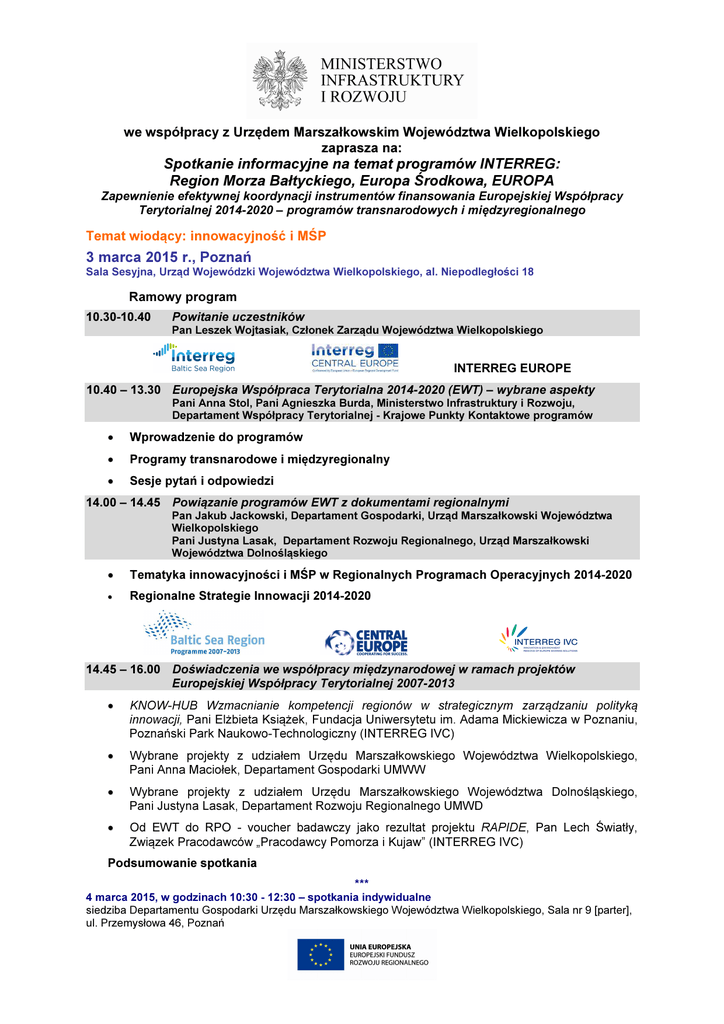 we współpracy z Urzędem Marszałkowskim Województwa Wielkopolskiego zaprasza na: Spotkanie informacyjne na temat programów INTERREG: Region Morza Bałtyckiego, Europa Środkowa, EUROPA Zapewnienie efektywnej koordynacji instrumentów finansowania Europejskiej Współpracy Terytorialnej 2014-2020 – programów transnarodowych i międzyregionalnego Temat wiodący: innowacyjność i MŚP 3 marca 2015 r., Poznań Sala Sesyjna, Urząd Wojewódzki Województwa Wielkopolskiego, al. Niepodległości 18 Ramowy program 10.30-10.40 Powitanie uczestników Pan Leszek Wojtasiak, Członek Zarządu Województwa Wielkopolskiego INTERREG EUROPE 10.40 – 13.30 Europejska Współpraca Terytorialna 2014-2020 (EWT) – wybrane aspekty Pani Anna Stol, Pani Agnieszka Burda, Ministerstwo Infrastruktury i Rozwoju, Departament Współpracy Terytorialnej - Krajowe Punkty Kontaktowe programów • Wprowadzenie do programów • Programy transnarodowe i międzyregionalny • Sesje pytań i odpowiedzi 14.00 – 14.45 Powiązanie programów EWT z dokumentami regionalnymi Pan Jakub Jackowski, Departament Gospodarki, Urząd Marszałkowski Województwa Wielkopolskiego Pani Justyna Lasak, Departament Rozwoju Regionalnego, Urząd Marszałkowski Województwa Dolnośląskiego • Tematyka innowacyjności i MŚP w Regionalnych Programach Operacyjnych 2014-2020 • Regionalne Strategie Innowacji 2014-2020 14.45 – 16.00 Doświadczenia we współpracy międzynarodowej w ramach projektów Europejskiej Współpracy Terytorialnej 2007-2013 • KNOW-HUB Wzmacnianie kompetencji regionów w strategicznym zarządzaniu polityką innowacji, Pani Elżbieta Książek, Fundacja Uniwersytetu im. Adama Mickiewicza w Poznaniu, Poznański Park Naukowo-Technologiczny (INTERREG IVC) • Wybrane projekty z udziałem Urzędu Marszałkowskiego Województwa Wielkopolskiego, Pani Anna Maciołek, Departament Gospodarki UMWW • Wybrane projekty z udziałem Urzędu Marszałkowskiego Województwa Dolnośląskiego, Pani Justyna Lasak, Departament Rozwoju Regionalnego UMWD • Od EWT do RPO - voucher badawczy jako rezultat projektu RAPIDE, Pan Lech Światły, Związek Pracodawców „Pracodawcy Pomorza i Kujaw” (INTERREG IVC) Podsumowanie spotkania *** 4 marca 2015, w godzinach 10:30 - 12:30 – spotkania indywidualne siedziba Departamentu Gospodarki Urzędu Marszałkowskiego Województwa Wielkopolskiego, Sala nr 9 [parter], ul. Przemysłowa 46, Poznań