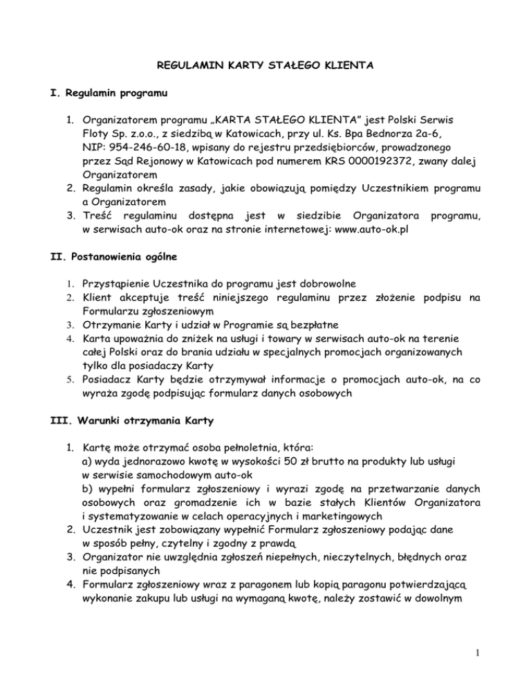 REGULAMIN KARTY STAŁEGO KLIENTA I. Regulamin programu 1. Organizatorem programu „KARTA STAŁEGO KLIENTA” jest Polski Serwis Floty Sp. z.o.o., z siedzibą w Katowicach, przy ul. Ks. Bpa Bednorza 2a-6, NIP: 954-246-60-18, wpisany do rejestru przedsiębiorców, prowadzonego przez Sąd Rejonowy w Katowicach pod numerem KRS 0000192372, zwany dalej Organizatorem 2. Regulamin określa zasady, jakie obowiązują pomiędzy Uczestnikiem programu a Organizatorem 3. Treść regulaminu dostępna jest w siedzibie Organizatora programu, w serwisach auto-ok oraz na stronie internetowej: www.auto-ok.pl II. Postanowienia ogólne 1. Przystąpienie Uczestnika do programu jest dobrowolne 2. Klient akceptuje treść niniejszego regulaminu przez złożenie podpisu na Formularzu zgłoszeniowym 3. Otrzymanie Karty i udział w Programie są bezpłatne 4. Karta upoważnia do zniżek na usługi i towary w serwisach auto-ok na terenie całej Polski oraz do brania udziału w specjalnych promocjach organizowanych tylko dla posiadaczy Karty 5. Posiadacz Karty będzie otrzymywał informacje o promocjach auto-ok, na co wyraża zgodę podpisując formularz danych osobowych III. Warunki otrzymania Karty 1. Kartę może otrzymać osoba pełnoletnia, która: a) wyda jednorazowo kwotę w wysokości 50 zł brutto na produkty lub usługi w serwisie samochodowym auto-ok b) wypełni formularz zgłoszeniowy i wyrazi zgodę na przetwarzanie danych osobowych oraz gromadzenie ich w bazie stałych Klientów Organizatora i systematyzowanie w celach operacyjnych i marketingowych 2. Uczestnik jest zobowiązany wypełnić Formularz zgłoszeniowy podając dane w sposób pełny, czytelny i zgodny z prawdą 3. Organizator nie uwzględnia zgłoszeń niepełnych, nieczytelnych, błędnych oraz nie podpisanych 4. Formularz zgłoszeniowy wraz z paragonem lub kopią paragonu potwierdzającą wykonanie zakupu lub usługi na wymaganą kwotę, należy zostawić w dowolnym 1 serwisie auto-ok lub wysłać pocztą na adres: Polski Serwis Floty, ul. Ks. Bpa Bednorza 2a-6, 40-384 Katowice 5. Karta wysyłana jest przez Organizatora Pocztą Polską w ciągu 20 dni od daty wypełnienia Formularza zgłoszeniowego IV. Karta Stałego Klienta 1. 2. 3. 4. 5. 6. 7. 8. Karta jest kartą na okaziciela Karta nie jest zbywalna Karta przeznaczona jest dla osób fizycznych Karta jest własnością firmy Polski Serwis Floty Sp. z o.o. z siedzibą w Katowicach przy ul. Ks. Bpa Bednorza 2a-6 Karta posiada indywidualny numer, który jest przypisany do jej użytkownika i stanowi podstawę jego identyfikacji W razie zgubienia lub zniszczenia, karta nie podlega wymianie Karta ważna jest bezterminowo W przypadku naruszenia umowy przez Uczestnika, „Karta Stałego Klienta” może zostać zablokowana, a zawarta umowa może zostać uznana za rozwiązaną V. Ramy czasowe programu 1. Regulamin wchodzi w życie z dniem 16.05.2011 r. na czas nieokreślony 2. Organizator zastrzega sobie prawo do wprowadzania zmian do Regulaminu o czym Uczestnik informowany będzie poprzez informację umieszczoną na stronie internetowej 3. Organizator zastrzega sobie prawo do zakończenia Programu w dowolnym momencie bez podania przyczyn o czym poinformuje Klientów 1 miesiąc przed zakończeniem, przy zastosowaniu odpowiednich form informacji i zawiadomień VI. Rabaty 1. Karta upoważnia do zakupu towarów i usług w serwisach auto-ok, po okazaniu Karty, z rabatem w wysokości 10% 2. Rabat wynikający z posiadania Karty obowiązuje od kolejnego zakupu po wydaniu Karty 3. Rabat wynikający z posiadania Karty nie łączy się z innymi promocjami organizowanymi w serwisach auto-ok 4. Dla podniesienia atrakcyjności programu, Organizator będzie organizował promocje sezonowe dla posiadaczy Karty 2 5. O warunkach promocji sezonowych Organizator będzie informował Uczestników na stronie internetowej, poprzez korespondencję bezpośrednią, mailowo lub sms-em 6. Dla promocji sezonowych organizator ma prawo ustalać dodatkowe zasady, które nie będą naruszać interesu Uczestników VII. Rezygnacja z uczestnictwa 1. Rezygnację z uczestnictwa w programie, Uczestnik może złożyć w serwisach auto-ok wypełniając Formularz rezygnacji i zwracając Kartę Stałego Klienta lub wysyłając Formularz rezygnacji wraz z Kartą, na adres: Polski Serwis Floty, ul. Ks. Bpa Bednorza 2a-6, 40-384 Katowice 2. Organizator zobowiązuje się w ciągu 21 dni od złożenia rezygnacji, usunąć dane Klienta z bazy danych firmy Załączniki: 1. Załącznik nr 1: Formularz zgłoszeniowy 2. Załącznik nr 2: Oświadczenie o rezygnacji z uczestnictwa w Programie 3 Załącznik nr 1 do Regulaminu Karty Stałego Klienta Polski Serwis Floty Sp. z.o.o. ul. Ks. Bpa Bednorza 2a-6 40-384 Katowice ………………………………………… miejscowość i data Karta nr ……………………………….. wypełnia wydający kartę KARTA STAŁEGO KLIENTA AUTO-OK – FORMULARZ ZGŁOSZENIA 1. Imię i nazwisko ………………………………………………………………………………… 2. Adres zamieszkania …………………………………………………………………………….. …………………………………………………………………………………………………… 3. Nr telefonu ……………………………………………………………………………………… 4. E-mail …………………………………………………………………………………………... 5. Nr rejestracyjny samochodu ……………………………………………………………………. Ja niżej podpisany/a, wyrażam zgodę na przetwarzanie moich danych osobowych w celach marketingowych przez PSF Sp. z o. o. zgodnie z ustawą z dnia 29.08.1997 o Ochronie Danych Osobowych (Dz. U. Nr 133, poz.883). Podanie danych jest dobrowolne. Oświadczam, że zostałem/am poinformowany/a o prawie dostępu do treści moich danych oraz prawie ich poprawiania. Wyraż