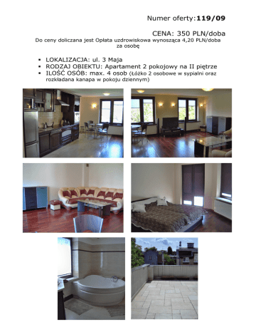 Numer oferty:119/09 CENA: 350 PLN/doba Do ceny doliczana jest Opłata uzdrowiskowa wynosząca 4,20 PLN/doba za osobę LOKALIZACJA: ul. 3 Maja RODZAJ OBIEKTU: Apartament 2 pokojowy na II piętrze ILOŚĆ OSÓB: max. 4 osob (Łóżko 2 osobowe w sypialni oraz rozkładana kanapa w pokoju dziennym) Numer oferty: 119/09 LOKALIZACJA: ul. 3 maja Lp. PRZEDMIOT OCENY UWAGI 1. Nowe/stare budownictwo Stare budownictwo (kamienica) 2. Nowe/stare meble Nowoczesne meble 3. Parking na posesji/Garaż Parking na posesji (posesja otwarta) 4. Balkon / taras / ogródek Taras 5. Telewizor (Kablówka, TV Sat), Radio TV kablowa 6. Dostęp do telefonu Nie 7. Dostęp do internetu Nie 8. Kuchnia mikrofala, zmywarka 9. Łazienka Łazienka z dużą wanną, oddzielnie WC 10. Pościel, ręczniki Pościel 11. Dostęp do szafy / półek Tak 12. Pobyt ze zwierzątkiem Nie 14. Niepełnosprawni (winda, podjazd) Obiekt nieprzystosowany 15. Plac zabaw dla dzieci Nie 16. 17. Lokalizacja • Centrum – Dworzec PKP • Plaża, park • Dzielnica • Komunikacja miejska Osoby palące Do uzgodnienia 18. Piwnica/schowek Nie 19. Faktura VAT lub Rachunek rachunek 20. Inne Spokojna okolica, 200 metrów do plaży, 900 metrów do ulicy Bohaterów Monte Cassino, 25 minut pieszo od dworca, blisko przystanek autobusowy.
