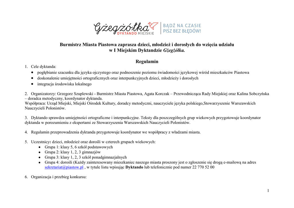 Burmistrz Miasta Piastowa zaprasza dzieci, młodzież i dorosłych do wzięcia udziału w I Miejskim Dyktandzie Gżegżółka. Regulamin 1. Cele dyktanda: pogłębianie szacunku dla języka ojczystego oraz podnoszenie poziomu świadomości językowej wśród mieszkańców Piastowa doskonalenie umiejętności ortograficznych oraz interpunkcyjnych dzieci, młodzieży i dorosłych integracja środowiska lokalnego 2. Organizatorzy: Grzegorz Szuplewski - Burmistrz Miasta Piastowa, Agata Korczak – Przewodnicząca Rady Miejskiej oraz Kalina Sobczyńska – doradca metodyczny, koordynator dyktanda. Współpraca: Urząd Miejski, Miejski Ośrodek Kultury, doradcy metodyczni, nauczyciele języka polskiego,Stowarzyszenie Warszawskich Nauczycieli Polonistów. 3. Dyktando sprawdza umiejętności ortograficzne i interpunkcyjne. Teksty dla poszczególnych grup wiekowych przygotowuje koordynator dyktanda w porozumieniu z ekspertami ze Stowarzyszenia Warszawskich Nauczycieli Polonistów. 4. Regulamin przeprowadzenia dyktanda przygotowuje koordynator we współpracy z władzami miasta. 5. Uczestnicy: dzieci, młodzież oraz dorośli w czterech grupach wiekowych: Grupa 1: klasy 5, 6 szkół podstawowych Grupa 2: klasy 1, 2, 3 gimnazjów Grupa 3: klasy 1, 2, 3 szkół ponadgimnazjalnych Grupa 4: dorośli (Każdy zainteresowany mieszkaniec naszego miasta proszony jest o zgłoszenie się drogą e-mailową na adres [email protected] , w tytule listu wpisując Dyktando lub telefonicznie pod numer 22 770 52 00 6. Organizacja i przebieg konkursu: 1 TERMINY 21- 25 marca 2016 CZYNNOŚCI Przeprowadzenie eliminacji szkolnych (odpowiedzialni – przewodniczący zespołów humanistycznych.) Do 28 marca 2016 Przesłanie listy uczniów zakwalifikowanych do udziału w Miejskim Dyktandzie (5 osób ze szkoły) do koordynatora na adres: [email protected] (Wzór listy w załączeniu.) Przyjmowanie zgłoszeń dorosłych uczestników Dyktanda Miejskiego. 1 kwietnia 2016 (pt.) Przeprowadzenie Dyktanda Miejskiego dla uczniów: Miejsce: sala konferencyjna Ochotniczej Straży Pożarnej w Piastowie, ul. Warszawska 24 godz. 10.00 – uczestnicy ze szkół podstawowych godz. 11.00 – uczestnicy z gimnazjów godz. 12.00 – uczestnicy ze szkół ponadgimnazjalnych 3 kwietnia 2016 r. (niedz.) godz. 15.00 17 kwietnia 2016 (niedz.) godz. 13.00 Do 24 kwietnia 2016 Przeprowadzenie Dyktanda Miejskiego - uczestnicy dorośli Miejsce: sala konferencyjna Ochotniczej Straży Pożarnej w Piastowie, ul. Warszawska 24 Uroczyste ogłoszenie wyników Dyktanda Miejskiego GŻEGŻÓŁKA oraz wręczenie zwycięzcom nagród i dyplomów. Część artystyczna. Opublikowanie listy laureatów Dyktanda GŻEGŻÓŁKA na stronie internetowej miasta Piastowa. UWAGI Zadania konkursowe (dyktando lub test ortograficzno – interpunkcyjny) opracowuje przewodniczący zespołu polonistów we współpracy z nauczycielami języka polskiego. Prace uczniów są sprawdzane bezpośrednio po konkursie. Każdy zainteresowany mieszkaniec naszego miasta proszony jest o zgłoszenie się drogą emailowa na adres [email protected] , w tytule listu wpisując Dyktando lub telefonicznie pod numer 22 770 52 00 Na Dyktando Miejskie uczniowie przynoszą pisemną zgodę rodziców (wzór w załączeniu) na umieszczenie uzyskanego wyniku na stronie www.piastow.pl Prace uczniów są sprawdzane bezpośrednio po konkursie. Prace sprawdza komisja w składzie: Kalina Sobczyńska - doradca metodyczny języka polskiego oraz nauczyciele poloniści ze szkół piastowskich. Prace uczestników są sprawdzane bezpośrednio po konkursie. Prace sprawdza komisja w składzie: Kalina Sobczyńska - doradca metodyczny języka polskiego oraz nauczyciele poloniści ze szkół piastowskich. Organizatorzy zapraszają uczestników wraz z rodzinami i przyjaciółmi. 2 7. Nagrody: Zwycięzcy w poszczególnych grupach wiekowych otrzymają dyplomy oraz nagrody, ufundowane przez Burmistrza Miasta Piastowa i sponsorów, pozostali uczestnicy otrzymają dyplomy. 8. Informacje końcowe Uczestnik powinien mieć ze sobą 2 długopisy. Nie wolno pisać ołówkiem. Uczestnicy piszą literami pisanymi, nie używają korektora, mają wyłączone telefony komórkowe. Praca musi być czytelna. Prace będą kodowane. Każdą pracę sprawdza dwóch nauczycieli – członków komisji. Nauczyciele biorący udział w organizacji konkursu i w pracach komisji konkursowej otrzymają stosowne zaświadczenia. Jak przygotować się do dyktanda? 1. Słowniki ortograficzne z zasadami pisowni:: Edward Polański: Wielki słownik ortograficzny. Wydawnictwo Naukowe PWN. Warszawa 2003 (i wydania późniejsze). Edward Polański, Piotr Żmigrodzki: Słownik ortograficzny z zasadami pisowni i interpunkcji. Wydawnictwo Znak. Kraków 1999 (i wydania późniejsze). Redakcja naukowa prof. Andrzej Markowski: Ortograficzny słownik języka polskiego. Wydawnictwo Wilga. Warszawa 1999 (i wydania późniejsze). 2. Źródła internetowe: Wielki słownik ortograficzny. Wydawnictwo Naukowe PWN. Adres strony: so.pwn.pl Rada Języka Polskiego, zakładka: Uchwały ortograficzne. Adres strony: www.rjp.pan.pl Informacji udzielają: Kalina Sobczyńska – [email protected]; tel. 785249940 3