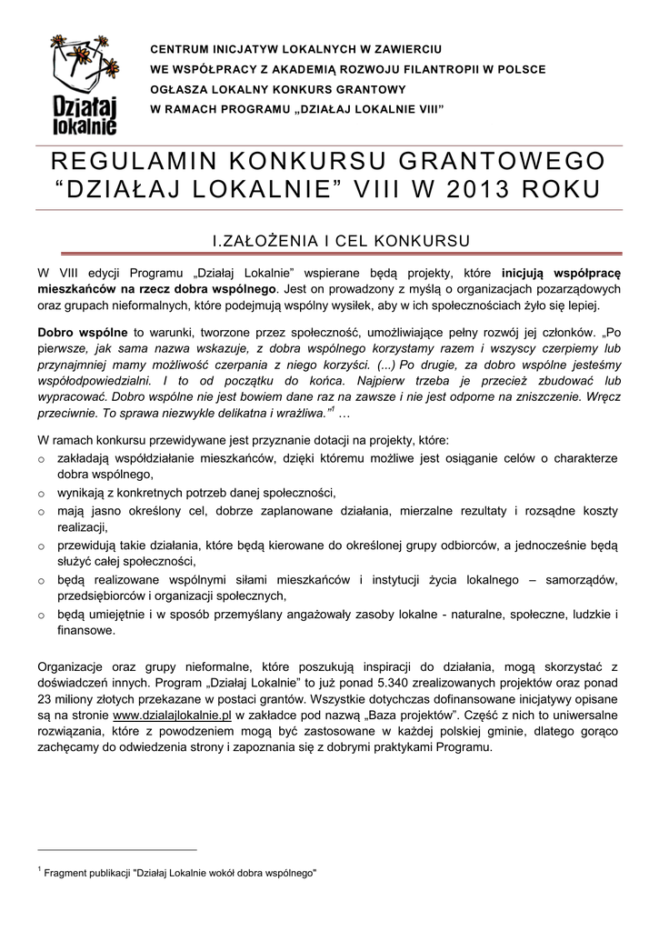 CENTRUM INICJATYW LOKALNYCH W ZAWIERCIU WE WSPÓŁPRACY Z AKADEMIĄ ROZWOJU FILANTROPII W POLSCE 1. OGŁASZA LOKALNY KONKURS GRANTOWY W RAMACH PROGRAMU „DZIAŁAJ LOKALNIE VIII” POLSKO-AMERYKAŃSKIEJ FUNDACJI WOLNOŚCI REGULAMIN KONKURSU GRANTOWEGO “DZIAŁAJ LOKALNIE” VIII W 2013 ROKU I.ZAŁOŻENIA I CEL KONK URSU W VIII edycji Programu „Działaj Lokalnie” wspierane będą projekty, które inicjują współpracę mieszkańców na rzecz dobra wspólnego. Jest on prowadzony z myślą o organizacjach pozarządowych oraz grupach nieformalnych, które podejmują wspólny wysiłek, aby w ich społecznościach żyło się lepiej. Dobro wspólne to warunki, tworzone przez społeczność, umożliwiające pełny rozwój jej członków. „Po pierwsze, jak sama nazwa wskazuje, z dobra wspólnego korzystamy razem i wszyscy czerpiemy lub przynajmniej mamy możliwość czerpania z niego korzyści. (...) Po drugie, za dobro wspólne jesteśmy współodpowiedzialni. I to od początku do końca. Najpierw trzeba je przecież zbudować lub wypracować. Dobro wspólne nie jest bowiem dane raz na zawsze i nie jest odporne na zniszczenie. Wręcz przeciwnie. To sprawa niezwykle delikatna i wrażliwa.”1 … W ramach konkursu przewidywane jest przyznanie dotacji na projekty, które: o zakładają współdziałanie mieszkańców, dzięki któremu możliwe jest osiąganie celów o charakterze dobra wspólnego, o wynikają z konkretnych potrzeb danej społeczności, o mają jasno określony cel, dobrze zaplanowane działania, mierzalne rezultaty i rozsądne koszty realizacji, o przewidują takie działania, które będą kierowane do określonej grupy odbiorców, a jednocześnie będą służyć całej społeczności, o będą realizowane wspólnymi siłami mieszkańców i instytucji życia lokalnego – samorządów, przedsiębiorców i organizacji społecznych, o będą umiejętnie i w sposób przemyślany angażowały zasoby lokalne - naturalne, społeczne, ludzkie i finansowe. Organizacje oraz grupy nieformalne, które poszukują inspiracji do działania, mogą skorzystać z doświadczeń innych. Program „Działaj Lokalnie” to już ponad 5.340 zrealizowanych projektów oraz ponad 23 miliony złotych przekazane w postaci grantów. Wszystkie dotychczas dofinansowane inicjatywy opisane są na stronie www.dzialajlokalnie.pl w zakładce pod nazwą „Baza projektów”. Część z nich to uniwersalne rozwiązania, które z powodzeniem mogą być zastosowane w każdej polskiej gminie, dlatego gorąco zachęcamy do odwiedzenia strony i zapoznania się z dobrymi praktykami Programu. 1 Fragment publikacji "Działaj Lokalnie wokół dobra wspólnego" II. KTO MOŻE UBIEGAĆ SIĘ O DOTACJE? Program adresowany jest do: o organizacji pozarządowych posiadających osobowość prawną (tj. fundacji, stowarzyszeń, oddziałów Caritas zarejestrowanych w KRS lub klubów sportowych zarejestrowanych w ewidencji Starosty Powiatowego), z wyłączeniem fundacji skarbu państwa i ich oddziałów, spółdzielni socjalnych i mieszkaniowych, stowarzyszeń samorządów lokalnych, Lokalnych Grup Działania i Lokalnych Grup Rybackich, Lokalnych Organizacji Turystycznych (działających na podstawie Ustawy z dnia 25 czerwca 1999 r. o Polskiej Organizacji Turystycznej i w oparciu o ustawę prawo o stowarzyszeniach, zgodnie z Art. 4. ustawy o POT) oraz związków stowarzyszeń. Do konkursu nie mogą aplikować organizacje w likwidacji. o grup nieformalnych (w tym także oddziałów terenowych organizacji nieposiadających osobowości prawnej), w których imieniu wniosek złoży organizacja pozarządowa (jak wyżej) lub jedna z następujących instytucji publicznych: przedszkole publiczne, szkoła publiczna, instytucja kultury, biblioteka publiczna, ośrodek pomocy społecznej, jednostki samorządu terytorialnego2, Lokalne Grupy Działania, Lokalne Grupy Rybackie i Lokalne Organizacje Turystyczne (do decyzji ODL). Instytucje te muszą posiadać osobowość prawną lub dysponować stosownym pełnomocnictwem od organu, któremu podlegają, do reprezentowania go w zakresie umożliwiającym przeprowadzenie planowanych działań, podpisanie umowy oraz rozliczenie projektu. o grup nieformalnych, występujących z wnioskiem samodzielnie, jako tzw. Inicjatywa DL (definicja w części VII pkt.3) Do konkursu można składać nieograniczoną liczbę wniosków (zarówno przez wnioskodawców3, jak i realizatorów4), jednak jeden realizator będzie mógł dostać dofinansowanie na realizację najwyżej jednego projektu. W konkursie mogą wziąć udział te organizacje i instytucje oraz grupy, które: o mają siedzibę w gminach: powiatu zawierciańskiego, o planują prowadzić działania na terenie jednej z wymienionych gmin. 2 Jeżeli nie wspierają finansowo konkursu „Działaj Lokalnie” 3 organizacja lub instytucja posiadająca osobowość prawną, aplikująca w imieniu grupy nieformalnej, lub w imieniu własnym grupa nieformalna, nieposiadająca osobowości prawnej, która będzie realizować projekt 4 regulamin lokalnego konkursu grantowego w 2013 r., strona 2 z 12 III. JAKIEGO RODZAJU KOSZTY MOGĄ BYĆ FINANSOWANE Z GRANTU „DZIAŁAJ LOKALNIE”? Z otrzymanego grantu można finansować koszty służące osiągnięciu zakładanych we wniosku celów, między innymi: o o o o o zakup materiałów biurowych, artykułów plastycznych i innych materiałów, np. do zajęć i warsztatów, koszty koordynacji i zarządzania projektem, zakup elementów wyposażenia, koszty podróży krajowych, wynagrodzenia specjalistów, honoraria, wynajem sal, sprzętu, nagłośnienia, transportu, o koszty druku, o zakup sprzętu, jeżeli jest to merytorycznie uzasadnione. Z otrzymanego grantu nie można finansować: o o udzielania pożyczek, przedsięwzięć, które zostały już zrealizowane, o celów religijnych i politycznych oraz uprawiania kultu religijnego, o o działań ściśle sportowych, jeśli nie prowadzą one do aktywizacji społeczności i dł