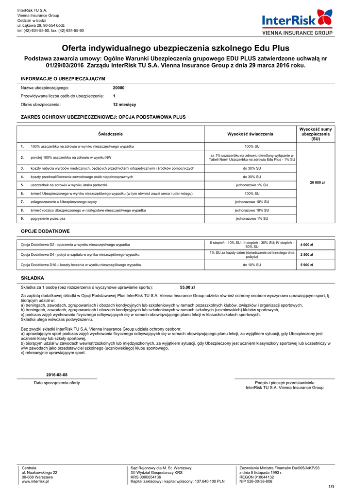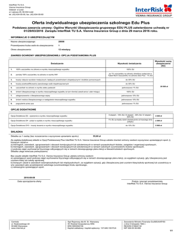 InterRisk TU S.A. Vienna Insurance Group Oddział w Łodzi ul. Łąkowa 29, 90-554 Łódź tel. (42) 634-55-50, fax. (42) 634-55-60 Oferta indywidualnego ubezpieczenia szkolnego Edu Plus Podstawa zawarcia umowy: Ogólne Warunki Ubezpieczenia grupowego EDU PLUS zatwierdzone uchwałą nr 01/29/03/2016 Zarządu InterRisk TU S.A. Vienna Insurance Group z dnia 29 marca 2016 roku. INFORMACJE O UBEZPIECZAJĄCYM Nazwa ubezpieczającego: 20000 Przewidywana liczba osób do ubezpieczenia: 1 Okres ubezpieczenia: 12 miesięcy ZAKRES OCHRONY UBEZPIECZENIOWEJ: OPCJA PODSTAWOWA PLUS Świadczenie Wysokość świadczenia Wysokość sumy ubezpieczenia (SU) 100% SU 1. 100% uszczerbku na zdrowiu w wyniku nieszczęśliwego wypadku 2. poniżej 100% uszczerbku na zdrowiu w wyniku NW 3. koszty nabycia wyrobów medycznych, będących przedmiotami ortopedycznymi i środków pomocniczych 4. koszty przekwalifikowania zawodowego osób niepełnosprawnych 5. uszczerbek na zdrowiu w wyniku ataku padaczki 6. śmierć Ubezpieczonego w wyniku nieszczęśliwego wypadku (w tym również zawał serca i udar mózgu) 7. zdiagnozowanie u Ubezpieczonego sepsy jednorazowo 10% SU 8. śmierć rodzica Ubezpieczonego w następstwie nieszczęśliwego wypadku jednorazowo 10% SU 9. pogryzienie przez psa jednorazowo 1% SU za 1% uszczerbku na zdrowiu określony wyłącznie w Tabeli Norm Uszczerbku na zdrowiu Edu Plus - 1% SU do 30% SU do 30% SU jednorazowo 1% SU 20 000 zł 100% SU OPCJE DODATKOWE Opcja Dodatkowa D2 - oparzenia w wyniku nieszczęśliwego wypadku II stopień - 10% SU; III stopień - 30% SU; IV stopień 50% SU 4 000 zł Opcja Dodatkowa D4 - pobyt w szpitalu w wyniku nieszczęśliwego wypadku 1% SU za każdy dzień (świadczenie od trzeciego dnia pobytu) 2 500 zł Opcja Dodatkowa D10 – koszty leczenia w wyniku nieszczęśliwego wypadku do 10% SU 5 900 zł SKŁADKA Składka za 1 osobę (bez rozszerzenia o wyczynowe uprawianie sportu): 55,00 zł Za zapłatą dodatkowej składki w Opcji Podstawowej Plus InterRisk TU S.A. Vienna Insurance Group udziela również ochrony osobom wyczynowo uprawiającym sport, tj. biorącym udział w: a) treningach, zawodach, zgrupowaniach i obozach kondycyjnych lub szkoleniowych w ramach pozaszkolnych klubów, związków i organizacji sportowych, b) treningach, zawodach, zgrupowaniach i obozach kondycyjnych lub szkoleniowych w ramach szkolnych (uczniowskich) klubów sportowych, c) podczas zajęć wychowania fizycznego odbywających się w ramach obowiązującego planu lekcji w klasach/szkołach sportowych. Składka ulega wówczas podwyższeniu. Bez zwyżki składki InterRisk TU S.A. Vienna Insurance Group udziela ochrony osobom: a) uprawiającym sport podczas zajęć wychowania fizycznego odbywających się w ramach obowiązującego planu lekcji, za wyjątkiem sytuacji, gdy Ubezpieczony jest uczniem klasy lub szkoły sportowej, b) biorącym udział w zawodach wewnątrzszkolnych lub międzyszkolnych, za wyjątkiem sytuacji, gdy Ubezpieczony jest uczniem klasy/szkoły sportowej lub uczestniczy w w/w zawodach jako przedstawiciel szkolnego (uczniowskiego) klubu sportowego, c) rekreacyjnie uprawiającym sport. 2016-08-08 Data sporządzenia oferty Centrala ul. Noakowskiego 22 00-668 Warszawa www.interrisk.pl Podpis i pieczęć przedstawiciela InterRisk TU S.A. Vienna Insurance Group Sąd Rejonowy dla M. St. Warszawy XII Wydział Gospodarczy KRS KRS 0000054136 Kapitał zakładowy i kapitał wpłacony: 137.640.100 PLN Zezwolenie Ministra Finansów Du/905/A/KP/93 z dnia 5 listopada 1993 r. REGON 010644132 NIP 526-00-38-806 1/1