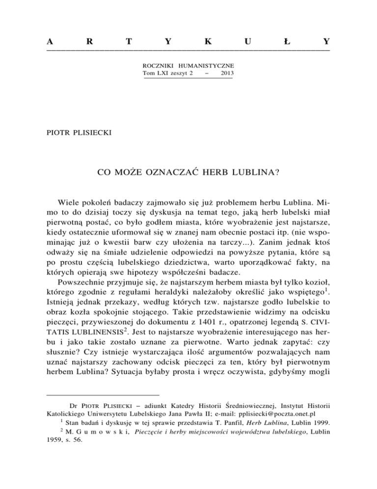 A R T Y K U Y ___________________________________________________________ ROCZNIKI HUMANISTYCZNE Tom LXI zeszyt 2 2013 PIOTR PLISIECKI CO MOZE OZNACZAĆ HERB LUBLINA? Wiele pokoleń badaczy zajmowao sie juz problemem herbu Lublina. Mimo to do dzisiaj toczy sie dyskusja na temat tego, jaka herb lubelski mia pierwotna postać, co byo godem miasta, które wyobrazenie jest najstarsze, kiedy ostatecznie uformowa sie w znanej nam obecnie postaci itp. (nie wspominajac juz o kwestii barw czy uozenia na tarczy...). Zanim jednak ktoś odwazy sie na śmiae udzielenie odpowiedzi na powyzsze pytania, które sa po prostu cześcia lubelskiego dziedzictwa, warto uporzadkować fakty, na których opieraja swe hipotezy wspócześni badacze. Powszechnie przyjmuje sie, ze najstarszym herbem miasta by tylko kozio, którego zgodnie z reguami heraldyki nalezaoby określić jako wspietego1. Istnieja jednak przekazy, wedug których tzw. najstarsze godo lubelskie to obraz koza spokojnie stojacego. Takie przedstawienie widzimy na odcisku pieczeci, przywieszonej do dokumentu z 1401 r., opatrzonej legenda S. CIVI nas herTATIS LUBLINENSIS2. Jest to najstarsze wyobrazenie interesujacego bu i jako takie zostao uznane za pierwotne. Warto jednak zapytać: czy susznie? Czy istnieje wystarczajaca ilość argumentów pozwalajacych nam uznać najstarszy zachowany odcisk pieczeci za ten, który by pierwotnym herbem Lublina? Sytuacja byaby prosta i wrecz oczywista, gdybyśmy mogli Dr PIOTR PLISIECKI adiunkt Katedry Historii Średniowiecznej, Instytut Historii Katolickiego Uniwersytetu Lubelskiego Jana Pawa II; e-mail: [email protected] 1 Stan badań i dyskusje w tej sprawie przedstawia T. Panfil, Herb Lublina, Lublin 1999. 2 M. G u m o w s k i, Pieczecie i herby miejscowości województwa lubelskiego, Lublin 1959, s. 56. PIOTR PLISIECKI 14 udowodnić, ze od momentu, gdy pojawia sie obecnie znane wyobrazenie herbu miasta, czyli kozio skaczacy na krzak winnej latorośli, herb przedstawiajacy samego koza, jako juz nieaktualny, znika ze źróde. Tak jednak nie jest. Spójrzmy wobec tego na zachowane do końca XVIII wieku odciski lubelskich pieczeci. Na podstawie ustaleń M. Gumowskiego, jednego z najlepszych specjalistów w kwestii sfragistyki, w opracowaniu specjalnie poświeconym pieczeciom ziemi lubelskiej, wspomniany badacz wymienia i opisuje dwanaście odcisków pieczeci zwiazanych z Lublinem, funkcjonujacych miedzy rokiem 1401 a 1783, oraz cztery superexlibrisy wyciśniete na oprawach ksiag miejskich z lat 1617-1699. W rezultacie posiadamy szesnaście wyobrazeń herbu Lublina z okresu staropolskiego3. Jednak trzeba zauwazyć, ze godo lubelskiego herbu nie zawsze jest tu identyczne. Najprościej mozna owe wyobrazenia podzielić na dwie grupy. Do grupy pierwszej zaliczymy te, które przedstawiaja sama postać koza (bez winorośli), zaś do drugiej te, na których kozio wystepuje przy krzewie, zazwyczaj odczytywanym jako winna latorośl. Stad tez w grupie pierwszej znajdzie sie wspomniany juz wcześniej, najstarszy zachowany odcisk pieczeci z 1401 r. (powtórzony prawdopodobnie jeszcze w 1416 r.), odcisk pieczeci sygnetowej z 1536 r. z napisem SPL (Senatus Populusque Lublinensis?), odcisk pieczeci z 1575 r. z legenda S+SCABINORUM+CIVI+LUBLINENS oraz trzy odciski pieczeci z XVIII wieku4. Sa to: odcisk z 1767 r. (data pierwszego znanego nam uzycia) przedstawiajacy poowe koza z legenda SIGILLUM ADVOCATIALE SCABINALE S.R.M LUBLINENSIS, odcisk z 1772 r. (data uzycia) z napisem SIGILLUM PROCONSUL. CIVITAT. SACRAE REGIAE MAIESTA LUBLIN, i pieczeć uzyta w 1782 r. z legenda SIGILLUM PROCONSULI CIVITAT. SACR. REGIE. MAYEST. LUBLIN5. Istnieje jeszcze jeden odcisk pieczeci, z roku 1777, jednak jako godo, wedug M. Gumowskiego, nosi wizerunek jakby gowy barana a nie koza6. Jak wynika z powyzszego zestawienia, na sześć pieczeci (wizerunek gowy barana (?) traktujemy jako siódmy) dwie z nich, najmodsze: z 1772 r. i 1782 r., byy pieczeciami burmistrza, jedna nalezaa do wójta (z 1767 r.), jedna do awy (z 1575 r.), zaś wasność dwóch najstarszych jest trudna do precyzyjnego określenia. W przypadku pieczeci z 1536 r. legenda wskazywaaby na rade miasta, jednak sygnetowy tok sugeruje raczej wasność bur3 Tamze, s. 56-60. Przegladu zachowanych wyobrazeń herbu Lublina dokonuje takze Panfil, Herb Lublina, s. 32-36. 4 G u m o w s k i, Pieczecie i herby, s. 56-58. 5 Tamze, s. 57-58. 6 Tamze, s. 58. CO MOZE OZNACZAĆ HERB LUBLINA? 15 mistrza. Z kolei najstarsza pieczeć zostaa jedynie określona jako pieczeć spoeczności miejskiej (sigillum civitatis). Widać wiec wyraźnie, ze az do końca XVIII wieku w Lublinie funkcjonowaa pieczeć przedstawiajaca samego koza bez krzaku winnej latorośli i moga być uzywana zarówno przez burmistrza (dwa toki i być moze trzeci), awe (jeden przypadek), jak i wójta (jeden przypadek). Na uwage zasuguje takze swoisty „renesans” pieczeci z wyobrazeniem samego koza, gdyz na sześć takich przypadków trzy pochodza z drugiej poowy XVIII wieku. Pozostao nam jeszcze do omówienia pieć pieczeci z wyobrazeniem koza skaczacego na krzew winny. Najstarsza z nich jest pieczecia rady miejskiej, zostaa uzyta w 1535 r., zaś w legendzie posiada napis: SIGILLUM CONSULUM CIVITATIS REGIAE LUBLINEN7. Druga z tej grupy wystapia w 1605 r., na pieczeci znajdowaa sie legenda: SIGILLUM CONSULUM CIVITATIS REGIAE LUBLINENSIS. W 1693 r. uzyto podobnej pieczeci z legenda: SIGILLUM PROCONSULATUS CIVITATIS REGIAE MATIS LUBLINEN. Pozostae dwie pochodza juz z XVIII wieku. Pierwsza z legenda S.A.L (Sigillum Advocati Lublinensis?) zostaa odciśnieta w 1723 r., zaś nastepna w 1783 r. (i później takze) z napisem: SIGILLUM. PROCONSUL. CIVITAT. SACR. REGIAE MAYEST LUBLI [sic!]8. Zestawiajac zachowane odciski pieczeci przedstawiajace razem koza i krzak winorośli, trzeba zauwazyć, ze i tutaj napotykamy pewien kopot. Chociaz dwa najstarsze odciski z tej grupy zostay określone jako pieczeć Rady miejskiej (z 1535 r. i 1605 r.), to z pozosta