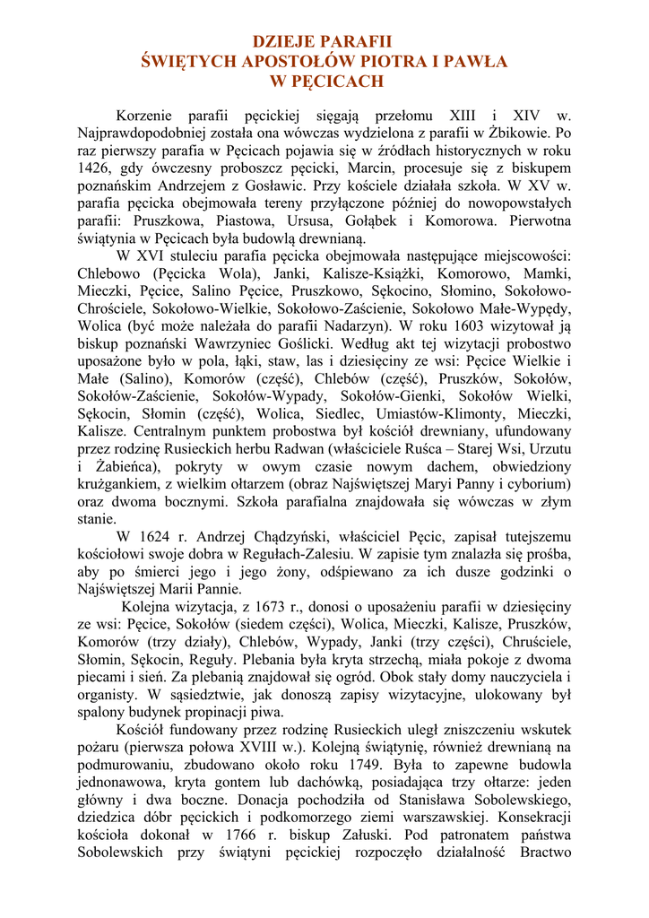 DZIEJE PARAFII ŚWIĘTYCH APOSTOŁÓW PIOTRA I PAWŁA W PĘCICACH Korzenie parafii pęcickiej sięgają przełomu XIII i XIV w. Najprawdopodobniej została ona wówczas wydzielona z parafii w Żbikowie. Po raz pierwszy parafia w Pęcicach pojawia się w źródłach historycznych w roku 1426, gdy ówczesny proboszcz pęcicki, Marcin, procesuje się z biskupem poznańskim Andrzejem z Gosławic. Przy kościele działała szkoła. W XV w. parafia pęcicka obejmowała tereny przyłączone później do nowopowstałych parafii: Pruszkowa, Piastowa, Ursusa, Gołąbek i Komorowa. Pierwotna świątynia w Pęcicach była budowlą drewnianą. W XVI stuleciu parafia pęcicka obejmowała następujące miejscowości: Chlebowo (Pęcicka Wola), Janki, Kalisze-Książki, Komorowo, Mamki, Mieczki, Pęcice, Salino Pęcice, Pruszkowo, Sękocino, Słomino, SokołowoChrościele, Sokołowo-Wielkie, Sokołowo-Zaścienie, Sokołowo Małe-Wypędy, Wolica (być może należała do parafii Nadarzyn). W roku 1603 wizytował ją biskup poznański Wawrzyniec Goślicki. Według akt tej wizytacji probostwo uposażone było w pola, łąki, staw, las i dziesięciny ze wsi: Pęcice Wielkie i Małe (Salino), Komorów (część), Chlebów (część), Pruszków, Sokołów, Sokołów-Zaścienie, Sokołów-Wypady, Sokołów-Gienki, Sokołów Wielki, Sękocin, Słomin (część), Wolica, Siedlec, Umiastów-Klimonty, Mieczki, Kalisze. Centralnym punktem probostwa był kościół drewniany, ufundowany przez rodzinę Rusieckich herbu Radwan (właściciele Ruśca – Starej Wsi, Urzutu i Żabieńca), pokryty w owym czasie nowym dachem, obwiedziony krużgankiem, z wielkim ołtarzem (obraz Najświętszej Maryi Panny i cyborium) oraz dwoma bocznymi. Szkoła parafialna znajdowała się wówczas w złym stanie. W 1624 r. Andrzej Chądzyński, właściciel Pęcic, zapisał tutejszemu kościołowi swoje dobra w Regułach-Zalesiu. W zapisie tym znalazła się prośba, aby po śmierci jego i jego żony, odśpiewano za ich dusze godzinki o Najświętszej Marii Pannie. Kolejna wizytacja, z 1673 r., donosi o uposażeniu parafii w dziesięciny ze wsi: Pęcice, Sokołów (siedem części), Wolica, Mieczki, Kalisze, Pruszków, Komorów (trzy działy), Chlebów, Wypady, Janki (trzy części), Chruściele, Słomin, Sękocin, Reguły. Plebania była kryta strzechą, miała pokoje z dwoma piecami i sień. Za plebanią znajdował się ogród. Obok stały domy nauczyciela i organisty. W sąsiedztwie, jak donoszą zapisy wizytacyjne, ulokowany był spalony budynek propinacji piwa. Kościół fundowany przez rodzinę Rusieckich uległ zniszczeniu wskutek pożaru (pierwsza połowa XVIII w.). Kolejną świątynię, również drewnianą na podmurowaniu, zbudowano około roku 1749. Była to zapewne budowla jednonawowa, kryta gontem lub dachówką, posiadająca trzy ołtarze: jeden główny i dwa boczne. Donacja pochodziła od Stanisława Sobolewskiego, dziedzica dóbr pęcickich i podkomorzego ziemi warszawskiej. Konsekracji kościoła dokonał w 1766 r. biskup Załuski. Pod patronatem państwa Sobolewskich przy świątyni pęcickiej rozpoczęło działalność Bractwo Różańcowe. Istniało ono w latach 1749-1923 (od 1999 r. przywrócono jego funkcjonowanie). Probostwo liczyło siedem dymów (1775 r.). W pierwszej połowie XIX w. stan świątyni w Pęcicach był nie najlepszy (istniało zagrożenie zawalenia się całej konstrukcji). Uznano, że nie nadaje się ona do remontu i zamknięto ją. Projekt nowej budowli opracował budowniczy rządowy Departamentu Warszawskiego – Jan Postawka. Po uwzględnieniu poprawek Karola Dollingera (budowniczy Komisji Województwa Mazowieckiego) projekt został zatwierdzony w maju 1825 r. przez Komisję Rządową Wyznań Religijnych i Oświecenia Publicznego. Obecny kościół parafialny wzniesiono w latach 1825-1832. Ufundowany został przez Antoniego Korwin-Bieńkowskiego, senatora Królestwa Polskiego oraz właściciela dóbr Pęcice. Parafia liczyła około 800 wiernych. Kościół pęcicki w r. 1883 gruntownie został wyrestaurowany kosztem parafian i ofiarą zamożnych obywateli, spośród których p. Jan Paweł Łuszczewski, Gustaw hr. Przeździecki z Falent i Józefowicz z Komorowa, prawdziwie dobroczyńcami jego nazywać się mogą. W 1885 r. świątynię otoczono murem, zbudowano bramę i furtę żelazną (wykonała to fabryka żelazna Rudnickiego i Kuczyńskiego w Pruszkowie). Konsekracji kościoła dokonał w dniu 5 lipca 1885 r. metropolita warszawski, arcybiskup Teofil Chościak-Popiel. W nowokonsekrowanym ołtarzu złożono relikwie św. Romana i św. Fortunata. Około 1883 r. parafia liczyła 1718 wiernych, w cztery lata później już 1869. Należałoby to powiązać z poszerzeniem granic parafii. Jesienią 1914 r., w czasie I wojny światowej, świątynia została bardzo poważnie uszkodzona. Oprócz zniszczenia murów (ściany od strony południowej i zachodniej), prawie całkowitemu zniszczeniu uległo wyposażenie wnętrza (ołtarze, ambona, konfesjonały i organy z roku 1863). Spalona została dzwonnica, zniszczeniu uległy cmentarz i plebania z 1875 r. Dopiero w latach 1921-1926, dzięki staraniom księdza Feliksa Reczyńskiego i ofiarności parafian, kościół został gruntownie odbudowany. W maju 1927 r. wizytacji kanonicznej parafii Pęcice dokonał metropolita warszawski, kardynał Aleksander Kakowski: Parafianie pęciccy w liczbie zaledwie 2500 dusz, będąc sami pozbawieni dachu nad głową i mając gospodarki swe obrócone w perzynę, wznoszą w ciągu kilkunastu miesięcy własnym wysiłkiem zabudowania kościelne, dzwonnicę, restaurują gruntownie świątynię, ołtarze, nabywają dzwony, aparaty liturgiczne, a w ostatnim czasie kupują piękne organy za 12 i pół tysiąca złotych. Po zakończeniu II wojny światowej przeprowadzono kolejny remont świątyni, m.in. zelektryfikowano wnętrze, otynkowano i pomalowano zewnętrzne mury, odnowiono ambonę oraz zakupiono dwa dzwony (poprzednie 