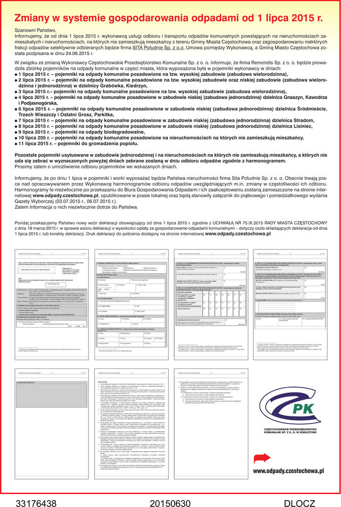 Zmiany w systemie gospodarowania odpadami od 1 lipca 2015 r. Szanowni Państwo, Informujemy, że od dnia 1 lipca 2015 r. wykonawcą usługi odbioru i transportu odpadów komunalnych powstających na nieruchomościach zamieszkałych i nieruchomościach, na których nie zamieszkują mieszkańcy z terenu Gminy Miasta Częstochowa oraz zagospodarowaniu niektórych frakcji odpadów selektywnie odbieranych będzie firma SITA Południe Sp. z o.o. Umowa pomiędzy Wykonawcą, a Gminą Miasto Częstochowa została podpisana w dniu 24.06.2015 r. W związku ze zmianą Wykonawcy Częstochowskie Przedsiębiorstwo Komunalne Sp. z o. o. informuje, że firma Remondis Sp. z o. o. będzie prowadziła zbiórkę pojemników na odpady komunalne w części miasta, która wyposażona była w pojemniki wykonawcy w dniach: • 1 lipca 2015 r. – pojemniki na odpady komunalne posadowione na tzw. wysokiej zabudowie (zabudowa wielorodzinna), • 2 lipca 2015 r. – pojemniki na odpady komunalne posadowione na tzw. wysokiej zabudowie oraz niskiej zabudowie (zabudowa wielorodzinna i jednorodzinna) w dzielnicy Grabówka, Kiedrzyn, • 3 lipca 2015 r.– pojemniki na odpady komunalne posadowione na tzw. wysokiej zabudowie (zabudowa wielorodzinna), • 4 lipca 2015 r. – pojemniki na odpady komunalne posadowione w zabudowie niskiej (zabudowa jednorodzinna) dzielnica Gnaszyn, Kawodrza i Podjasnogórska, • 6 lipca 2015 r. – pojemniki na odpady komunalne posadowione w zabudowie niskiej (zabudowa jednorodzinna) dzielnica Śródmieście, Trzech Wieszczy i Ostatni Grosz, Parkitka, • 7 lipca 2015 r. – pojemniki na odpady komunalne posadowione w zabudowie niskiej (zabudowa jednorodzinna) dzielnica Stradom, • 8 lipca 2015 r. – pojemniki na odpady komunalne posadowione w zabudowie niskiej (zabudowa jednorodzinna) dzielnica Lisiniec, • 9 lipca 2015 r. – pojemniki na odpady biodegradowalne, • 10 lipca 205 r. – pojemniki na odpady komunalne posadowione na nieruchomościach na których nie zamieszkują mieszkańcy, • 11 lipca 2015 r. – pojemniki do gromadzenia popiołu. Pozostałe pojemniki usytuowane w zabudowie jednorodzinnej i na nieruchomościach na których nie zamieszkują mieszkańcy, a których nie uda się zebrać w wyznaczonych powyżej dniach zebrane zostaną w dniu odbioru odpadów zgodnie z harmonogramem. Prosimy zatem o umożliwienie odbioru pojemników we wskazanych dniach. Informujemy, że po dniu 1 lipca w pojemniki i worki wyposażać będzie Państwa nieruchomości firma Sita Południe Sp. z o. o. Obecnie trwają prace nad opracowywaniem przez Wykonawcę harmonogramów odbioru odpadów uwzględniających m.in. zmiany w częstotliwości ich odbioru. Harmonogramy te niezwłocznie po przekazaniu do Biura Gospodarowania Odpadami i ich zaakceptowaniu zostaną zamieszczone na stronie internetowej www.odpady.czestochowa.pl, opublikowane w prasie lokalnej oraz będą stanowiły załącznik do piątkowego i poniedziałkowego wydania Gazety Wyborczej (03.07.2015 r., 06.07.2015 r.). Zatem Informacja o nich niezwłocznie dotrze do Państwa. Poniżej przekazujemy Państwu nowy wzór deklaracji obowiązujący od dnia 1 lipca 2015 r. zgodnie z UCHWAŁĄ NR 75.IX.2015 RADY MIASTA CZĘSTOCHOWY z dnia 19 marca 2015 r. w sprawie wzoru deklaracji o wysokości opłaty za gospodarowanie odpadami komunalnymi – dotyczy osób składających deklaracje od dnia 1 lipca 2015 r. lub korekty deklaracji. Druk deklaracji do pobrania dostępny na stronie internetowej www.odpady.czestochowa.pl www.odpady.czestochowa.pl 33176438 20150630 DLOCZ